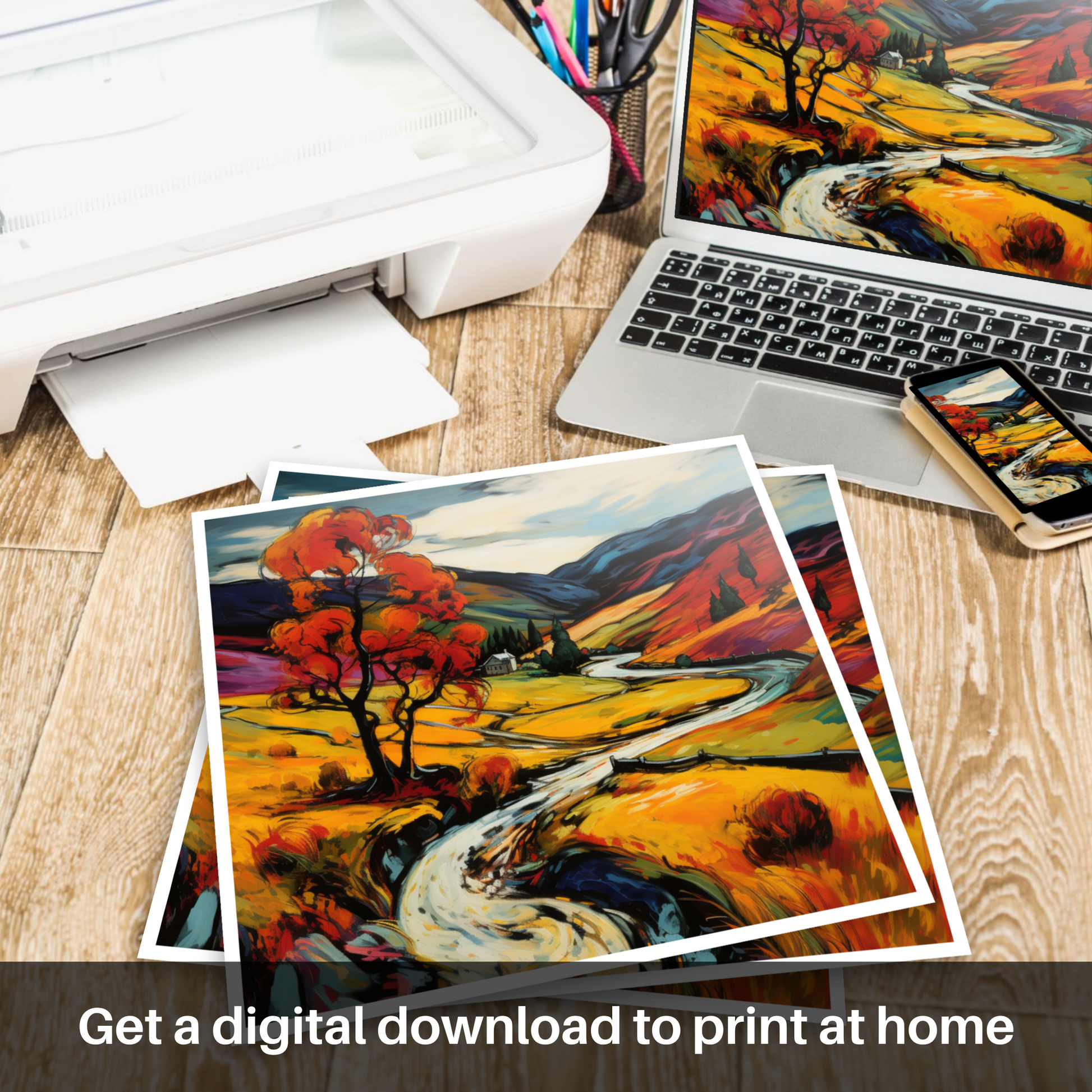 Step into a world where colour reigns supreme with this vibrant print celebrating the untamed beauty of Glen Feshie in the Scottish Highlands. Embracing the expressive and bold language of Fauvism, this piece invites the viewer to experience the glen through the eyes of an artist unbound by the constraints of realism.