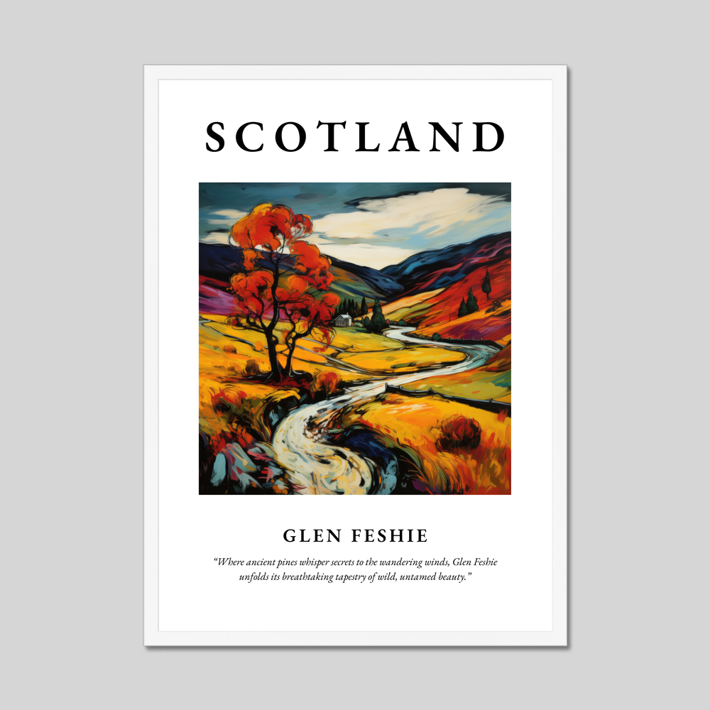 In bold, captivating lettering, “SCOTLAND” crowns the top of the poster, drawing immediate attention. Beneath, the Fauvist-inspired artwork bursts with vibrant hues—fiery reds and oranges juxtaposed against lush greens and deep blues, capturing the raw beauty and emotional intensity of Glen Feshie's landscape. Below the painting, the evocative quote, “Where ancient pines whisper secrets to the wandering winds, Glen Feshie unfolds its breathtaking tapestry of wild, untamed beauty,” adds a poetic touch that speaks to the heart of art lovers and admirers of Scotland alike.