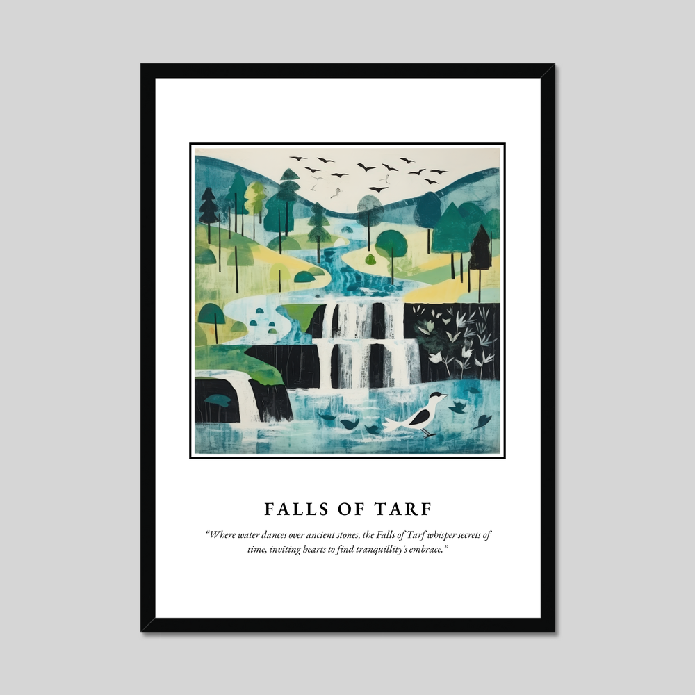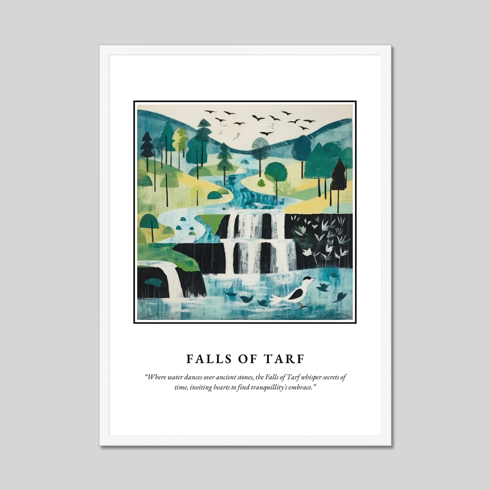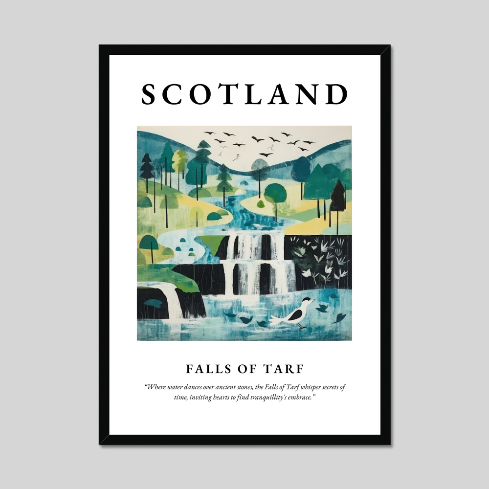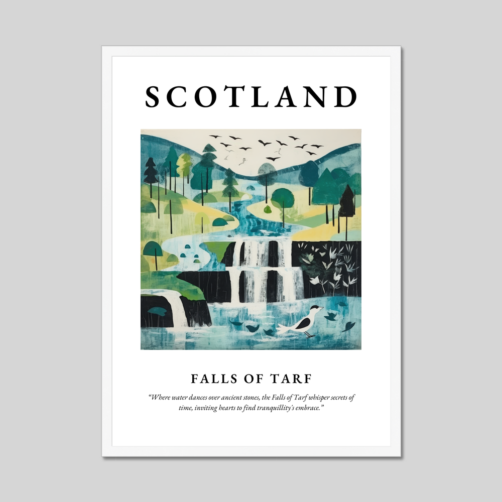 Complementing the visual, the thoughtful quote at the bottom invites viewers to lose themselves in tranquillity: “Where water dances over ancient stones, the Falls of Tarf whisper secrets of time, inviting hearts to find tranquillity's embrace.” This piece is perfect for anyone who loves art, has visited Scotland, or treasures a connection to this picturesque region.