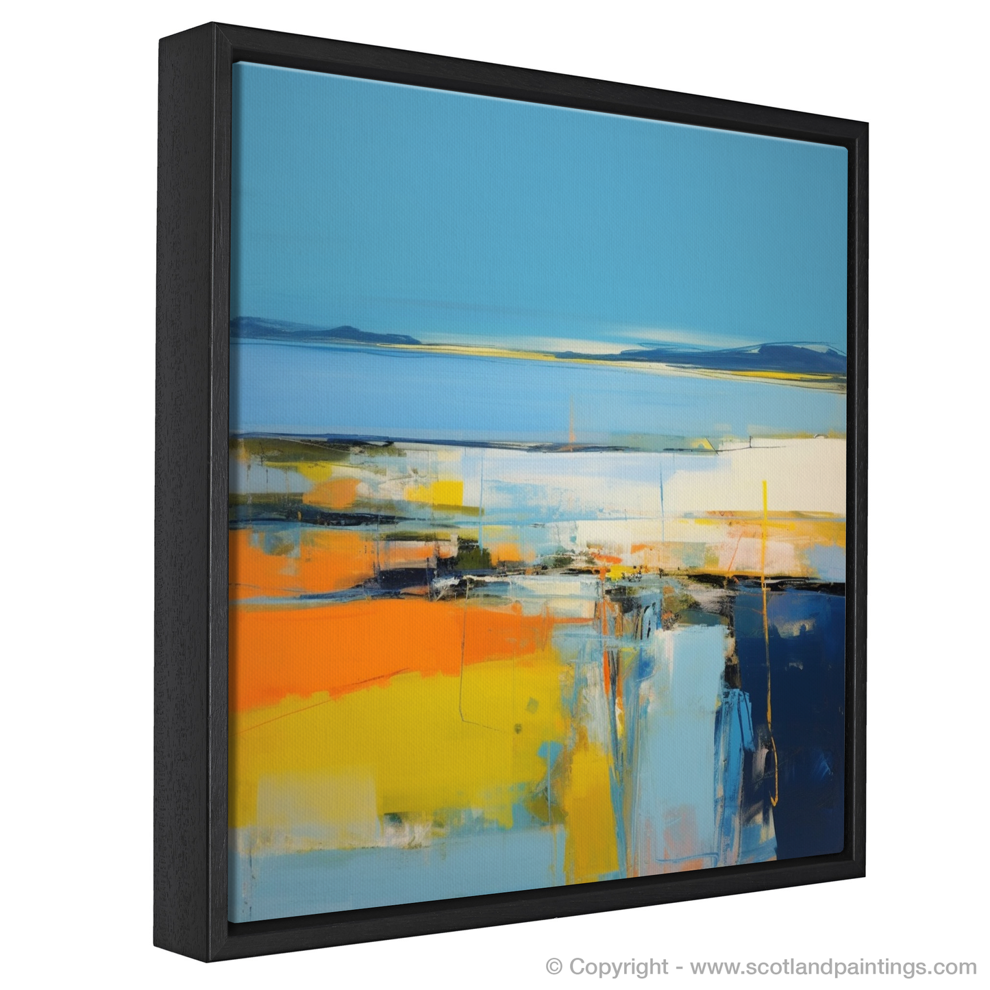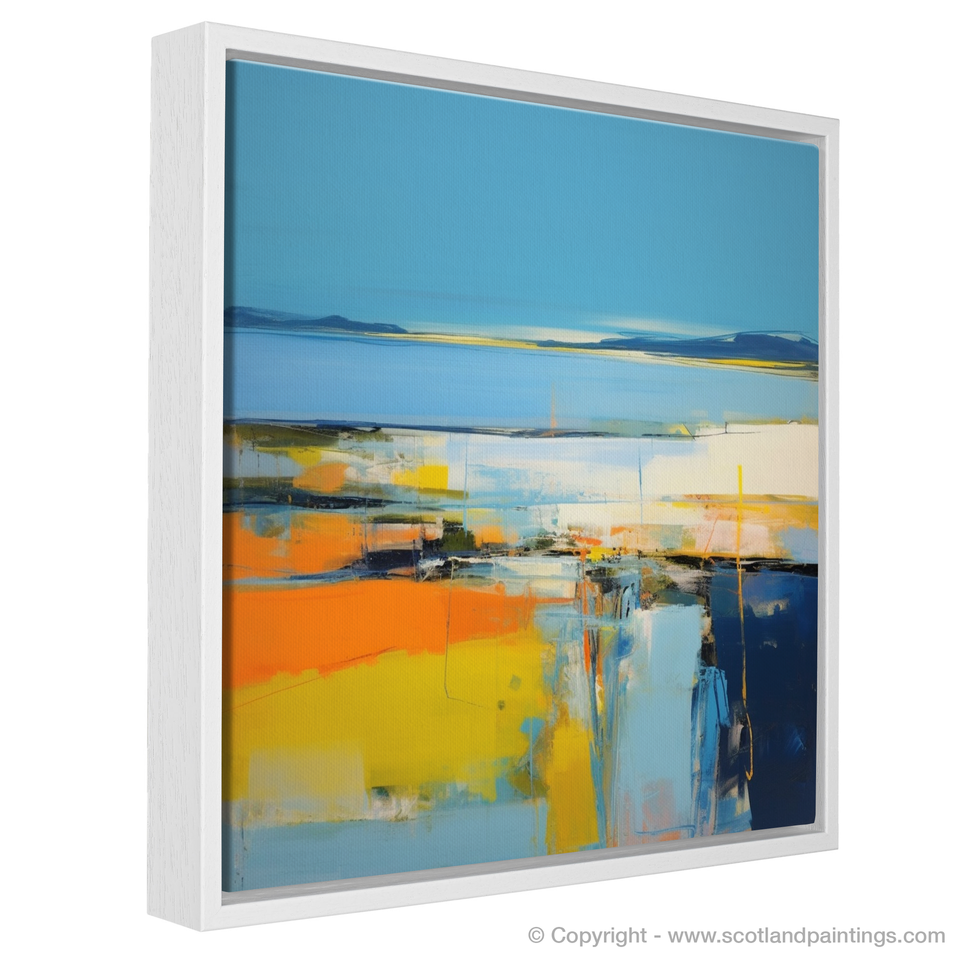 Adding contrast to the placid blues and whites, vibrant blocks of orange and golden yellow burst forth, reminiscent of the warmth of Scottish beach sands and setting suns. These saturated colours are juxtaposed with smudges and flecks of black and grey, signifying rocky outcrops and the rugged beauty found along the Fife coast.