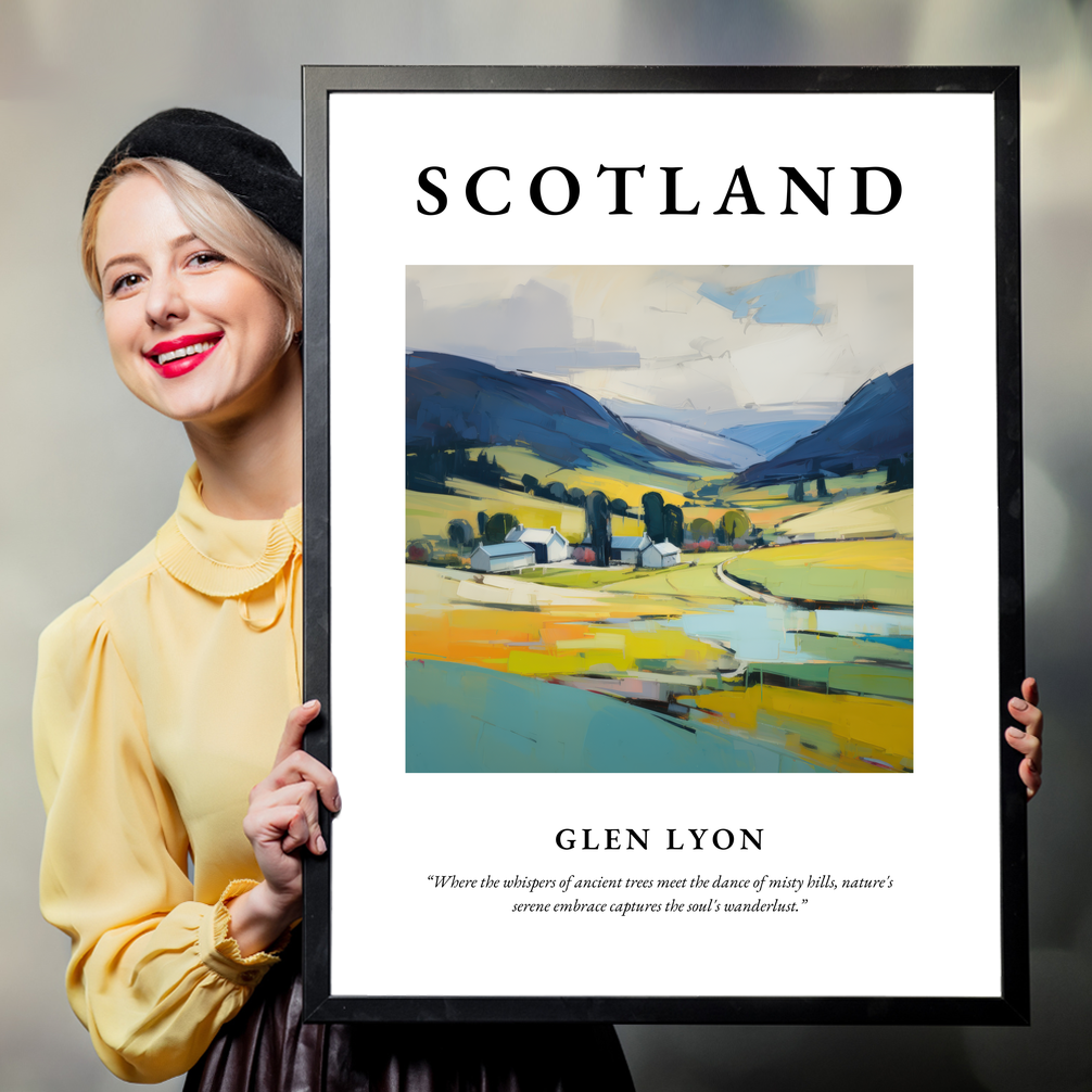The poster's contemporary style brings a modern touch to the timeless landscape of Glen Lyon. The bold "SCOTLAND" lettering at the top commands attention, drawing you into the immersive scene below. The painting exquisitely depicts Glen Lyon's serene landscape, with its layers of lush hills and the tranquil embrace of the valley. The artist’s use of vibrant colours and dynamic brushstrokes encapsulates the essence of nature’s rhythmic dance, offering both art aficionados and nature lovers a treasured glimpse into Scotland’s heart.