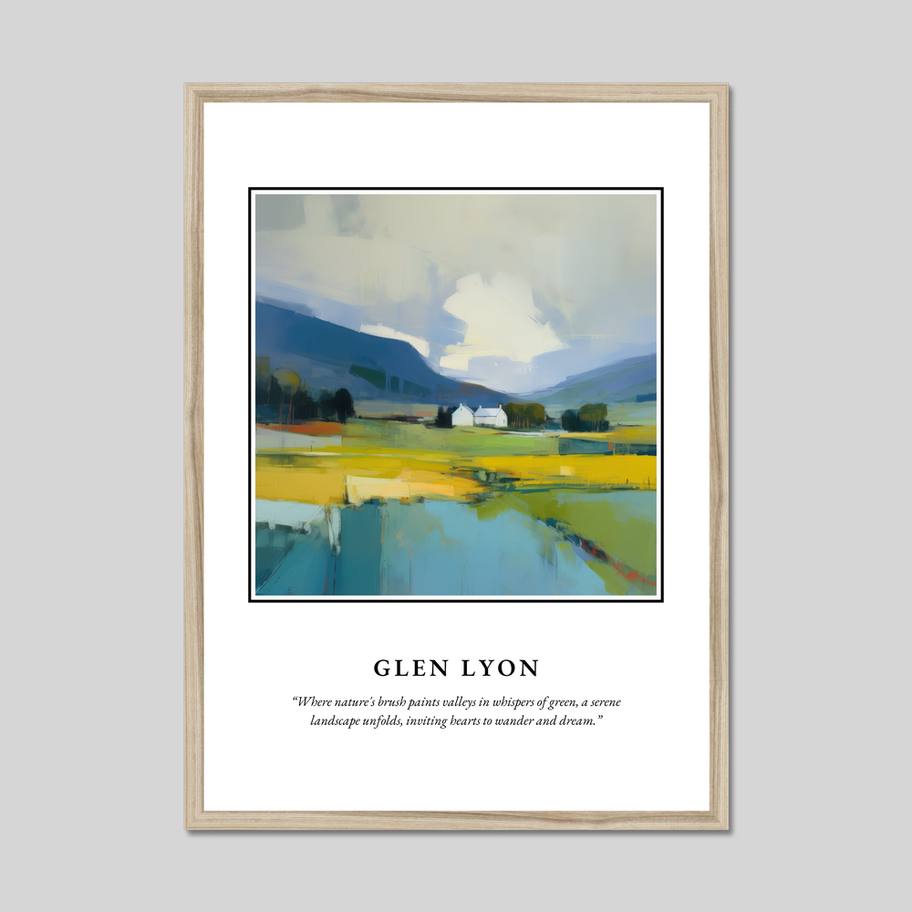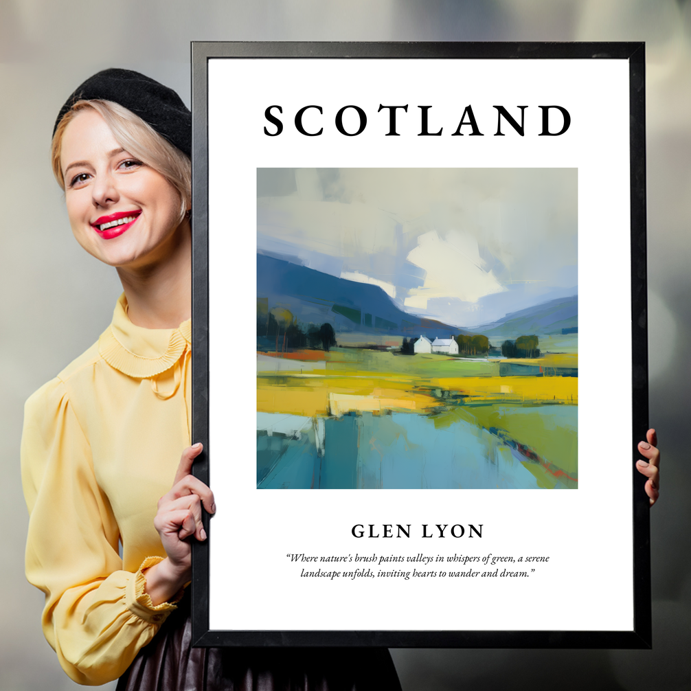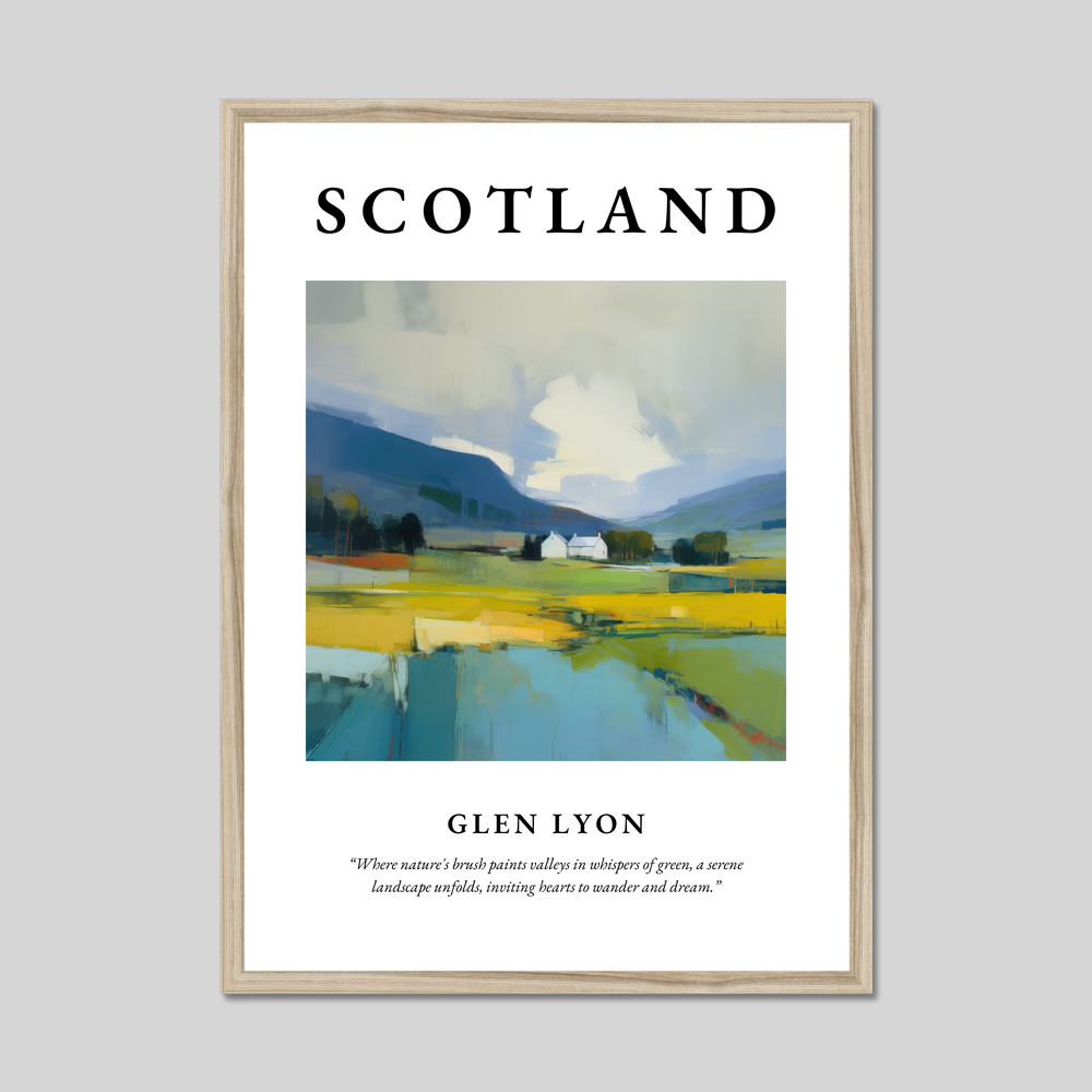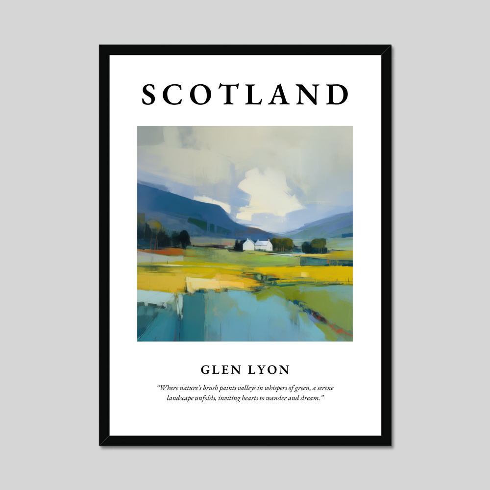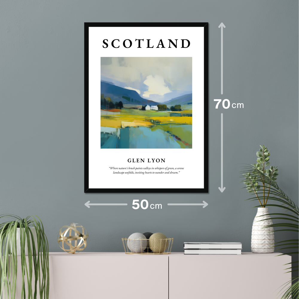 Transform your space with our exquisite framed poster print, capturing the timeless beauty of Glen Lyon, Scotland. Measuring a grand 50cm x 70cm, this striking piece features the word “SCOTLAND” in bold lettering at the top, immediately evoking a sense of pride and heritage. Below, a contemporary painting of Glen Lyon draws the eye with its rich and vibrant hues—where soft whispers of green paint the valleys and vibrant strokes suggest a landscape alive with movement.