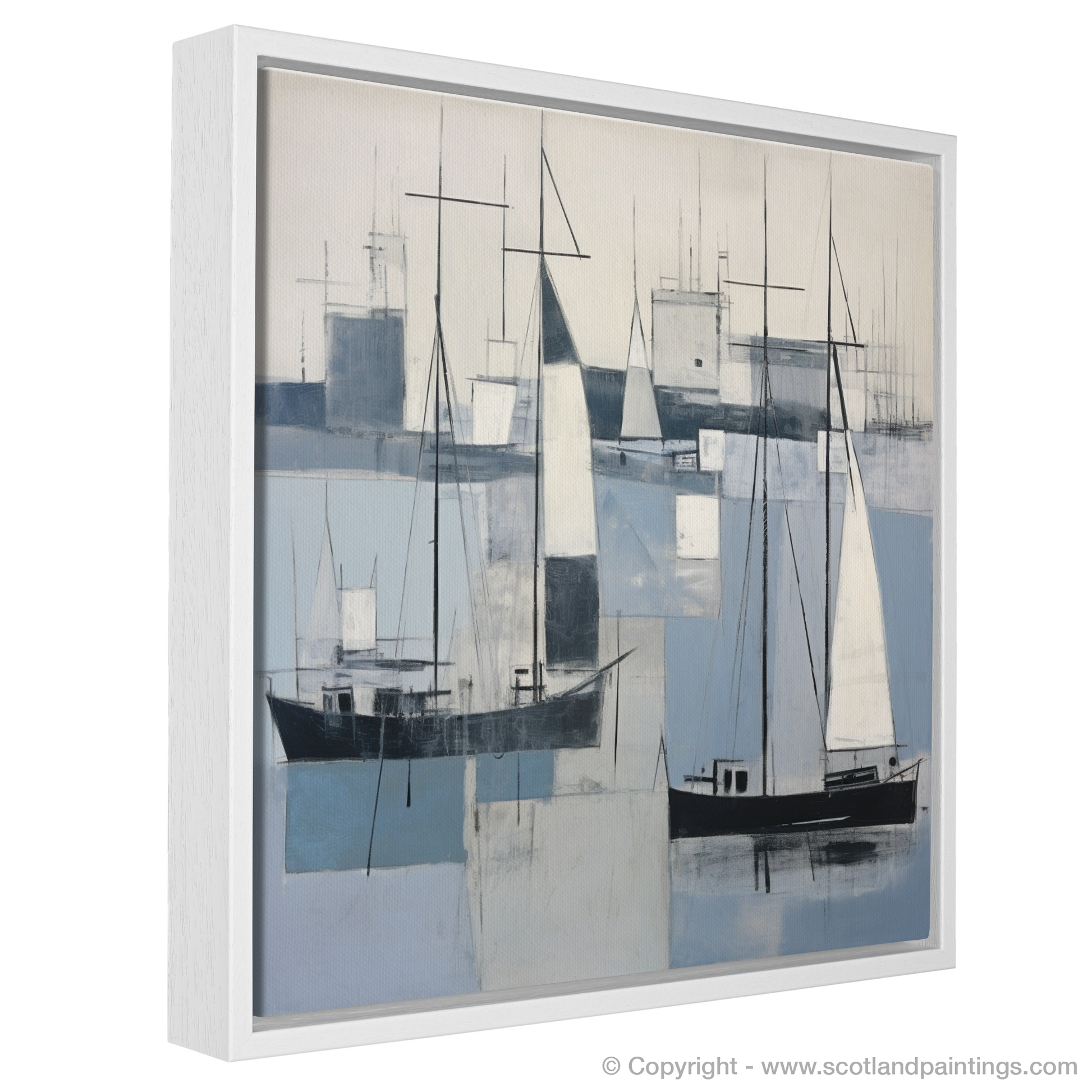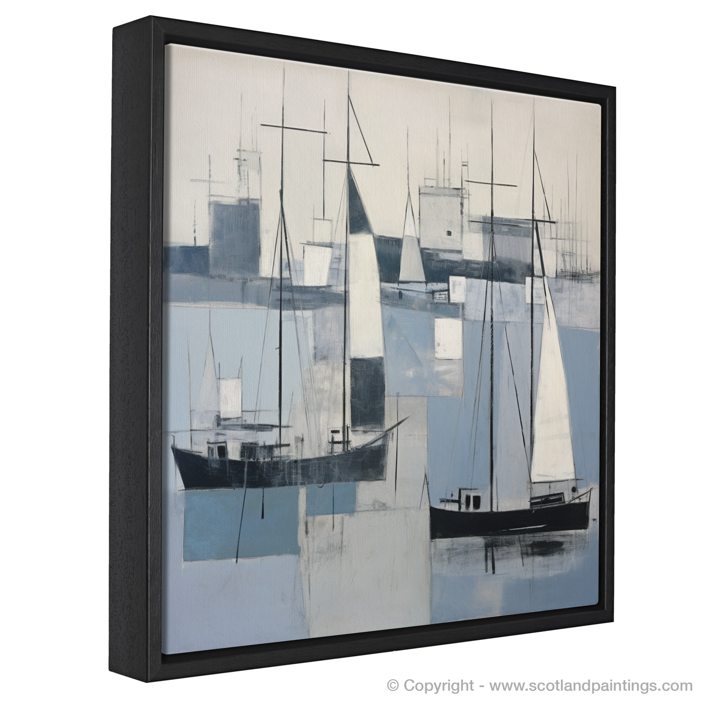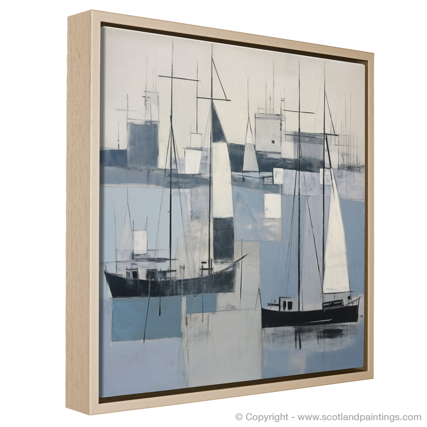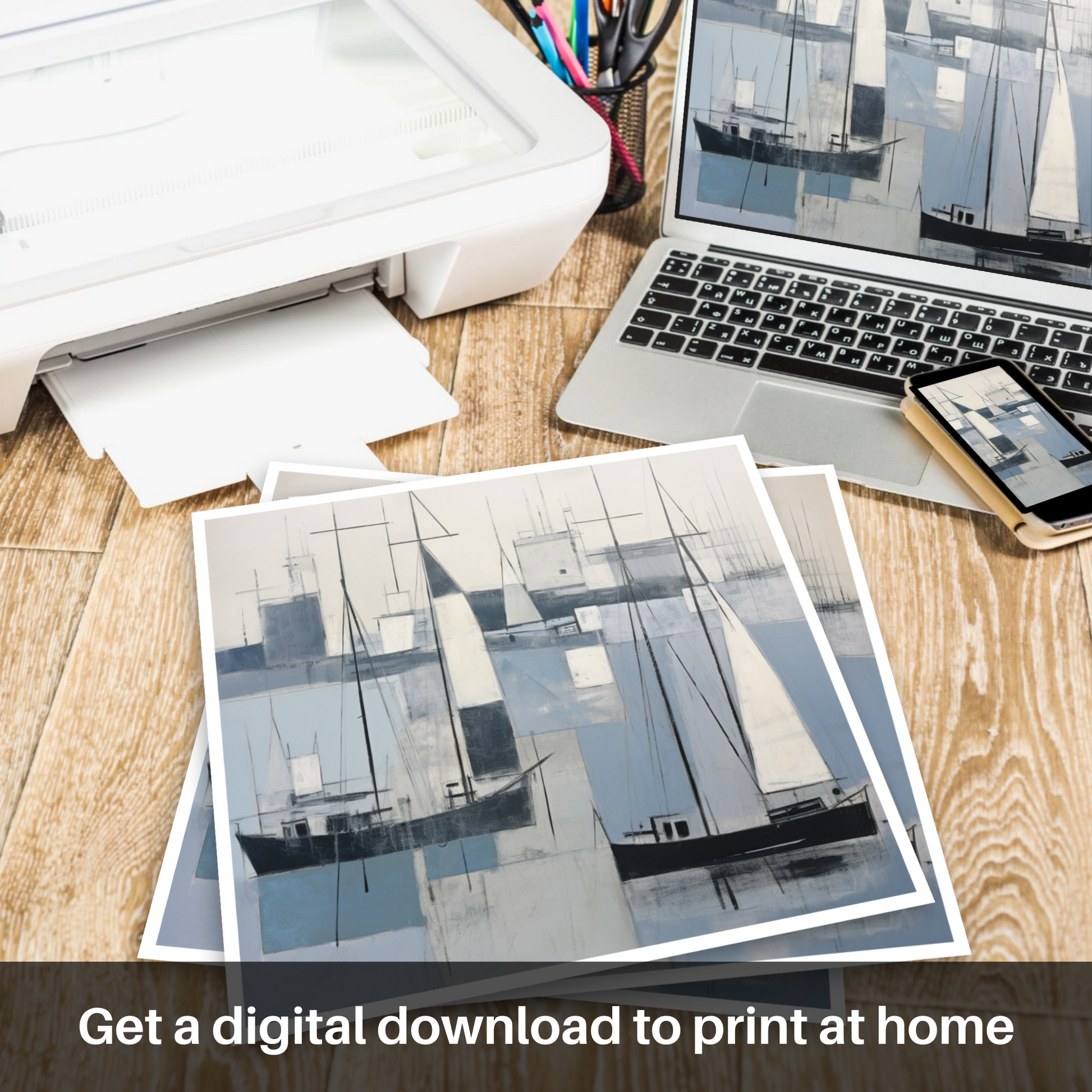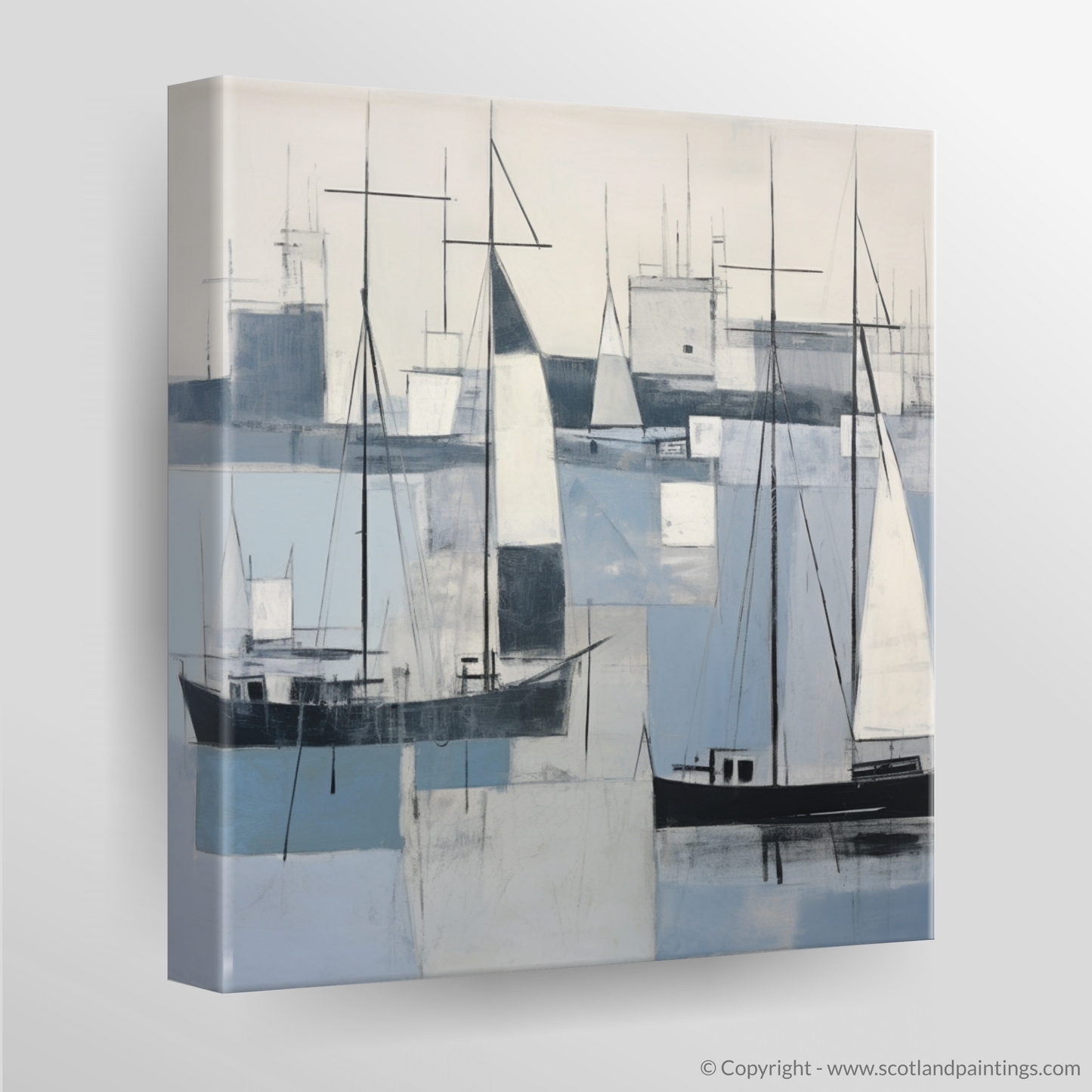 The composition is divided into geometric segments that reflect a tapestry of water, vessels, and sky. Stark, confident lines articulate the masts and rigging of the boats, lending a sense of quiet order and stability amidst the seascape. In this piece, the boats are presented with a stark elegance, their sails and hulls reduced to essential forms that whisper of calm seas and a gentle breeze.