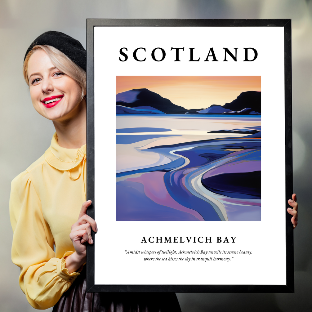 At the top, the bold lettering of “SCOTLAND” makes a striking statement, immediately capturing attention. Just below, indulge in the vivid hues and sweeping expanses of our exclusive “Color Field” styled painting of Achmelvich Bay. The artwork showcases a harmonious blend of soft blues and purples, capturing the essence of the sea and sky in perfect unity. Below this breathtaking portrayal, the thoughtful quote, “Amidst whispers of twilight, Achmelvich Bay unveils its serene beauty, where the sea kisses the sky in tranquil harmony,” enriches the narrative, inviting you to lose yourself in a moment of calm reflection.