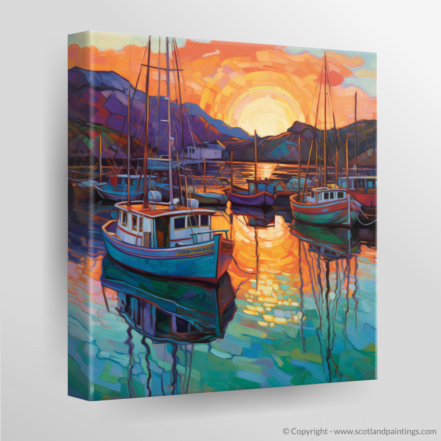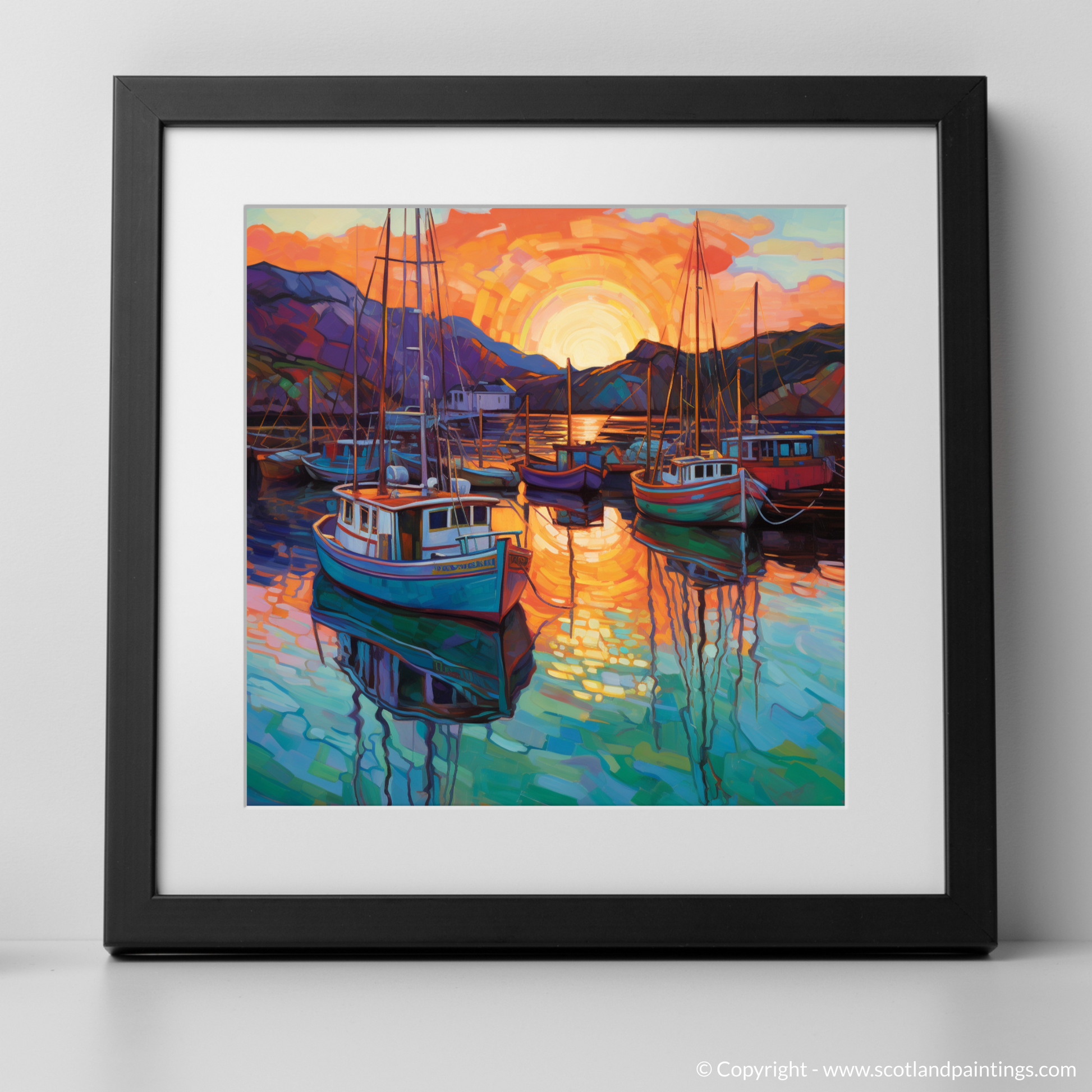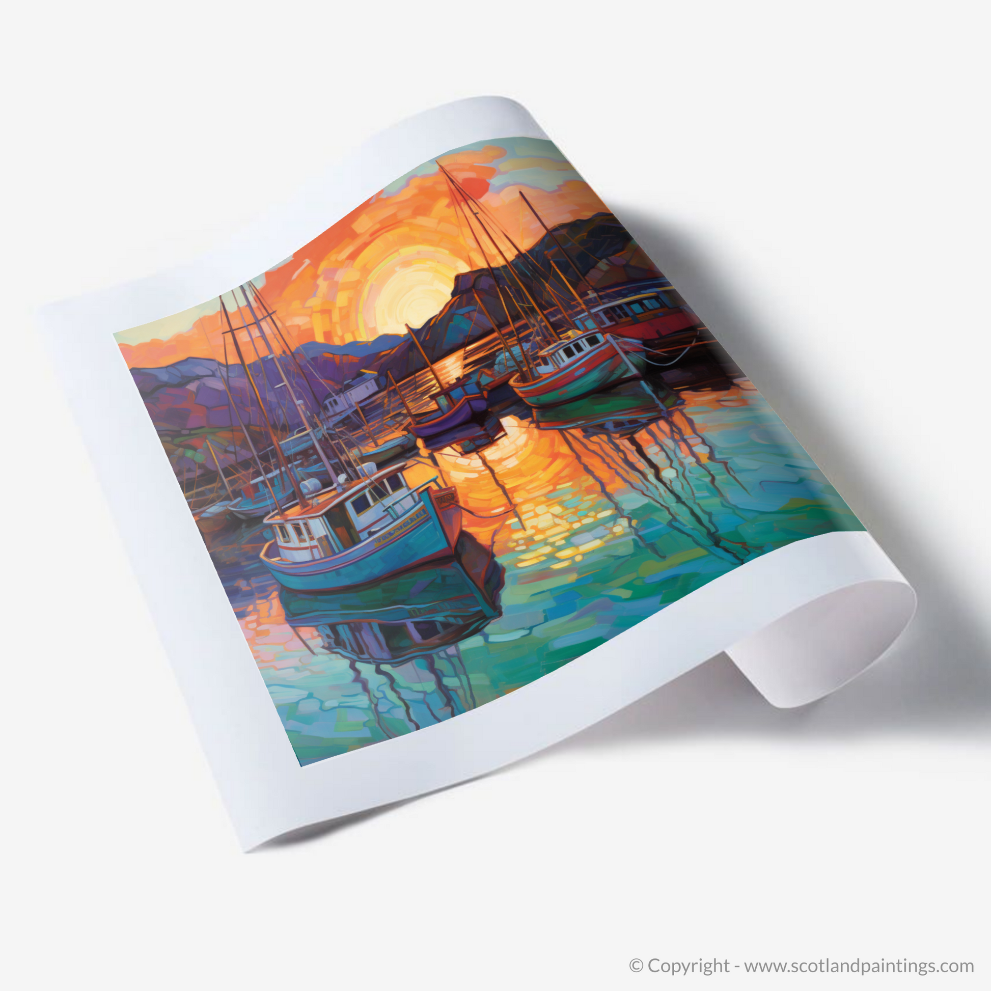 The mountains in the backdrop, set against the retreating sun, rise with a quiet dignity, their silhouetted forms contributing to the overall serenity of the harbour. The painting's application of bold, contrasting tones and the fluidity of the seemingly spontaneous brushwork bring a contemporary vibrancy to the traditional scenery, inviting the viewer to experience a well-known Scottish locale through an entirely new lens.
