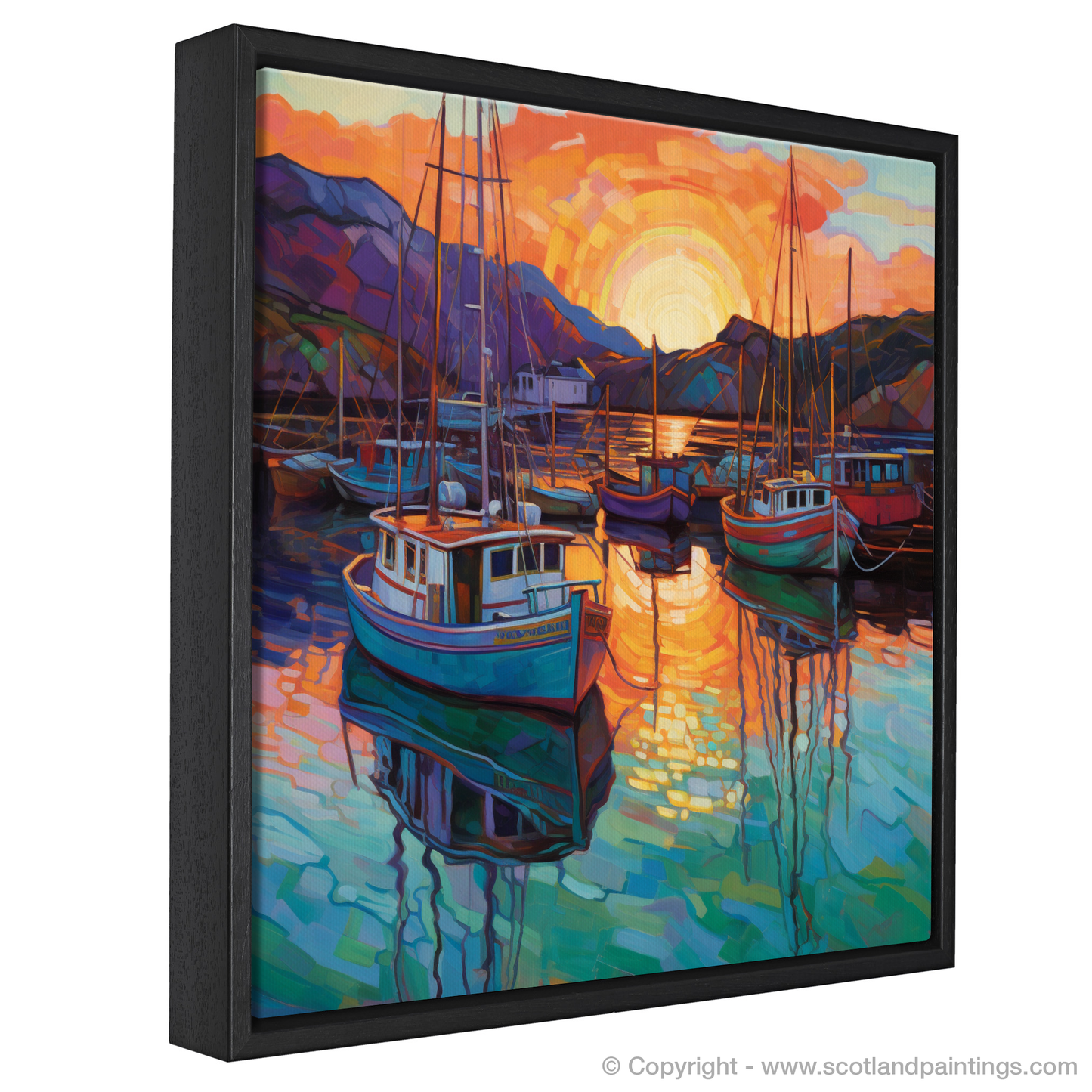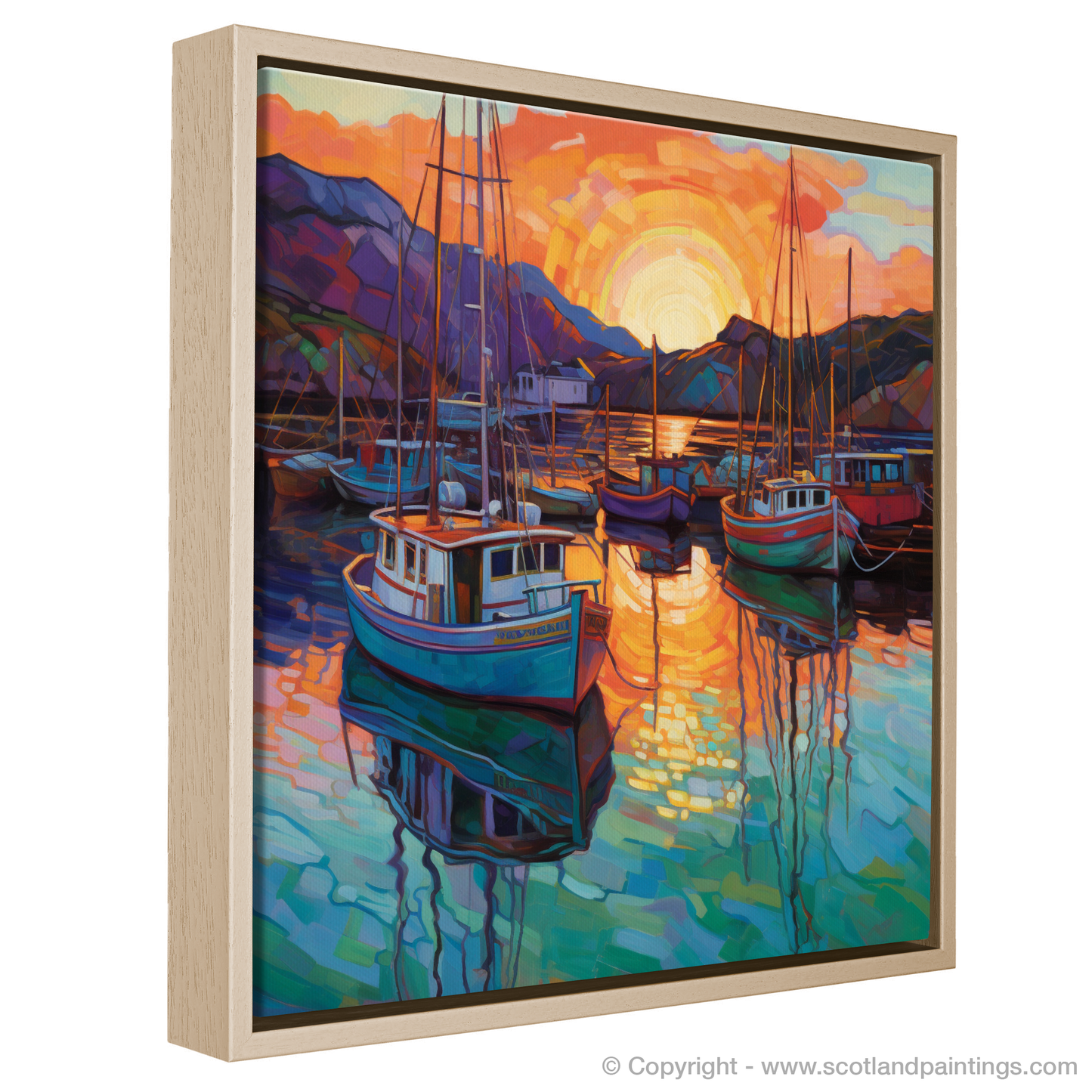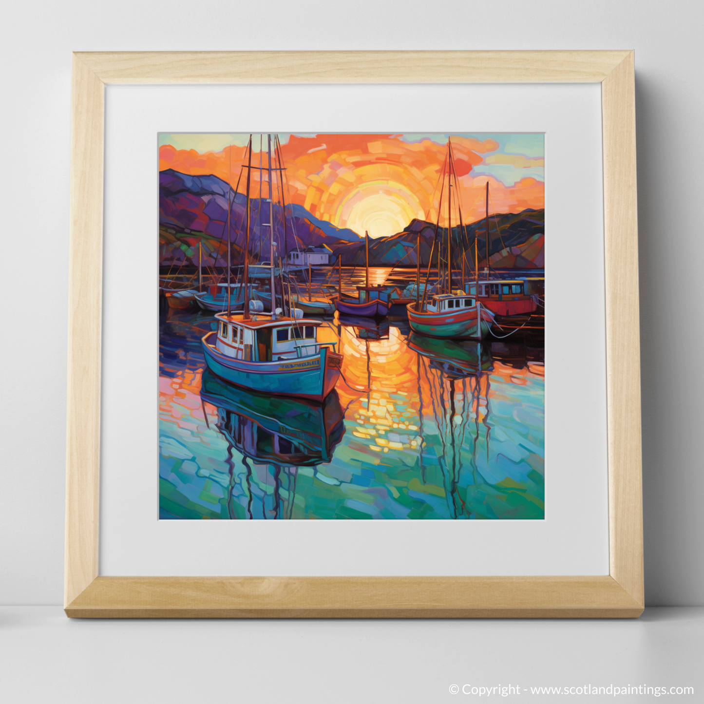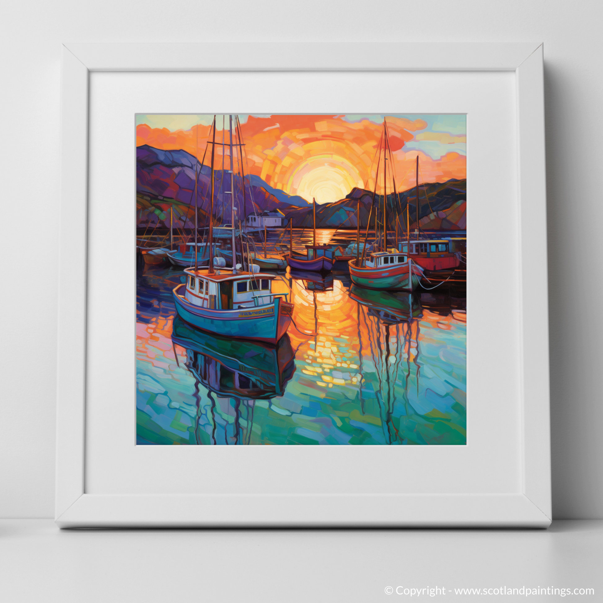 The mountains in the backdrop, set against the retreating sun, rise with a quiet dignity, their silhouetted forms contributing to the overall serenity of the harbour. The painting's application of bold, contrasting tones and the fluidity of the seemingly spontaneous brushwork bring a contemporary vibrancy to the traditional scenery, inviting the viewer to experience a well-known Scottish locale through an entirely new lens.