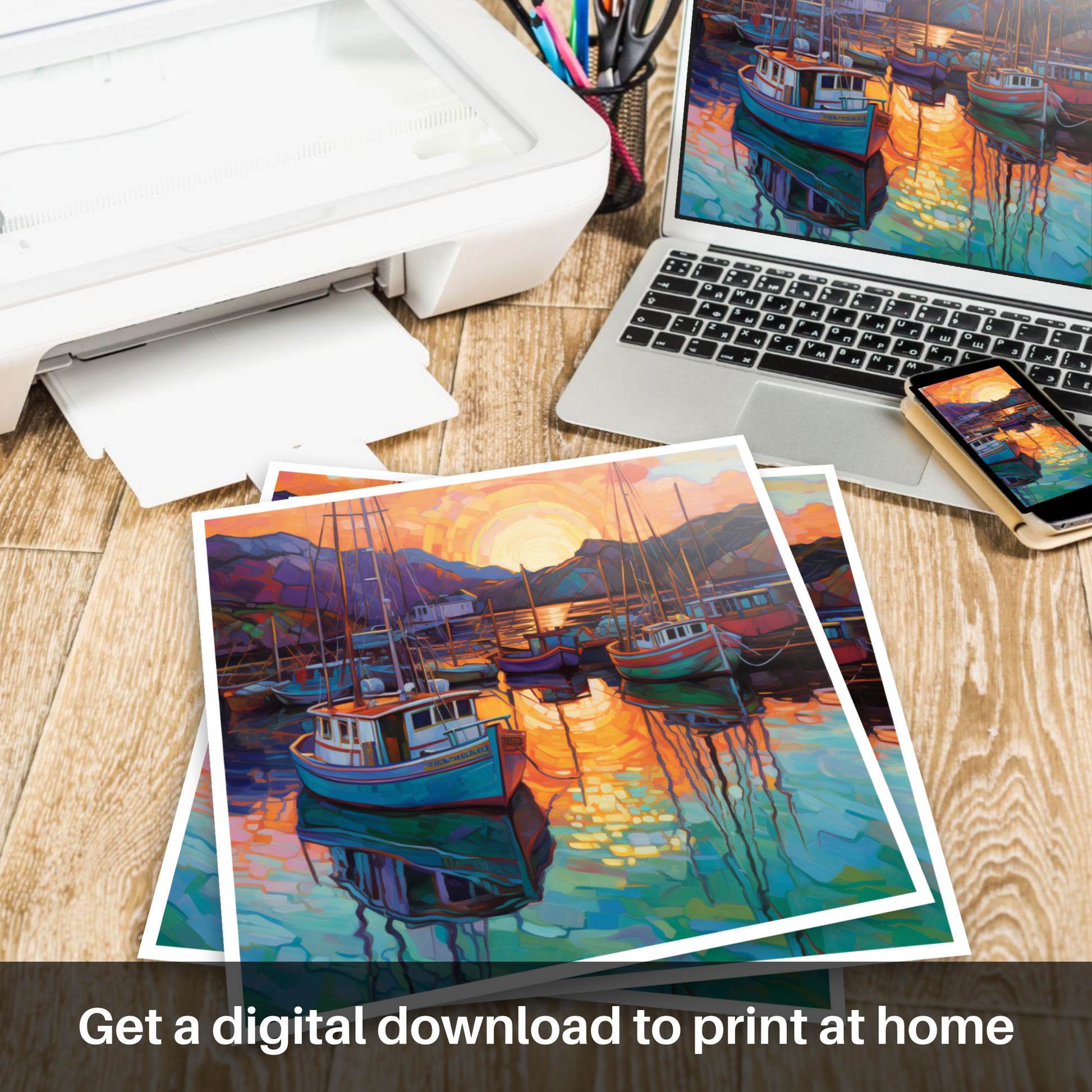 As the day draws to a close, the fiery orb of the sun dips towards the horizon, bathing Cullen Harbour in a warm, iridescent glow. This exquisite print captures the essence of the harbour at the most magical time of day, encapsulating the enchantment of sunset in a symphony of vivid hues and dynamic brushstrokes characteristic of Modern Impressionism.