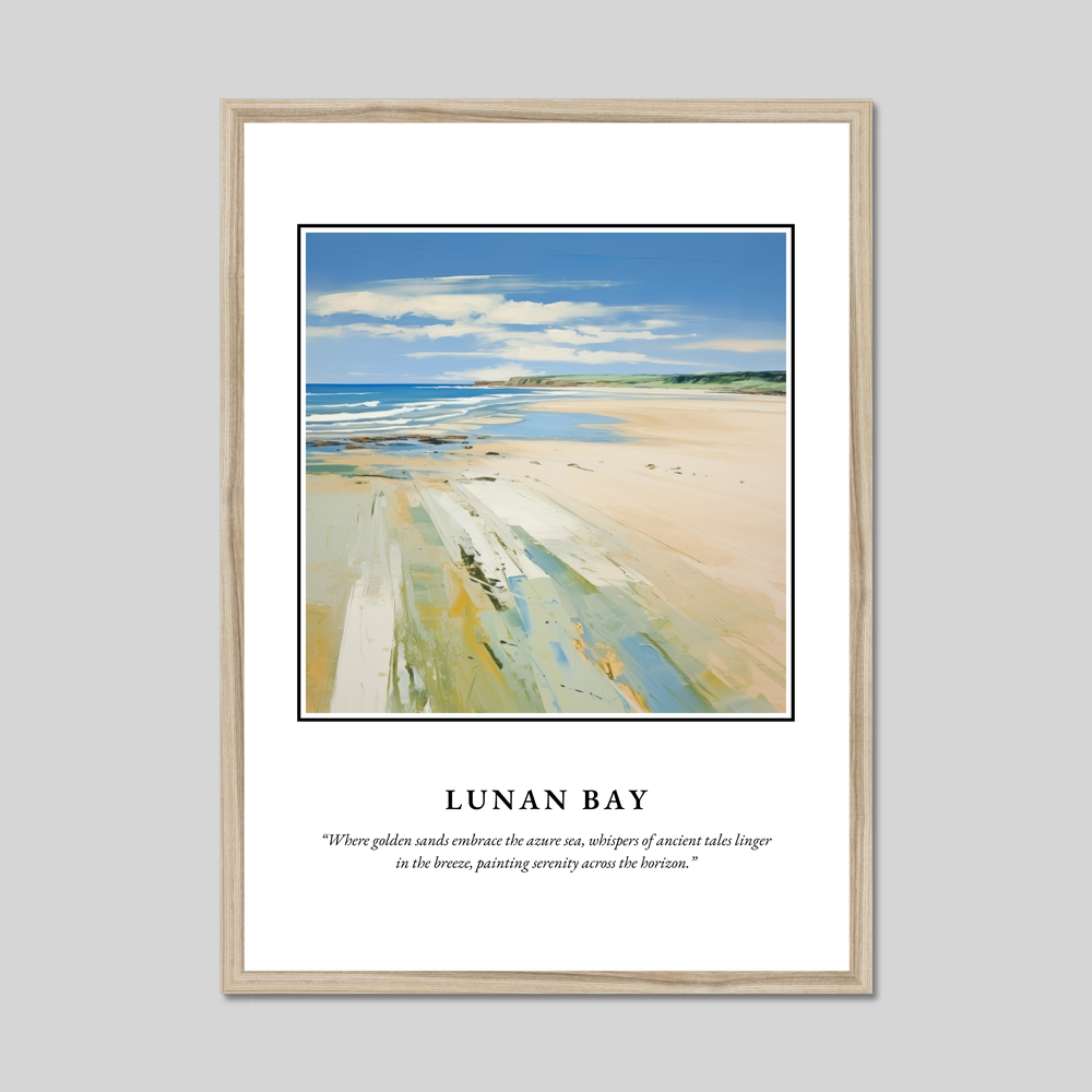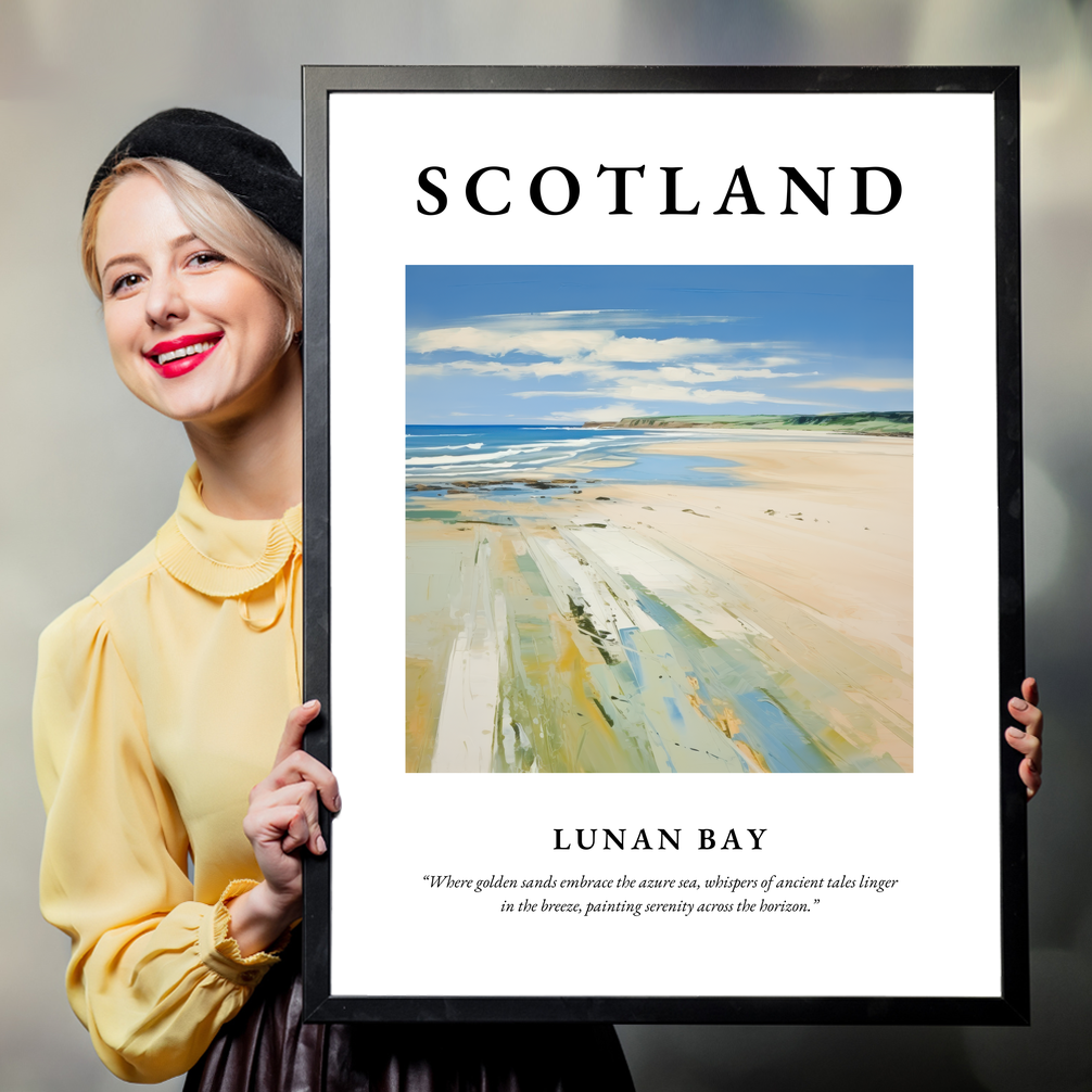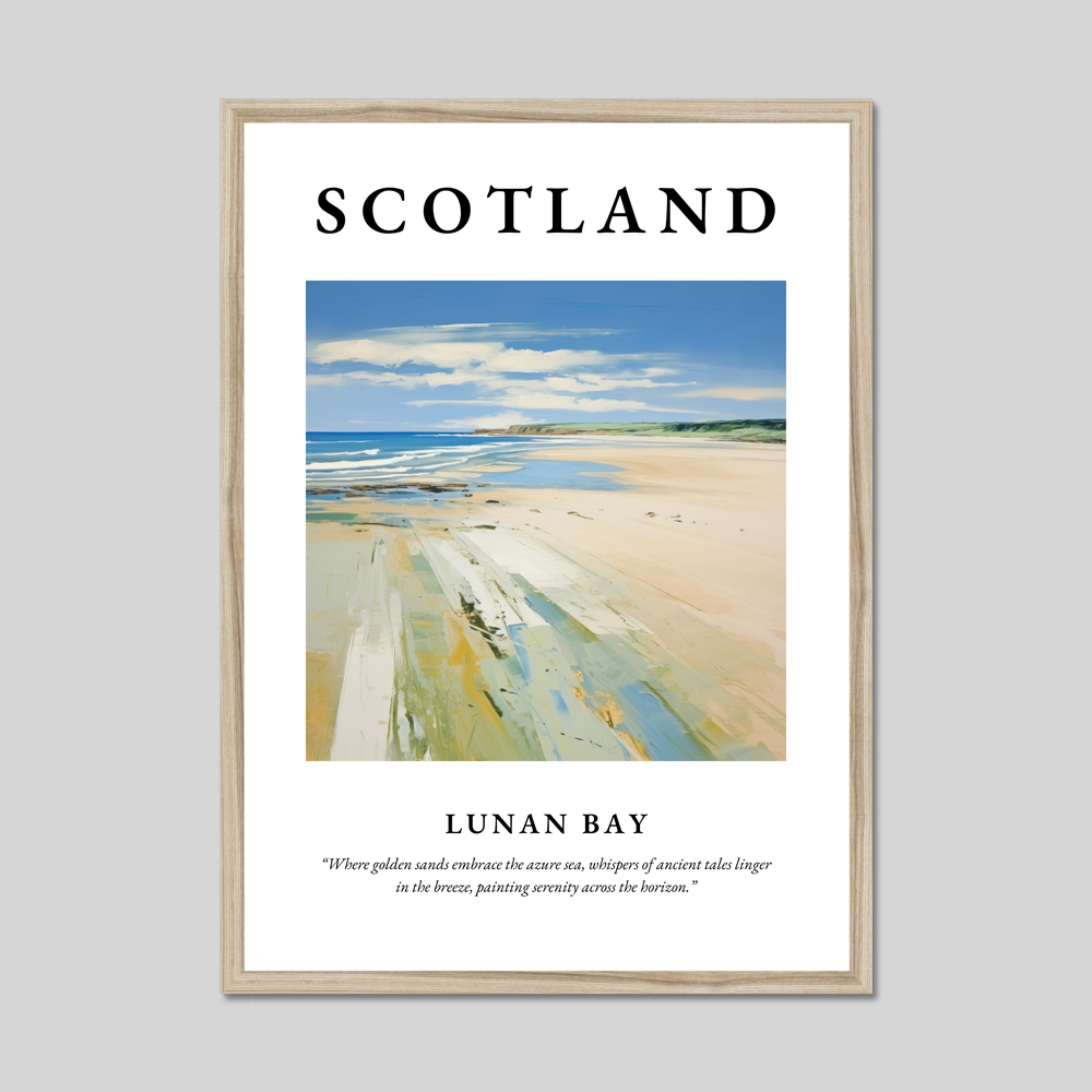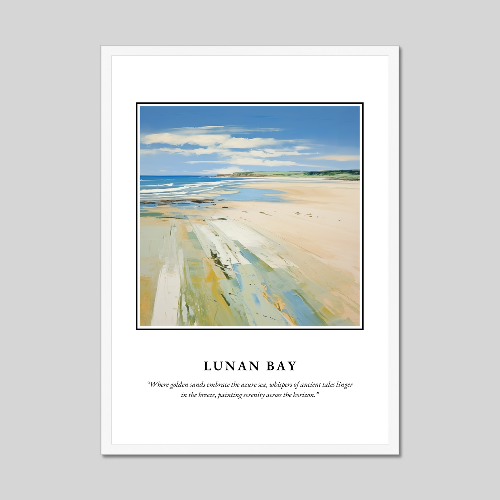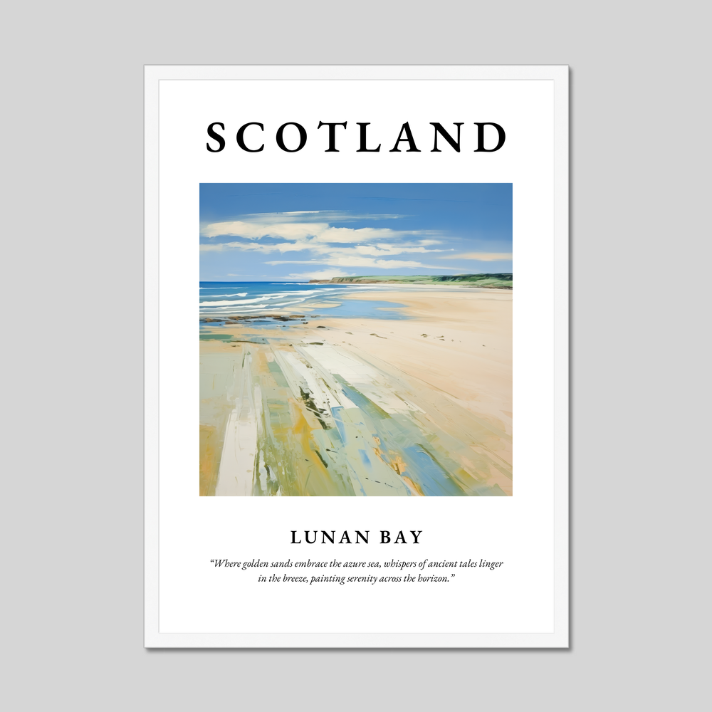 Lunan Bay, situated on the east coast of Scotland, is celebrated for its expansive stretch of golden sands and rolling dunes. This serene haven is a retreat from the hustle and bustle of everyday life, offering a unique blend of rugged natural beauty and tranquil seclusion. The painting in our poster beautifully mirrors Lunan Bay’s charm, capturing the essence of its serene landscape where sky and sea merge into a horizon imbued with stories of yesteryears.