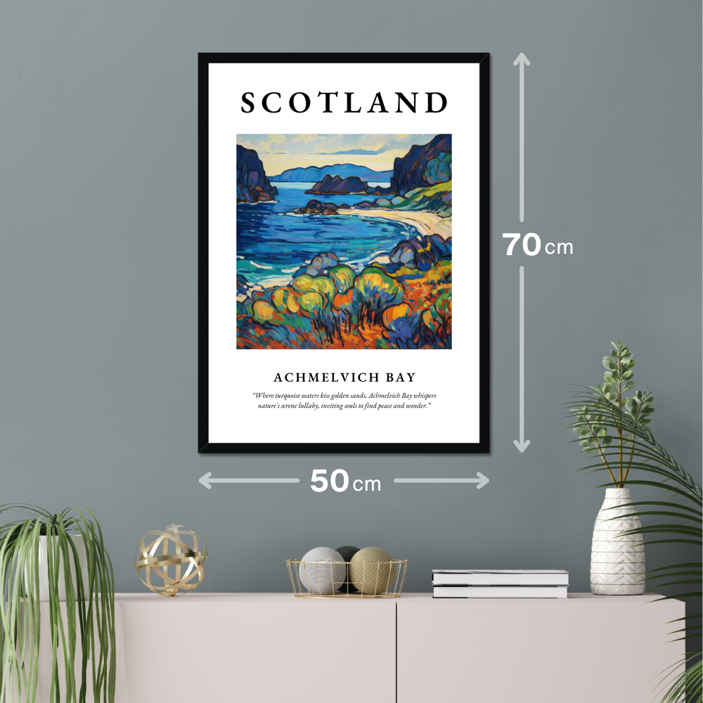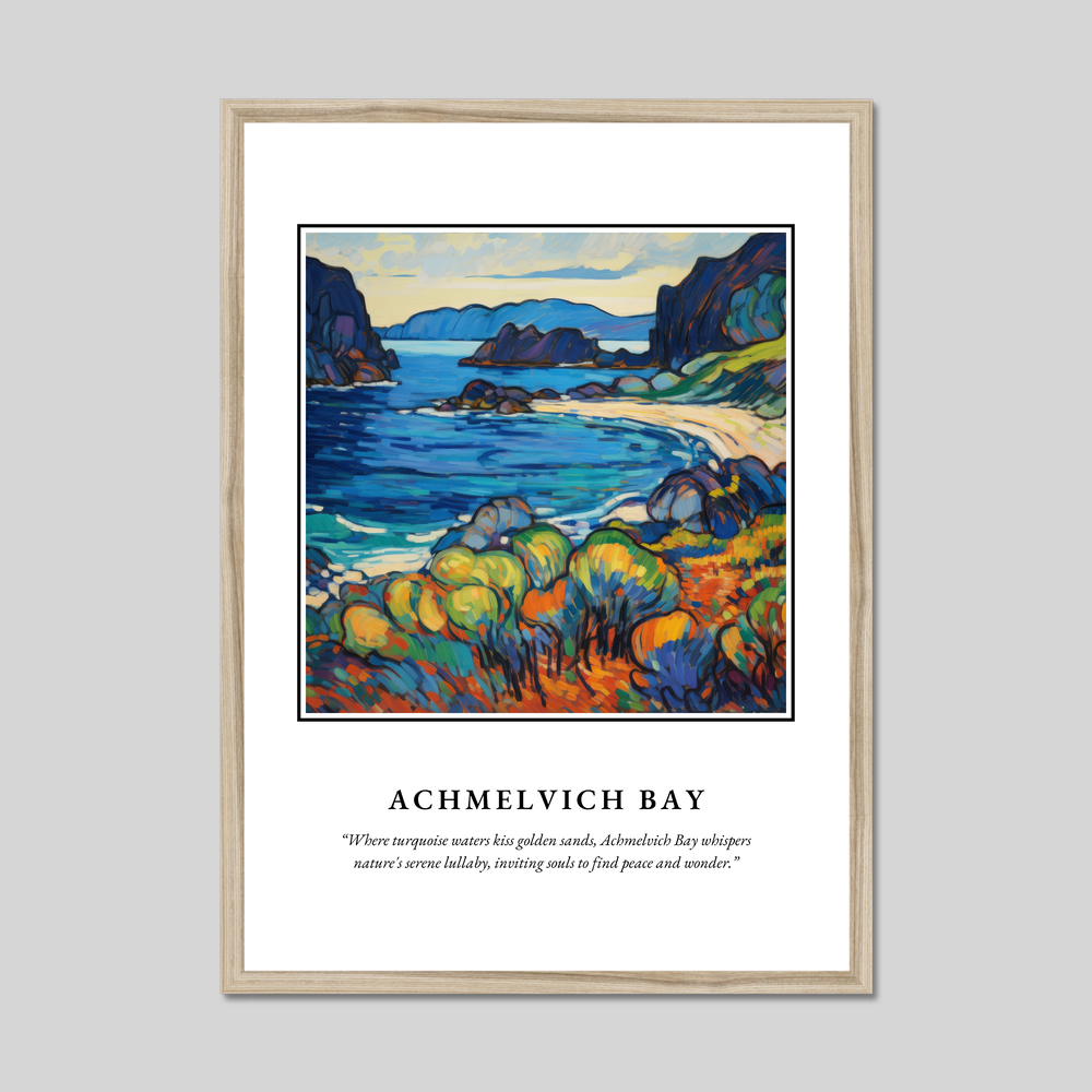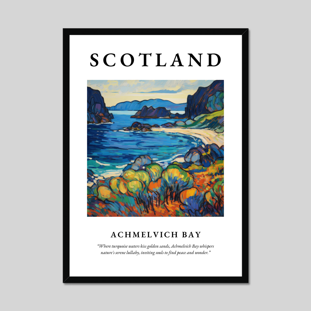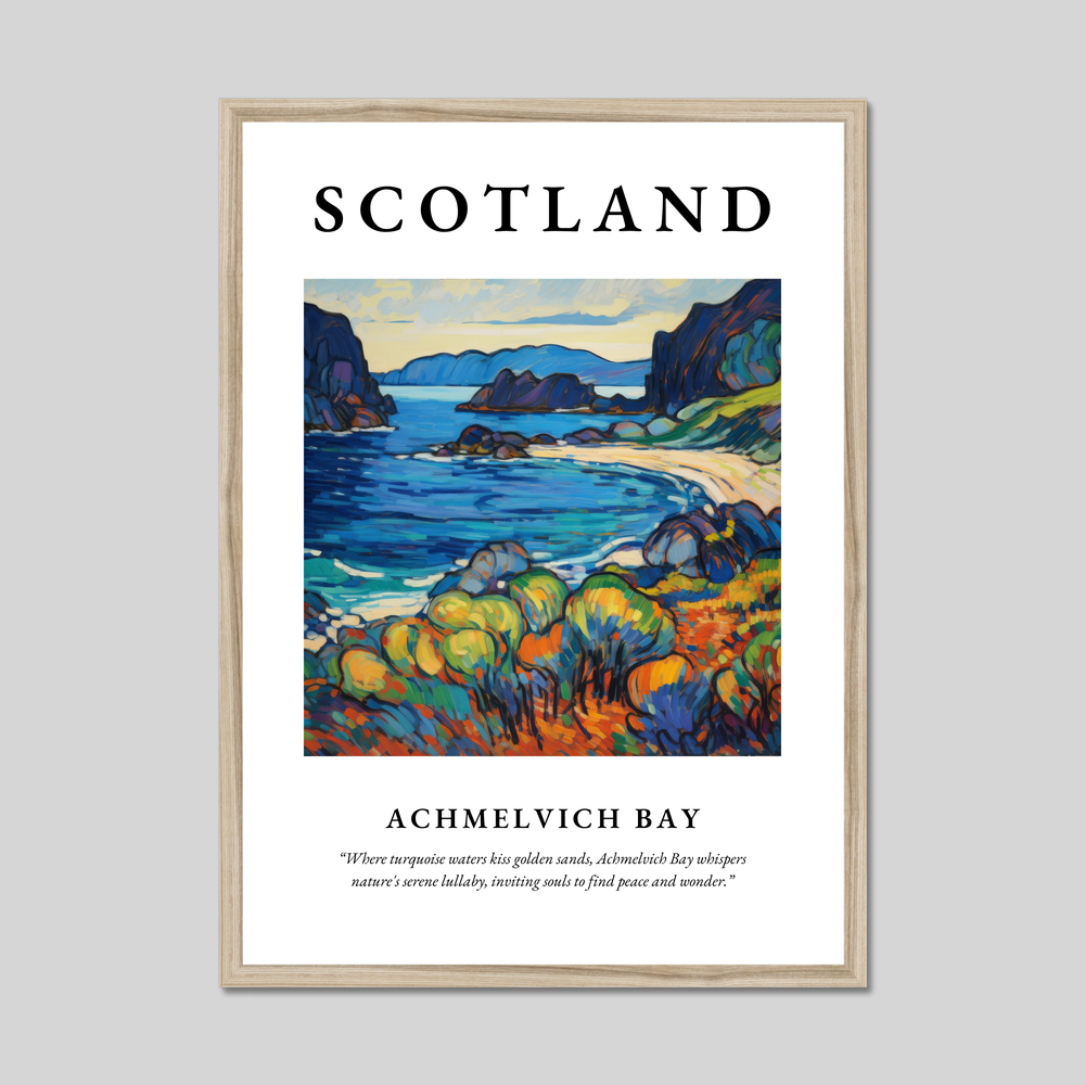 Discover the charm of Scotland's breathtaking landscapes with our stunning framed poster print, a jewel in our exclusive “Scottish Coves” collection. Measuring an impressive 50cm x 70cm, this large poster transforms any room, beautifully capturing the essence of Achmelvich Bay. Available in a choice of black, white, or natural wood-effect frames, it effortlessly complements any interior style while paying homage to a land where nature’s beauty reigns supreme.