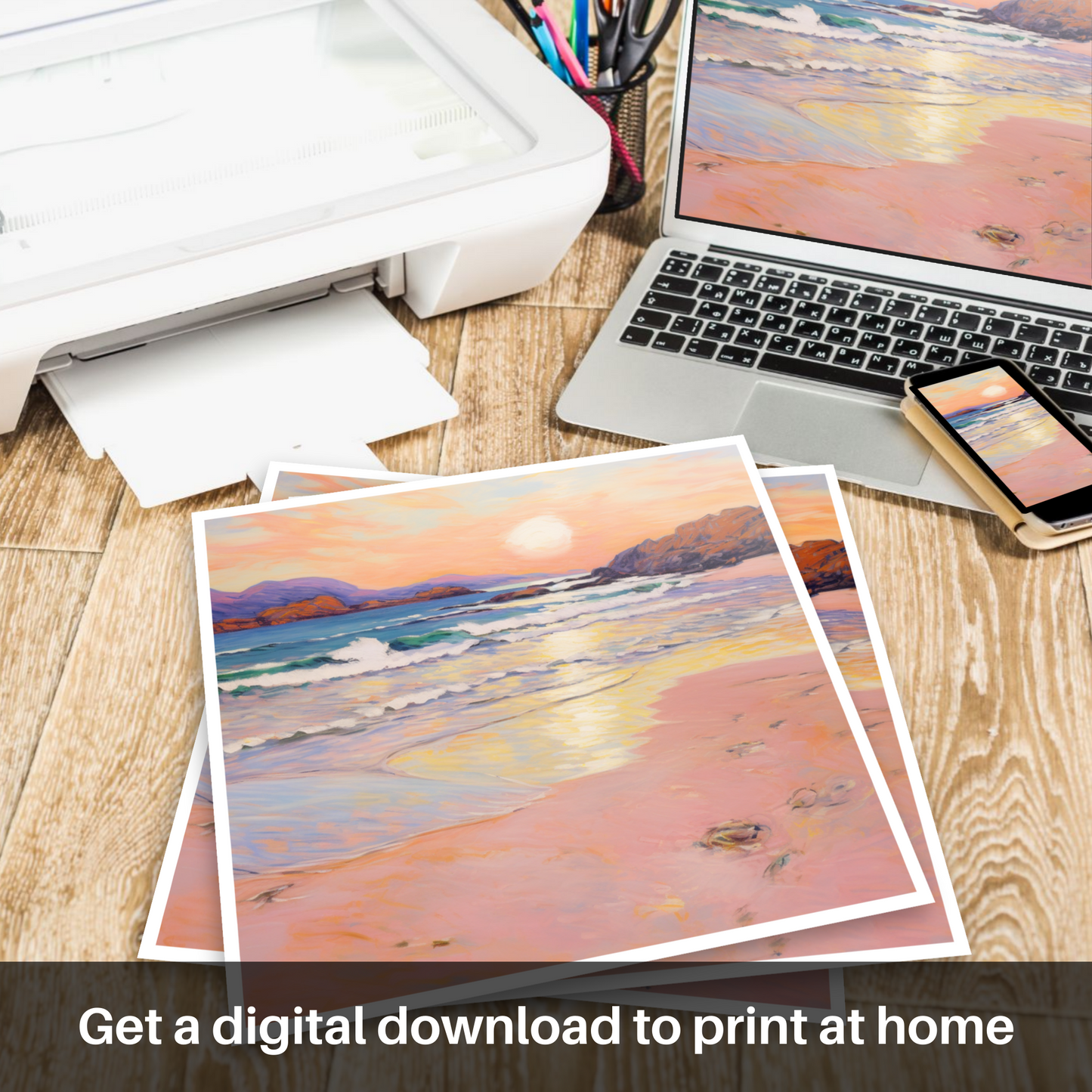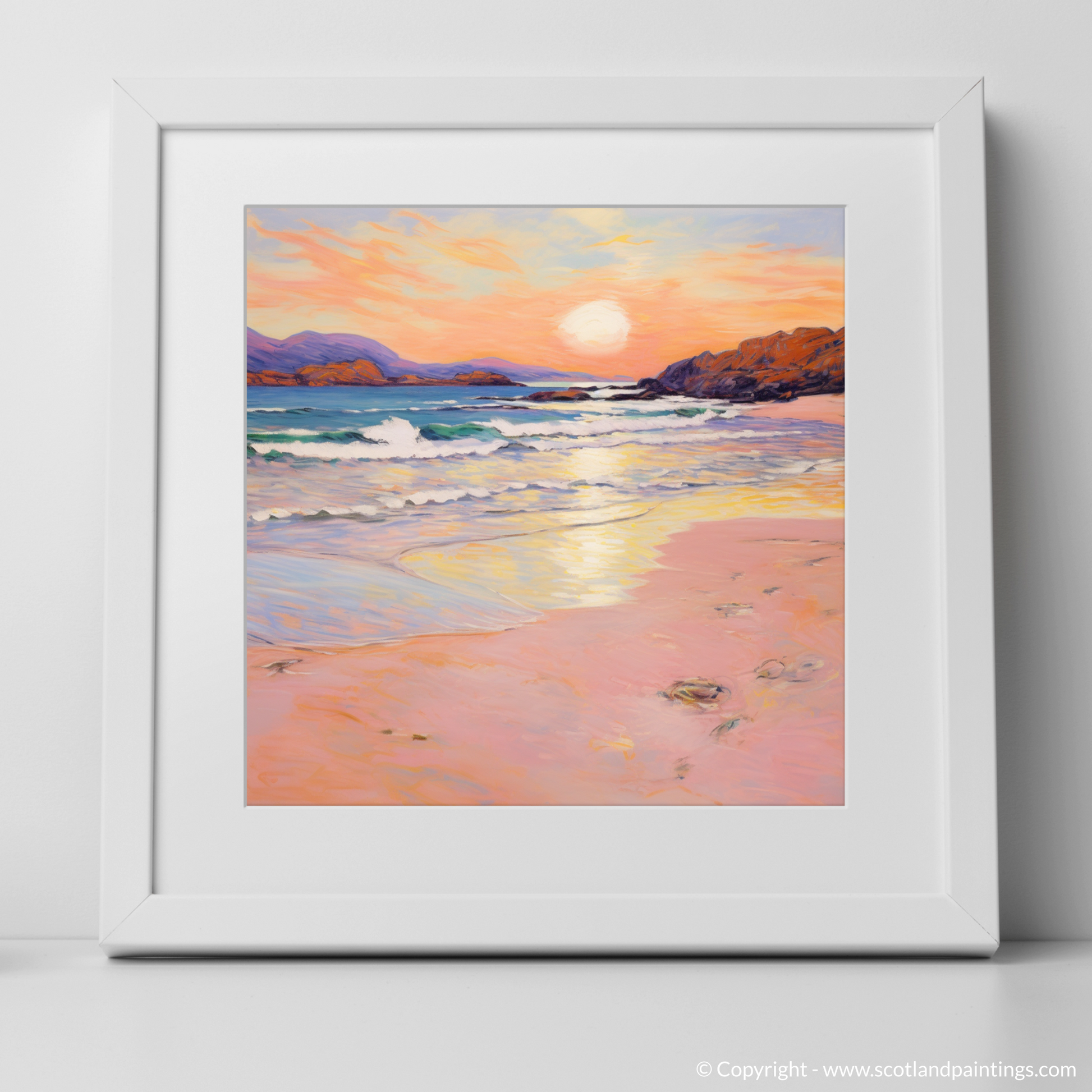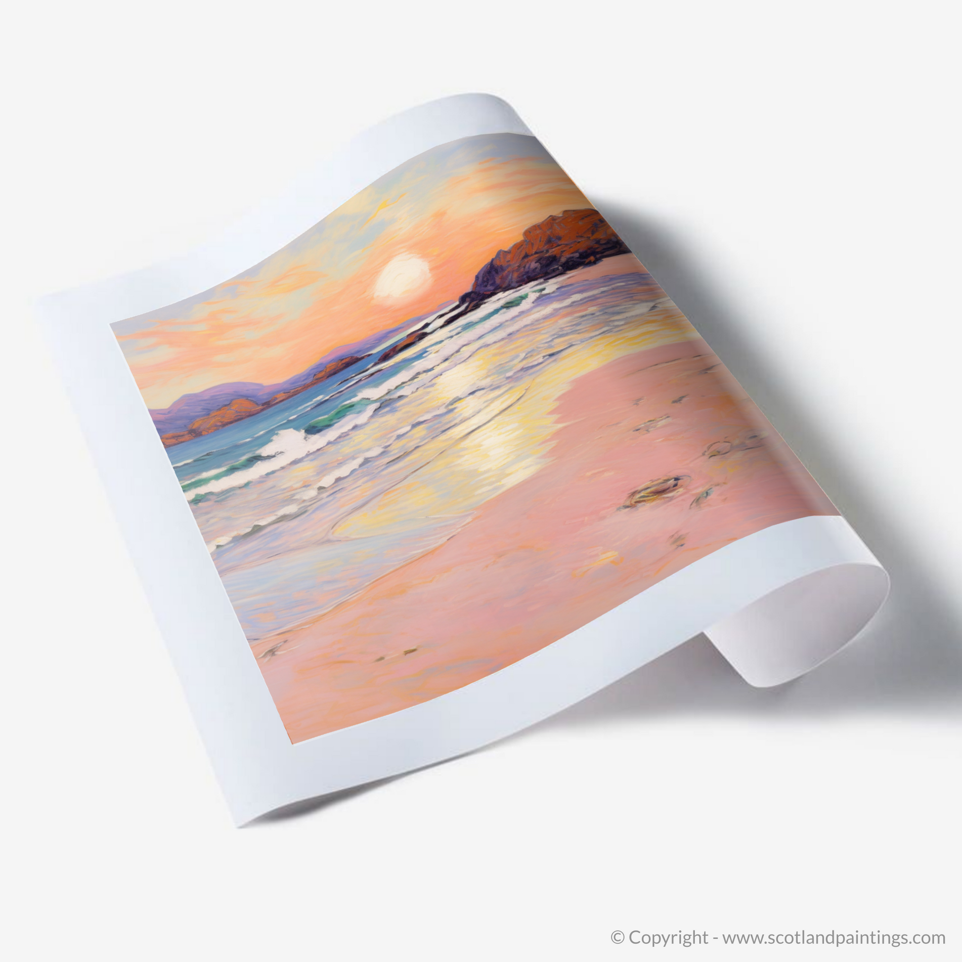 Bask in the ethereal glow of golden hour at the serene Camusdarach Beach with this entrancing print, a gem in our 'Scottish Coves' collection. The brushstrokes dance with vivacity, capturing the fleeting moments of dusk as it kisses the day goodbye. Hues of peach, lavender, and coral streak the sky, emanating a warmth that is near tangible, making one almost feel the gentle evening breeze.