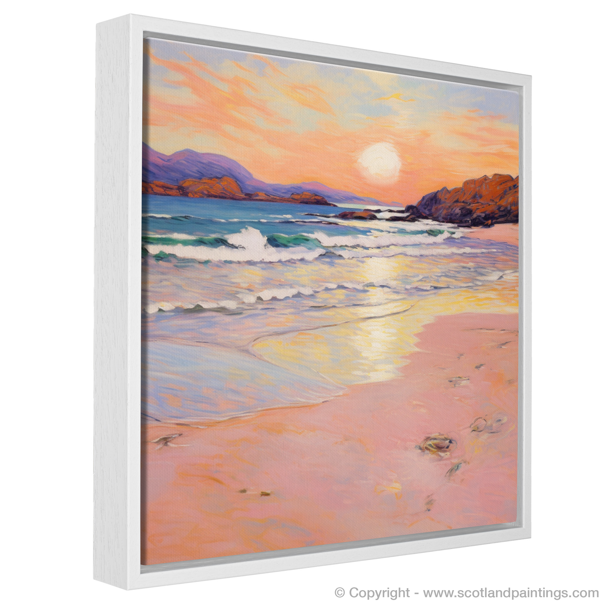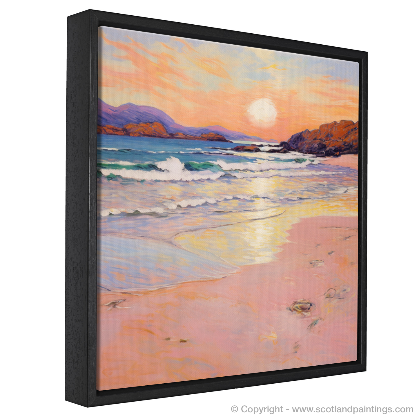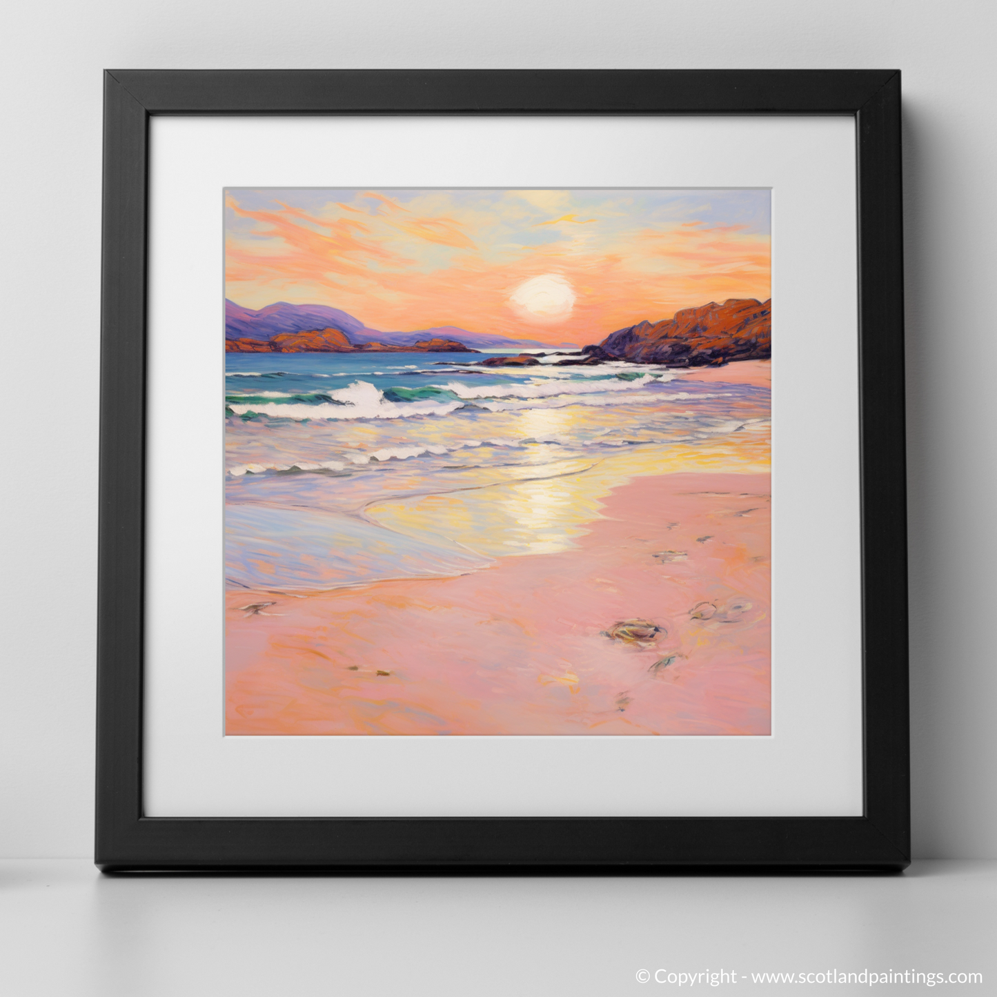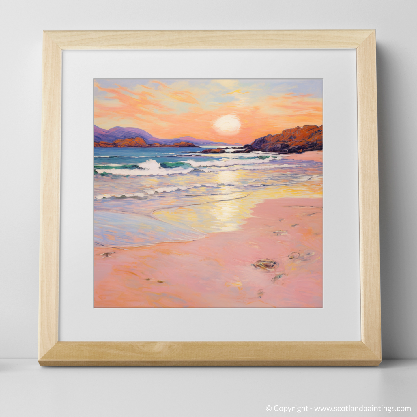 Bask in the ethereal glow of golden hour at the serene Camusdarach Beach with this entrancing print, a gem in our 'Scottish Coves' collection. The brushstrokes dance with vivacity, capturing the fleeting moments of dusk as it kisses the day goodbye. Hues of peach, lavender, and coral streak the sky, emanating a warmth that is near tangible, making one almost feel the gentle evening breeze.