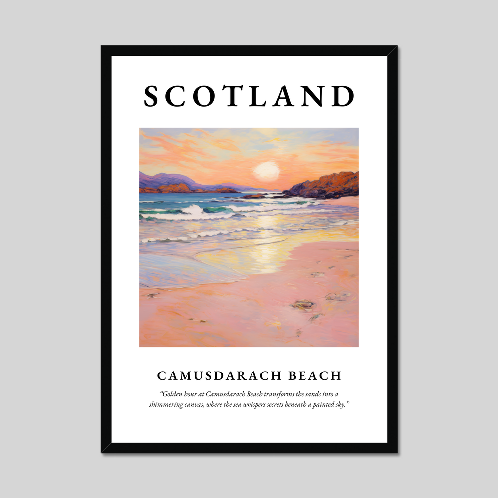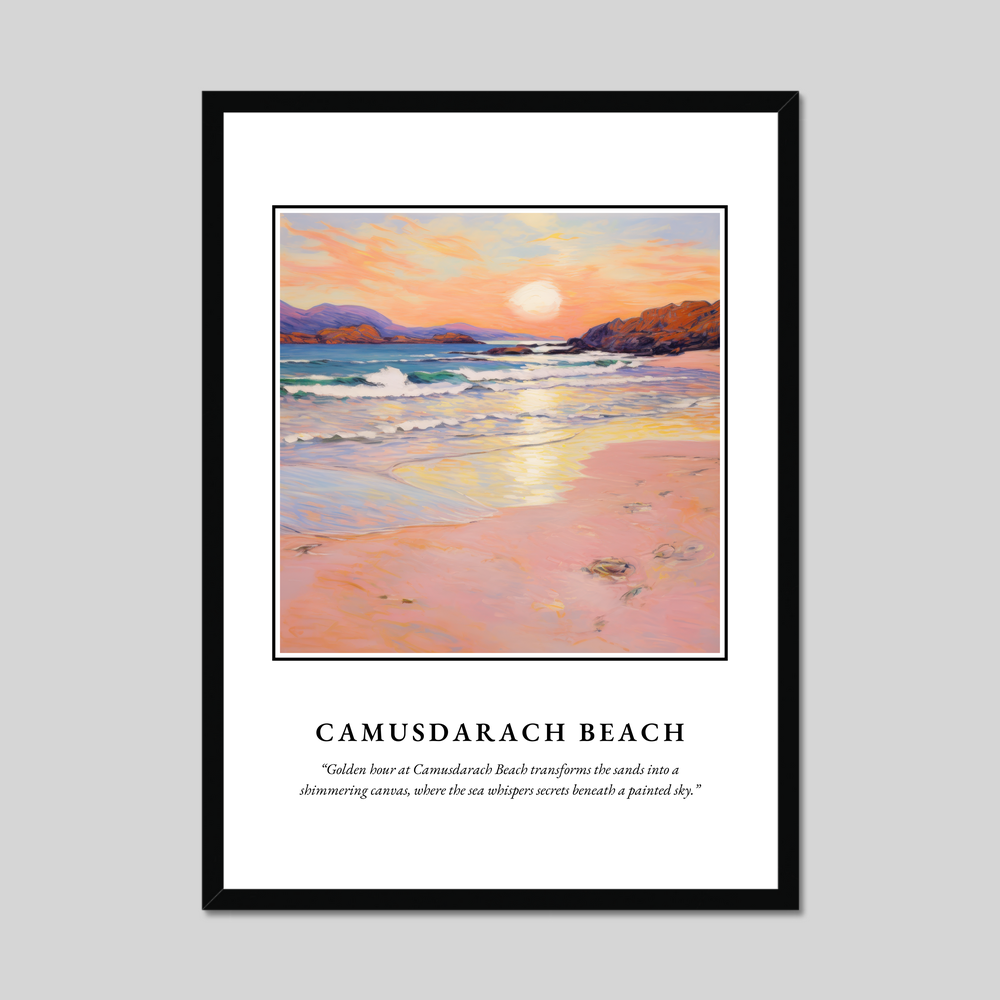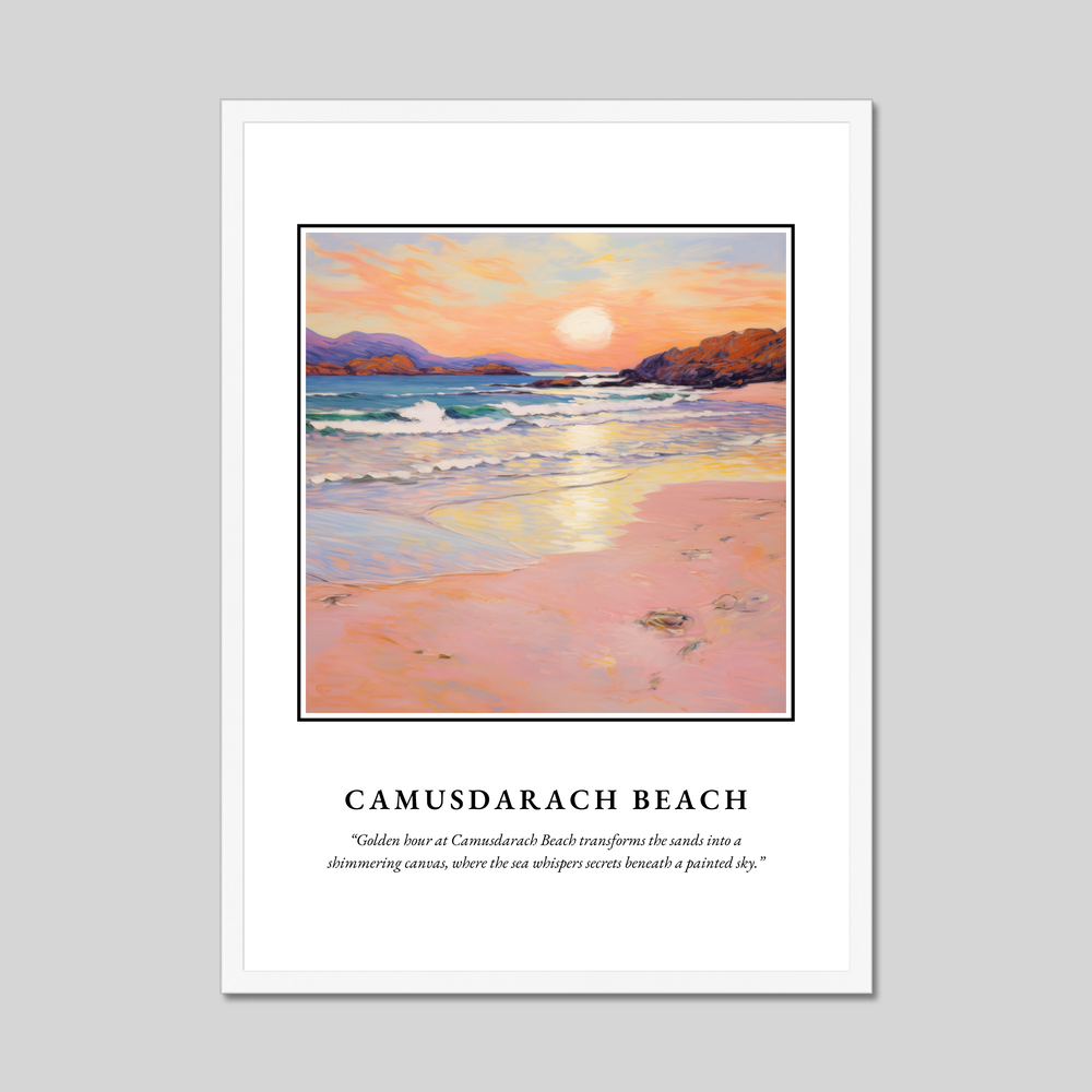 Camusdarach Beach, nestled on the west coast of Scotland, is a hidden gem renowned for its pristine sands and breathtaking sunsets. A setting favoured by filmmakers and artists alike, this stunning location is reflected in the gentle waves and warm colours of our featured artwork. Whether you've visited its shores, dreamt of its beauty, or long to return, this poster captures the very heart of Camusdarach’s tranquil charm.