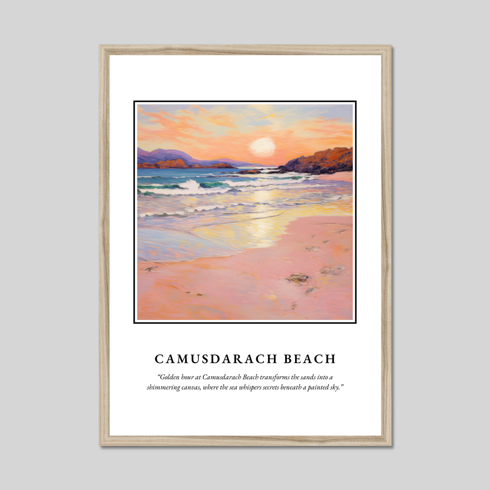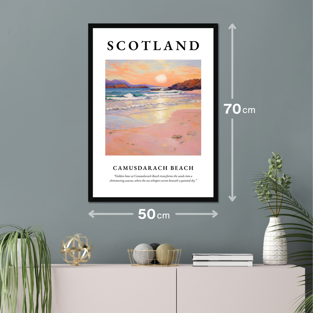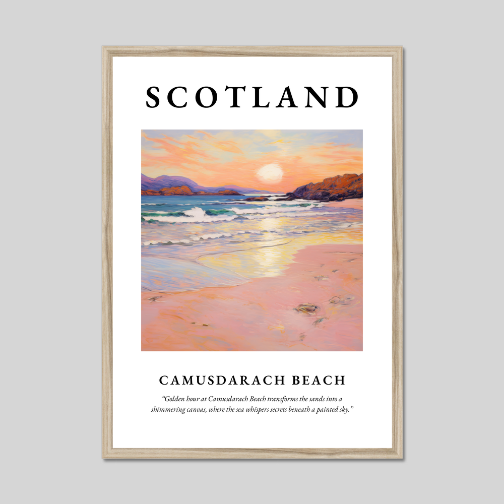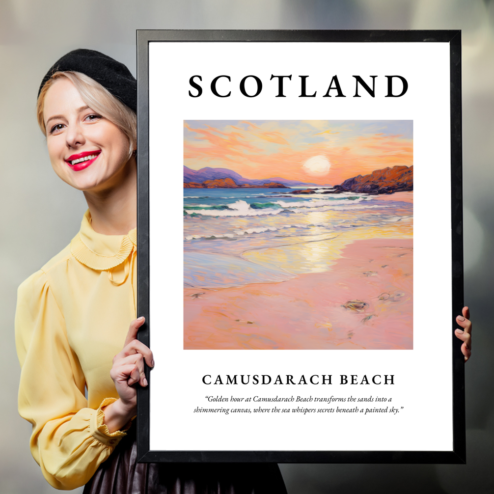Camusdarach Beach, nestled on the west coast of Scotland, is a hidden gem renowned for its pristine sands and breathtaking sunsets. A setting favoured by filmmakers and artists alike, this stunning location is reflected in the gentle waves and warm colours of our featured artwork. Whether you've visited its shores, dreamt of its beauty, or long to return, this poster captures the very heart of Camusdarach’s tranquil charm.