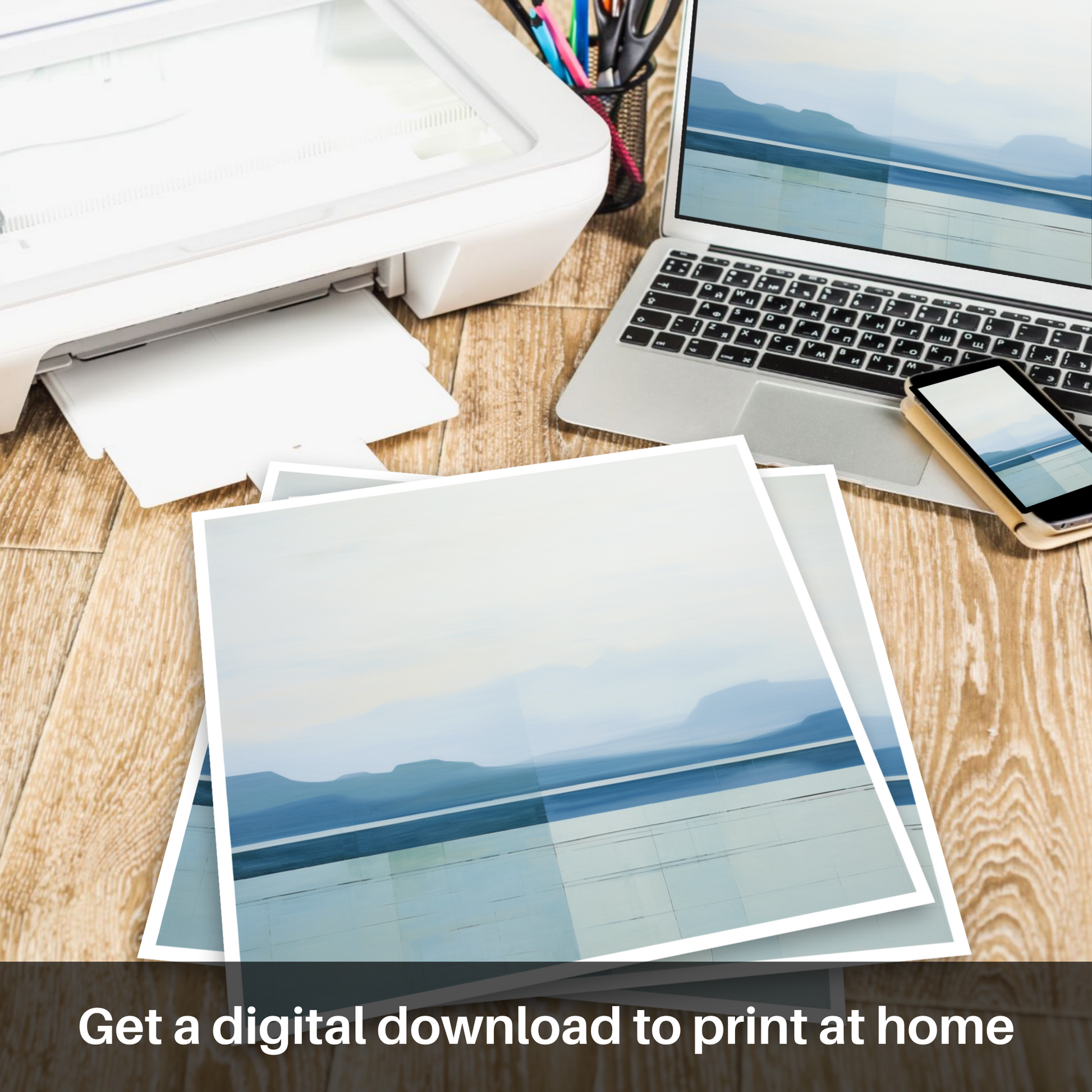 Immerse yourself in the tranquil beauty of the Scottish Highlands with a print that captures the essence of Glen Falloch in a mesmerising abstract motif. Gentle hues of twilight blues and muted greens spread across the canvas, reminiscent of the serene loch waters at dusk. The subtle layering of colour evokes the timeless rolling hills and distant mountains, lending an almost ethereal quality to the landscape.