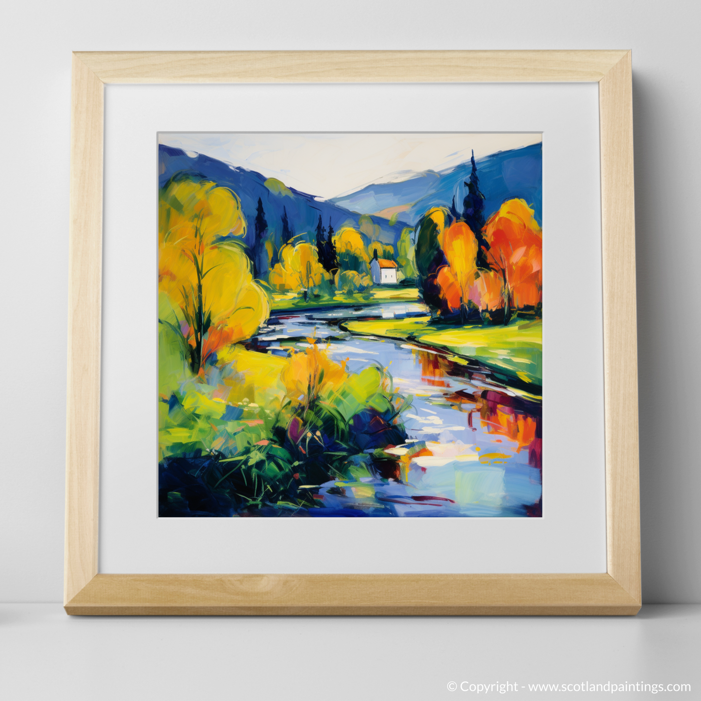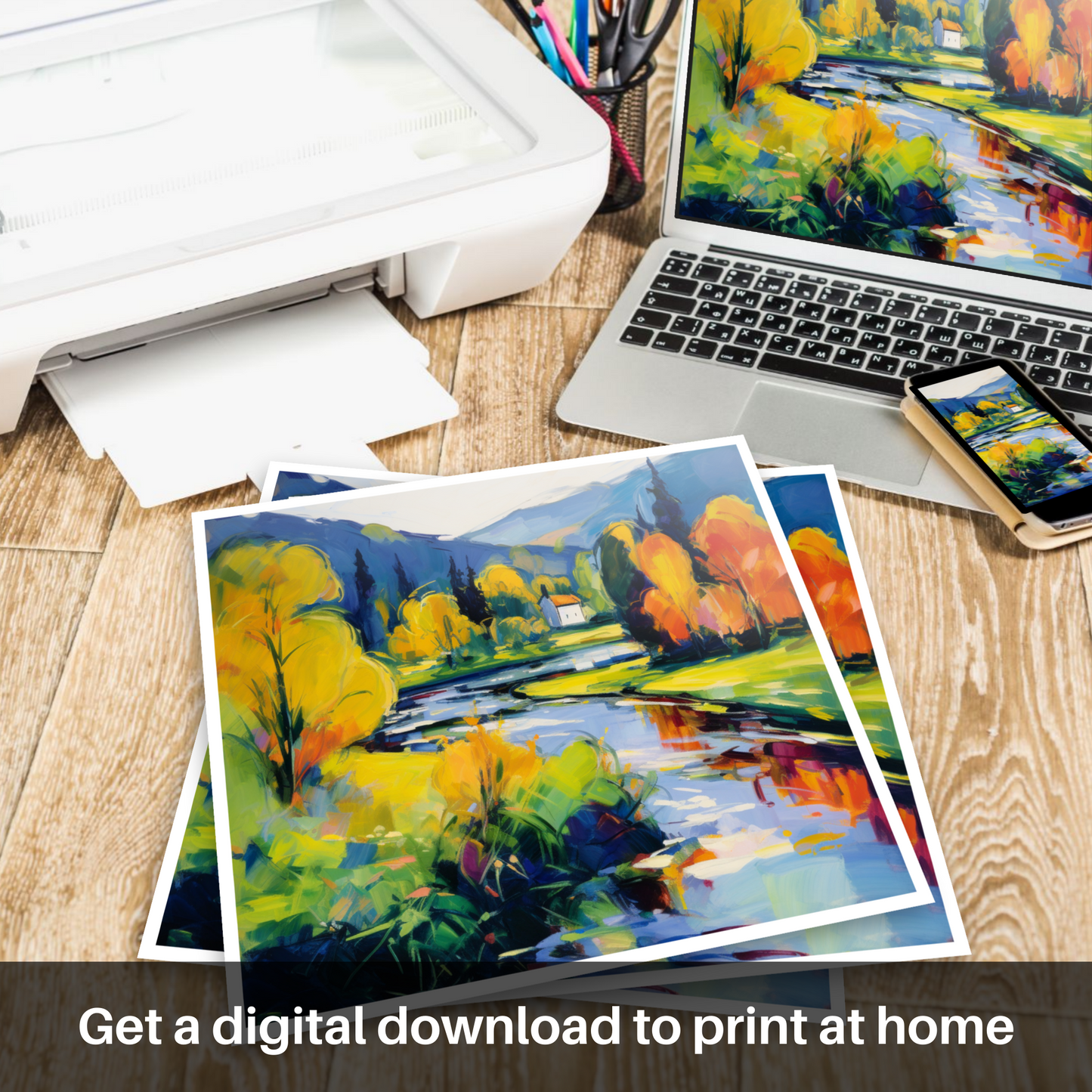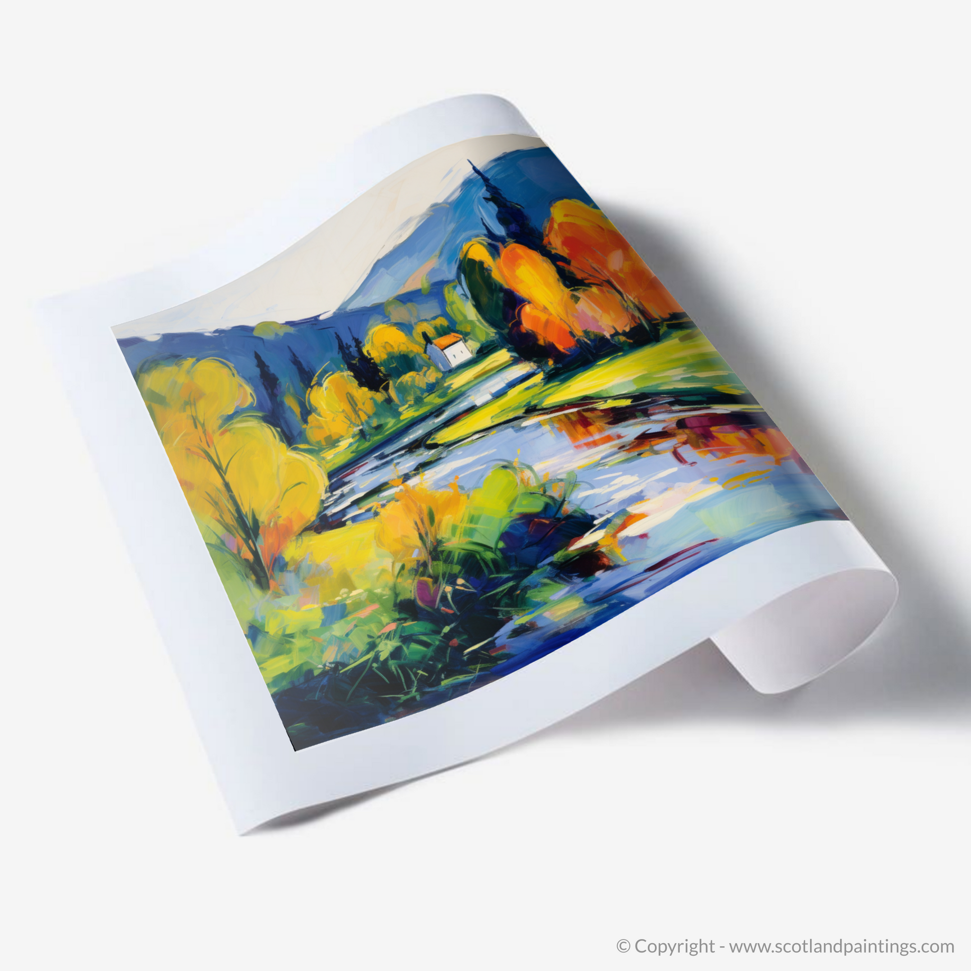 Immerse yourself in the vibrant hues and bold brushstrokes of this Fauvist-inspired print that captures the serene beauty of Dunkeld, Perthshire. A palette of vivid oranges, radiant yellows, and calming blues brings the Scottish countryside to life, evoking the essence of the village's natural charm. The print features an idyllic scene where the colours of the landscape are exaggerated, providing a feast for the senses, and lending a dreamlike quality to the familiar Scottish vista.