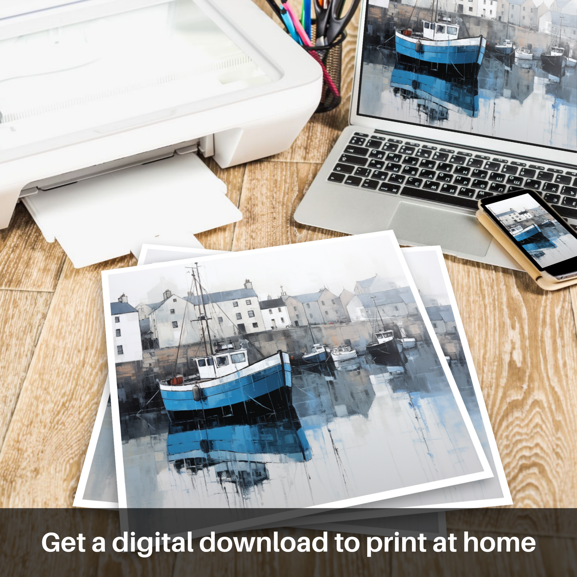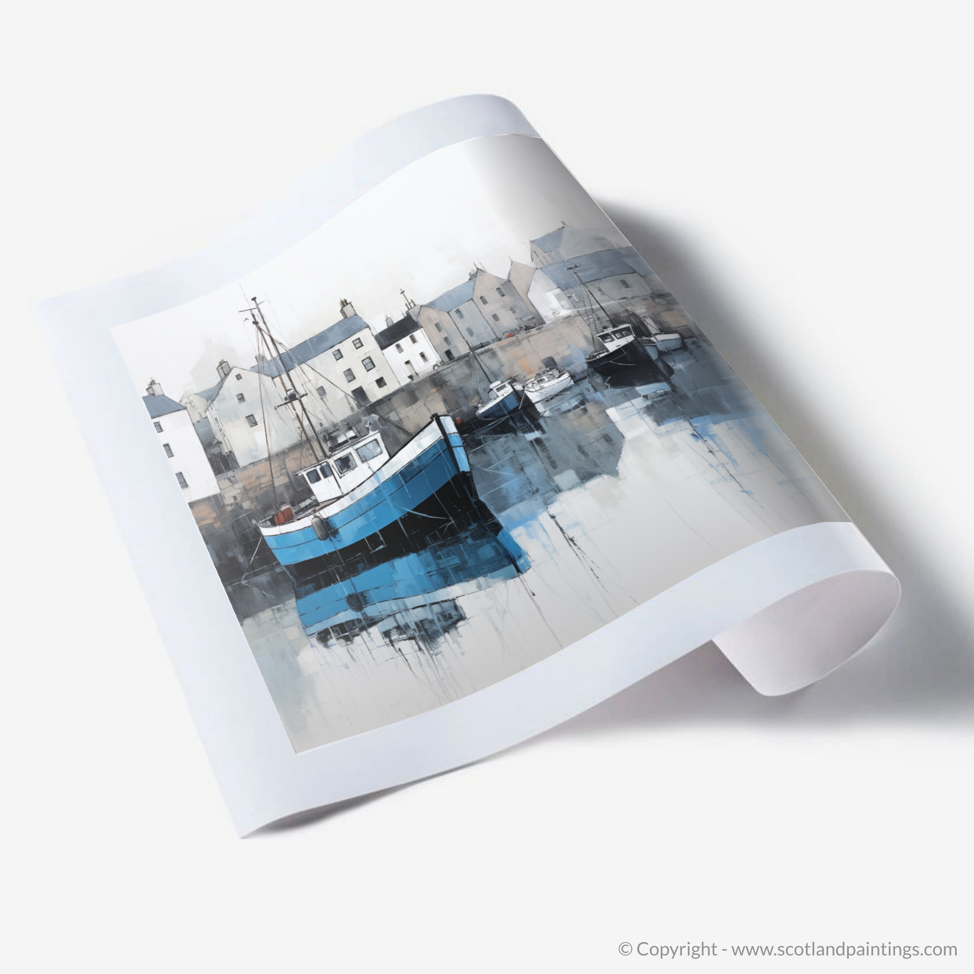 The stillness of the scene is palpable, enhanced by the masterful use of reflective surfaces that offer gentle symmetries and an almost meditative quality. This print embodies the essence of minimalist sophistication, an ideal addition to any space for admirers of Scottish seascapes looking for a visual retreat to the unruffled and picturesque eastern shoreline. Collectors and enthusiasts of Scottish Harbours will find respite in this timeless portrayal, where the fusion of minimalist artistry and coastal allure is seamlessly achieved.