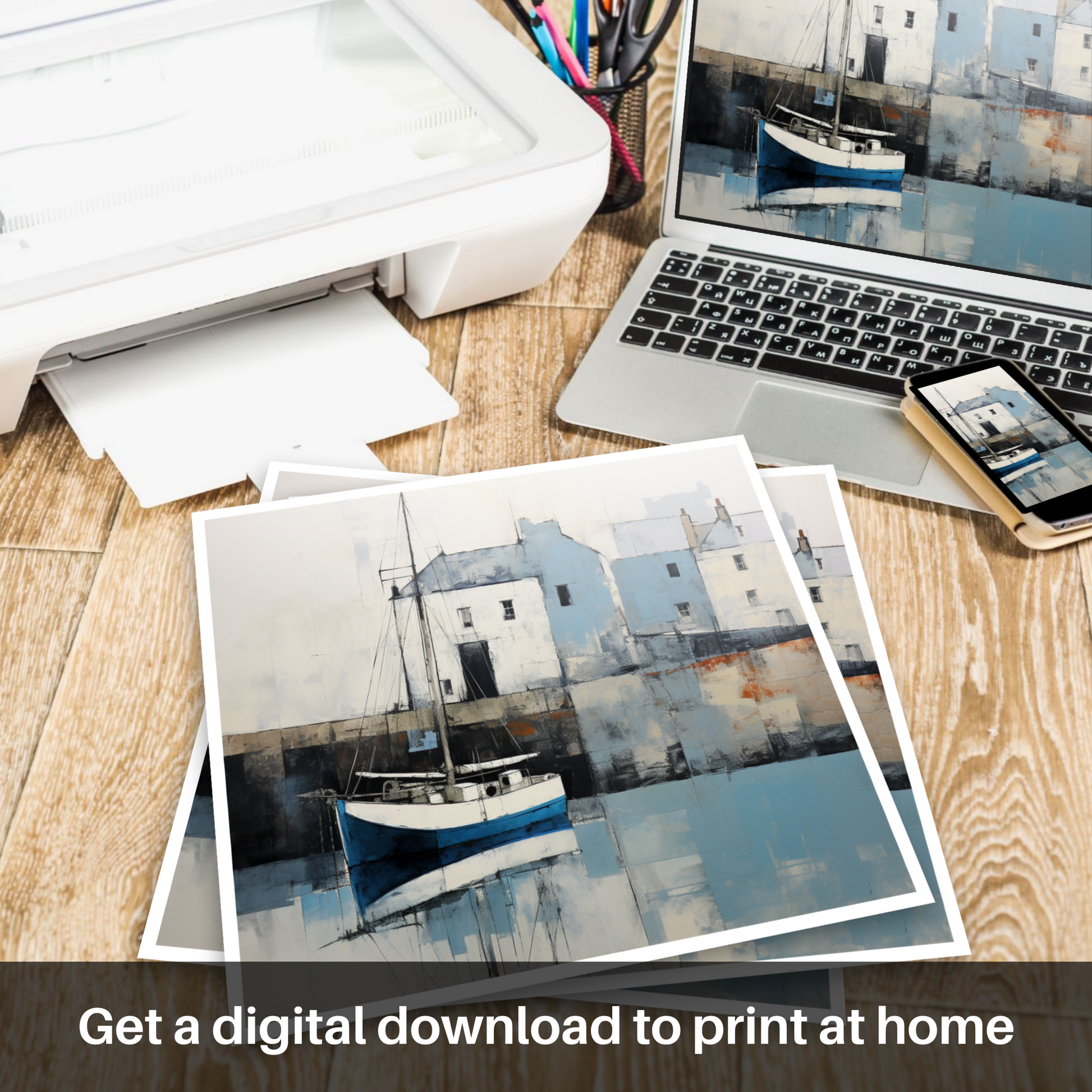 The backdrop of harbourside buildings is articulated with just enough detail to suggest weather-worn textures and the architectural charm without overwhelming the viewer. Their muted tones and geometric simplicity lend a timeless quality, allowing the depiction to transcend the immediate and invite the viewer into a contemplative state.