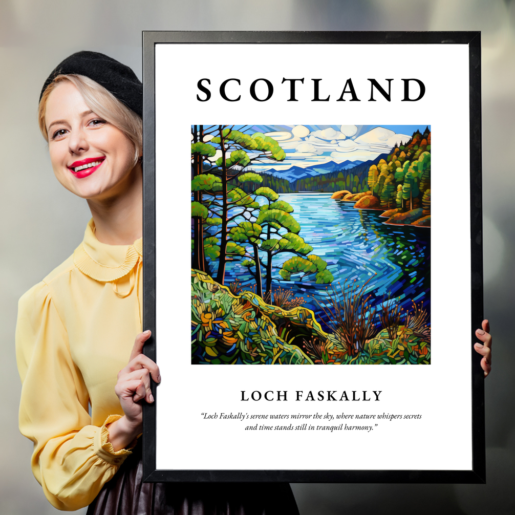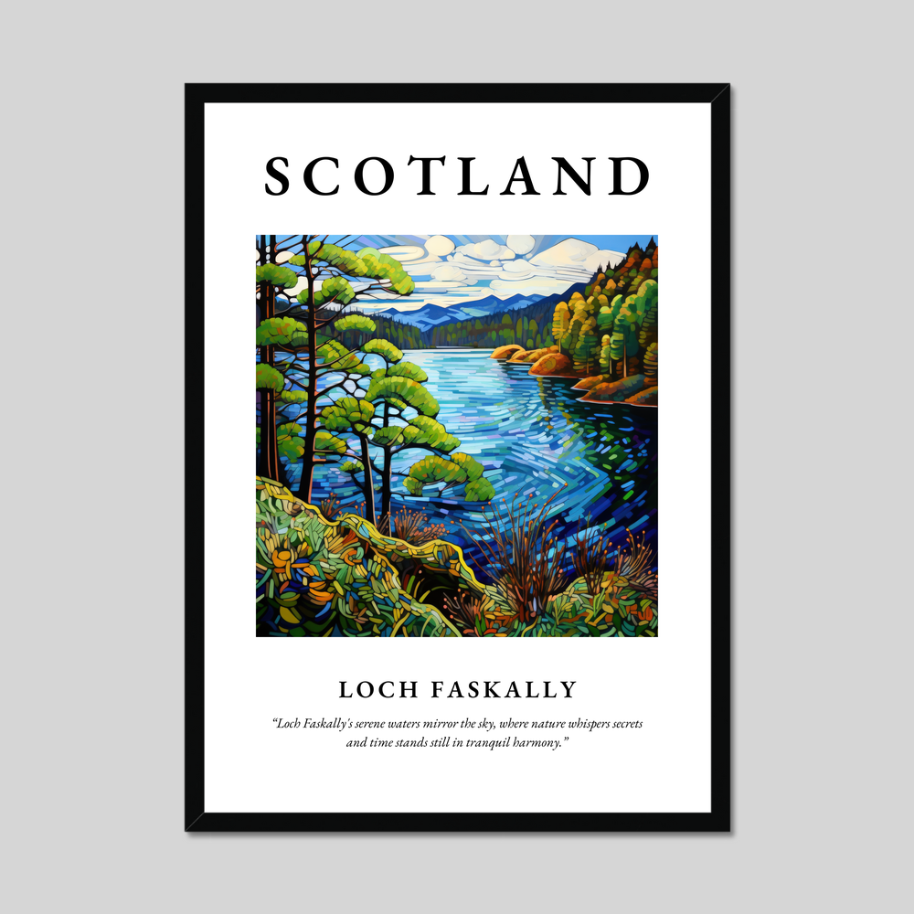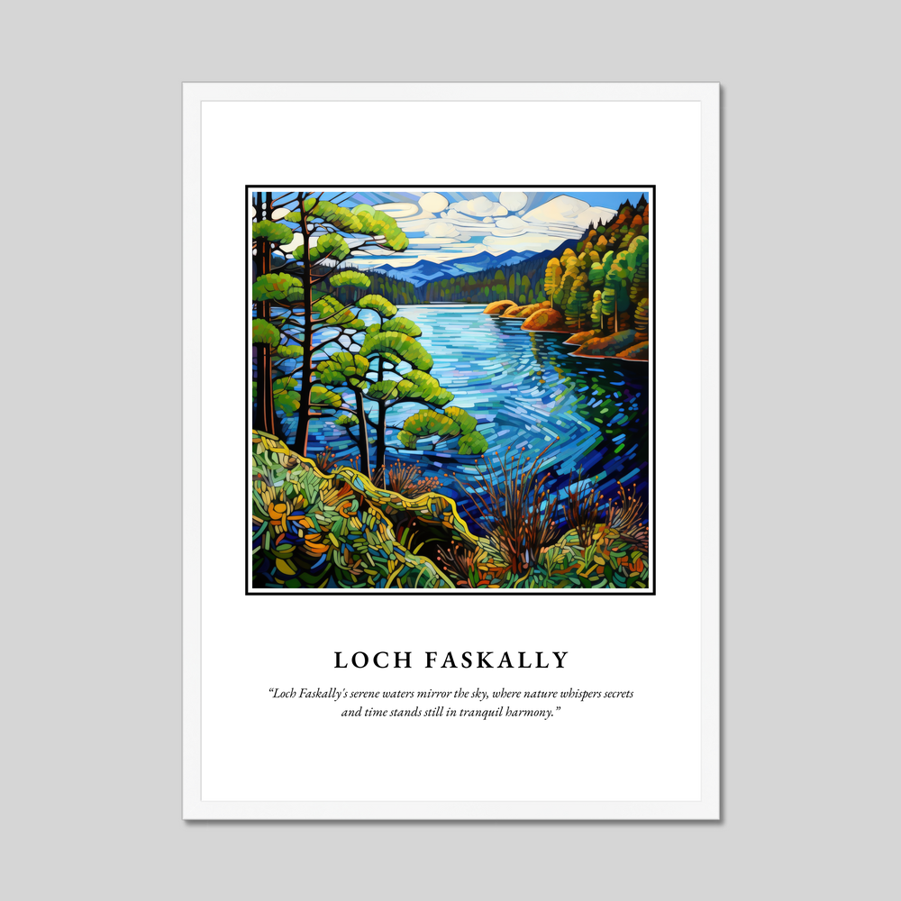 Every glance at this poster is a journey to the heart of Scotland's natural beauty. The naïve, vivid interpretation of Loch Faskally serves as a daily reminder of the stunning landscapes that await in this captivating region. Perfect for your living space, office, or as a thoughtful gift, this framed poster invites you to explore the serene and mystical essence of one of Scotland's most treasured lochs.