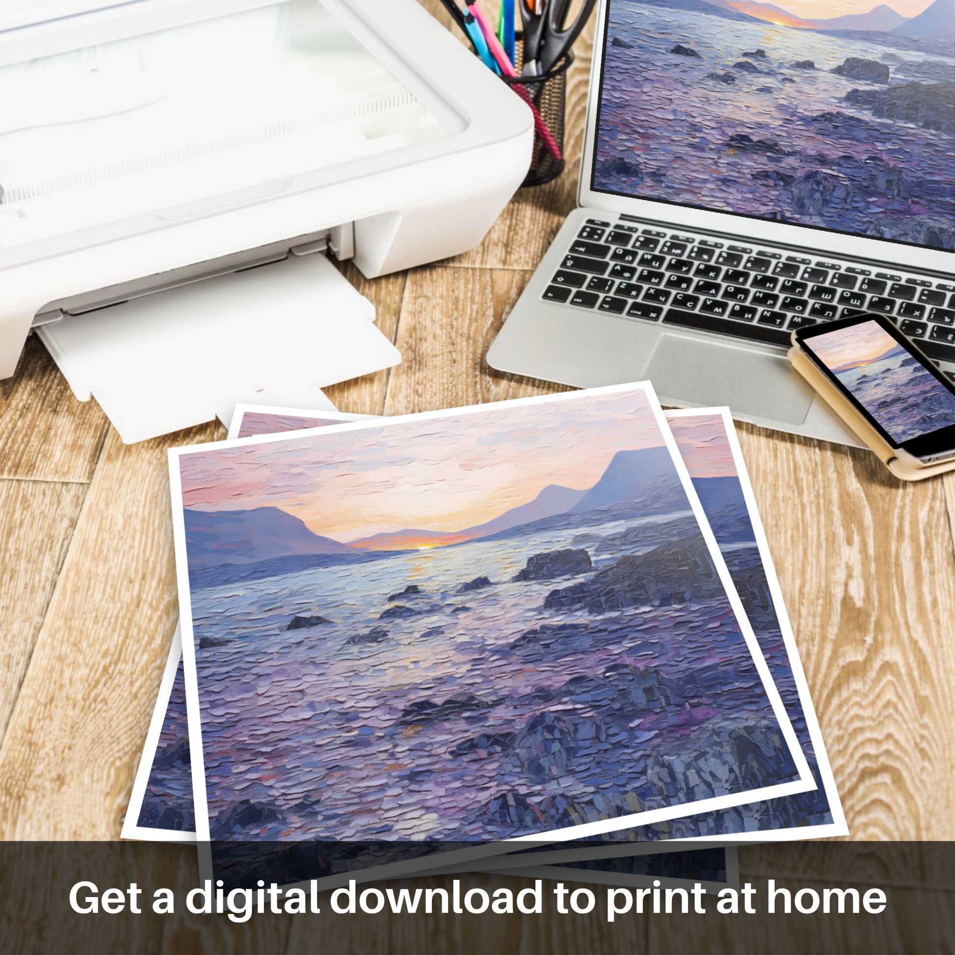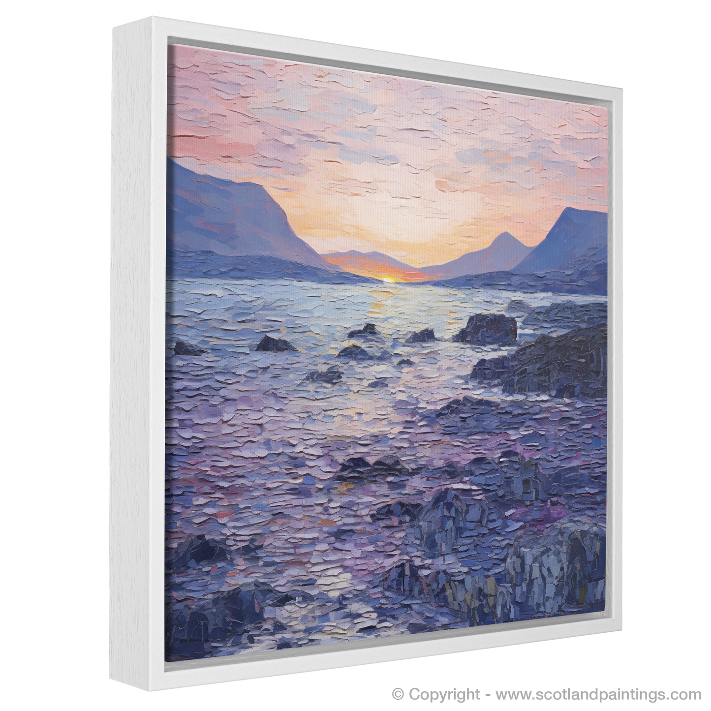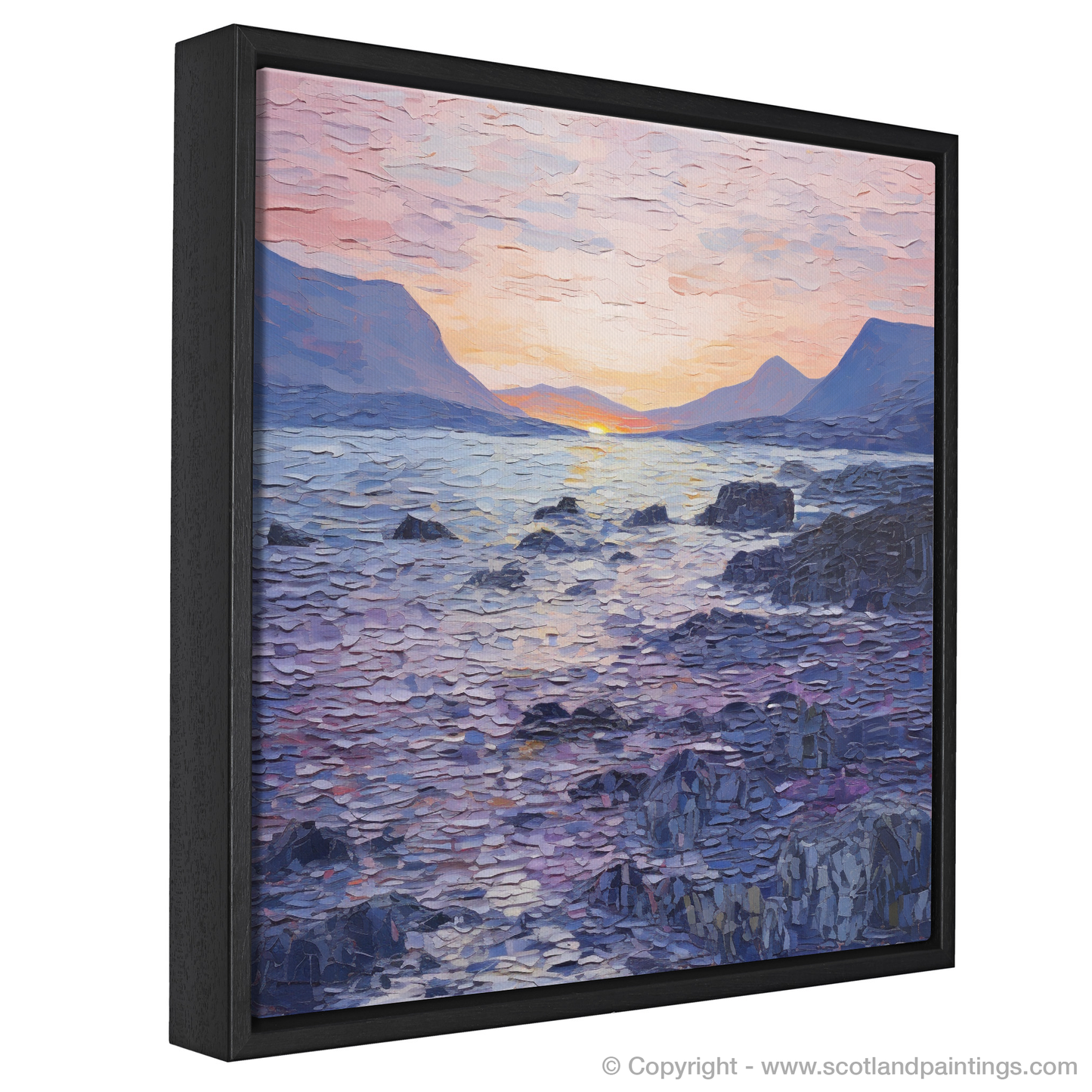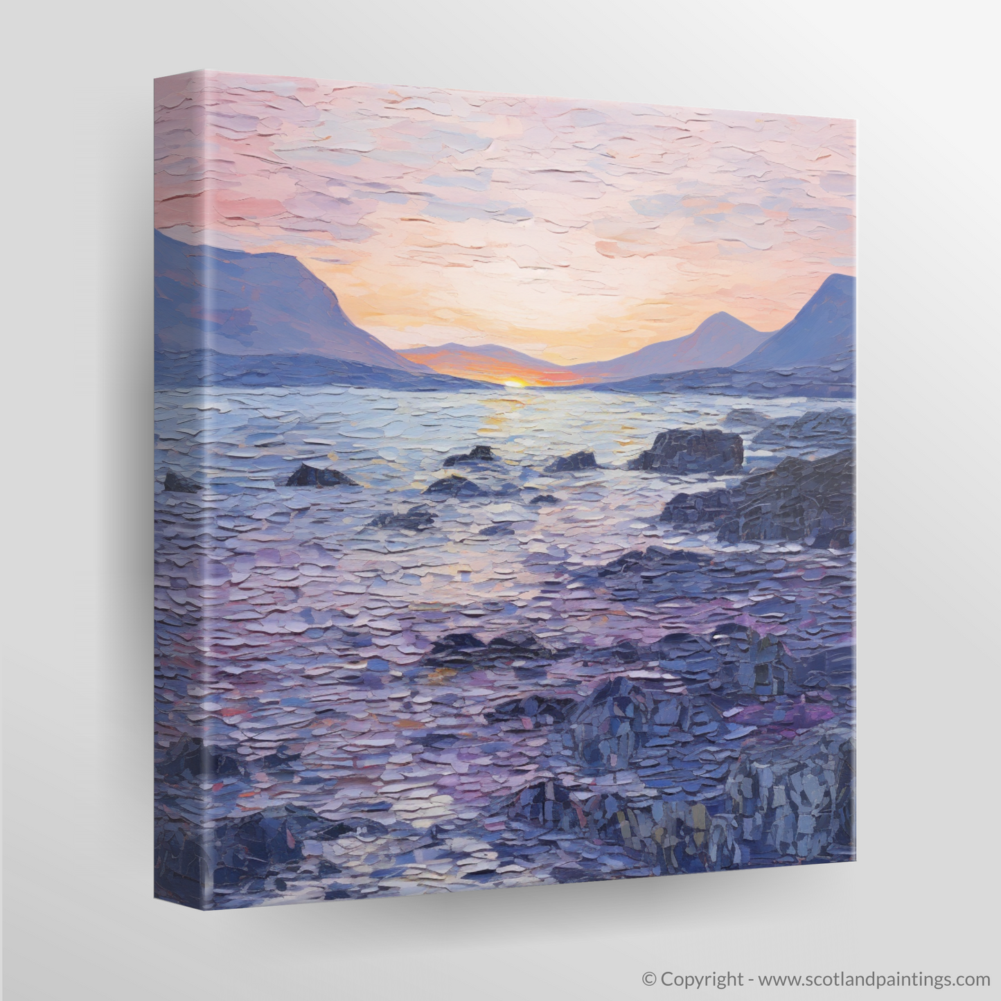 As dusk descends upon Elgol Bay, a serene symphony of colours unfolds across the canvas, inviting the viewer into a tranquil Scottish cove. This captivating piece features an impressive display of the Color Field style's essence, encompassing vast expanses of colour that evoke both the stillness and the gentle dynamism of nature's daily curtain call.