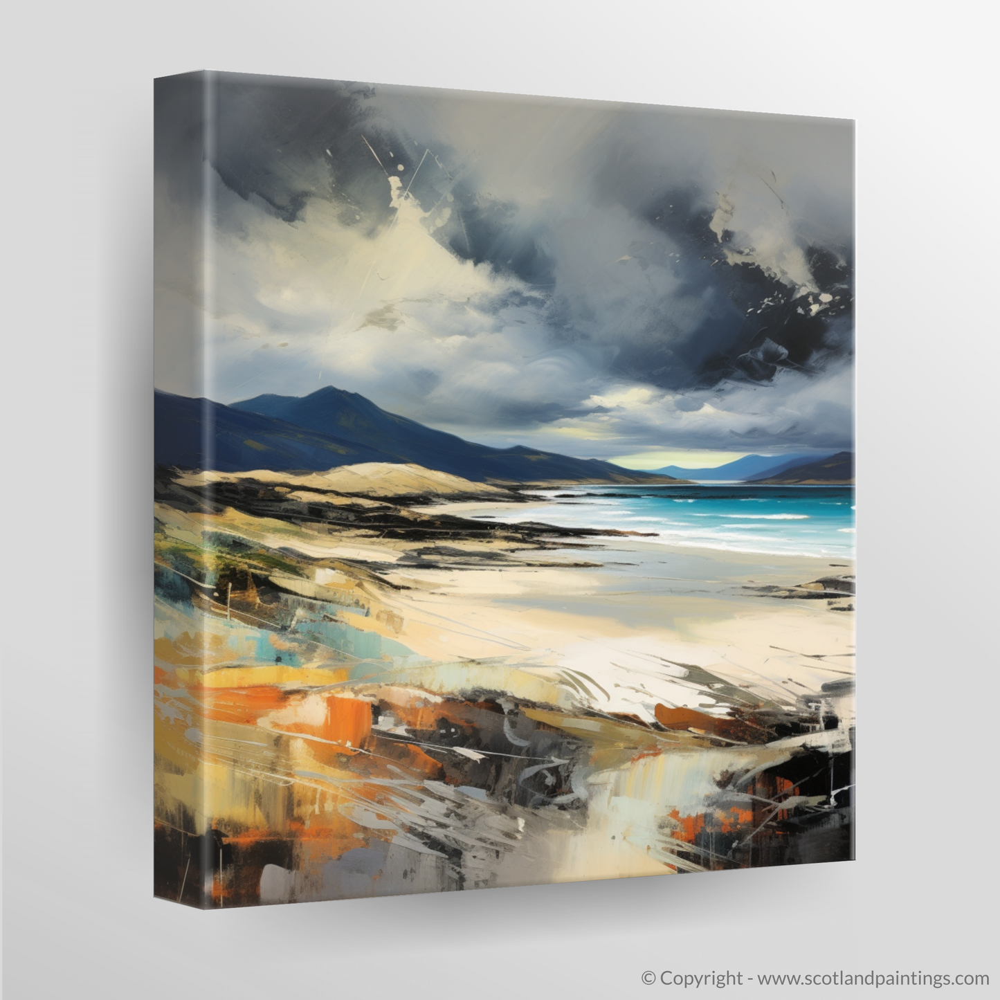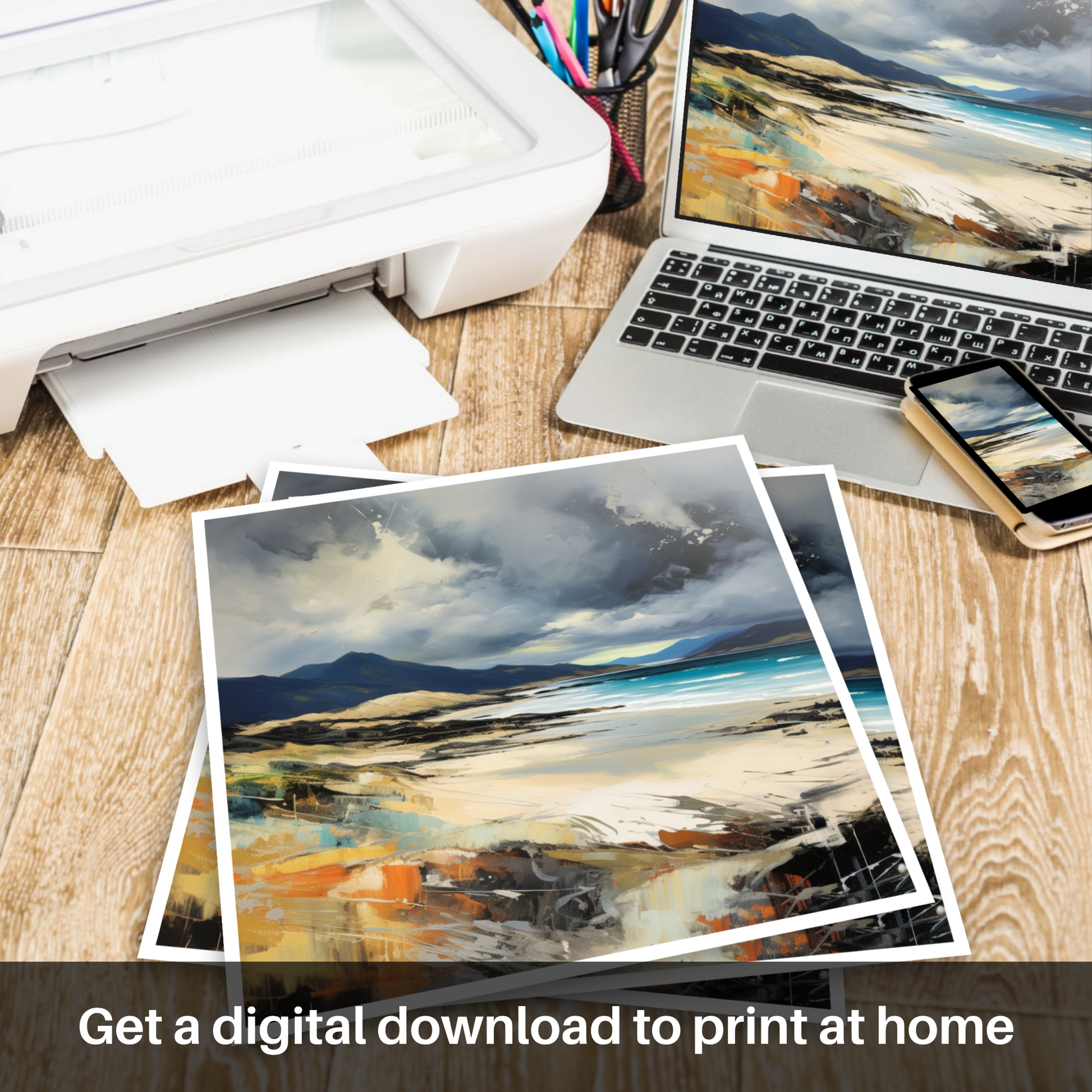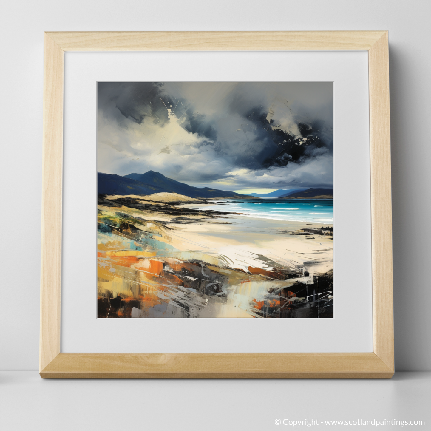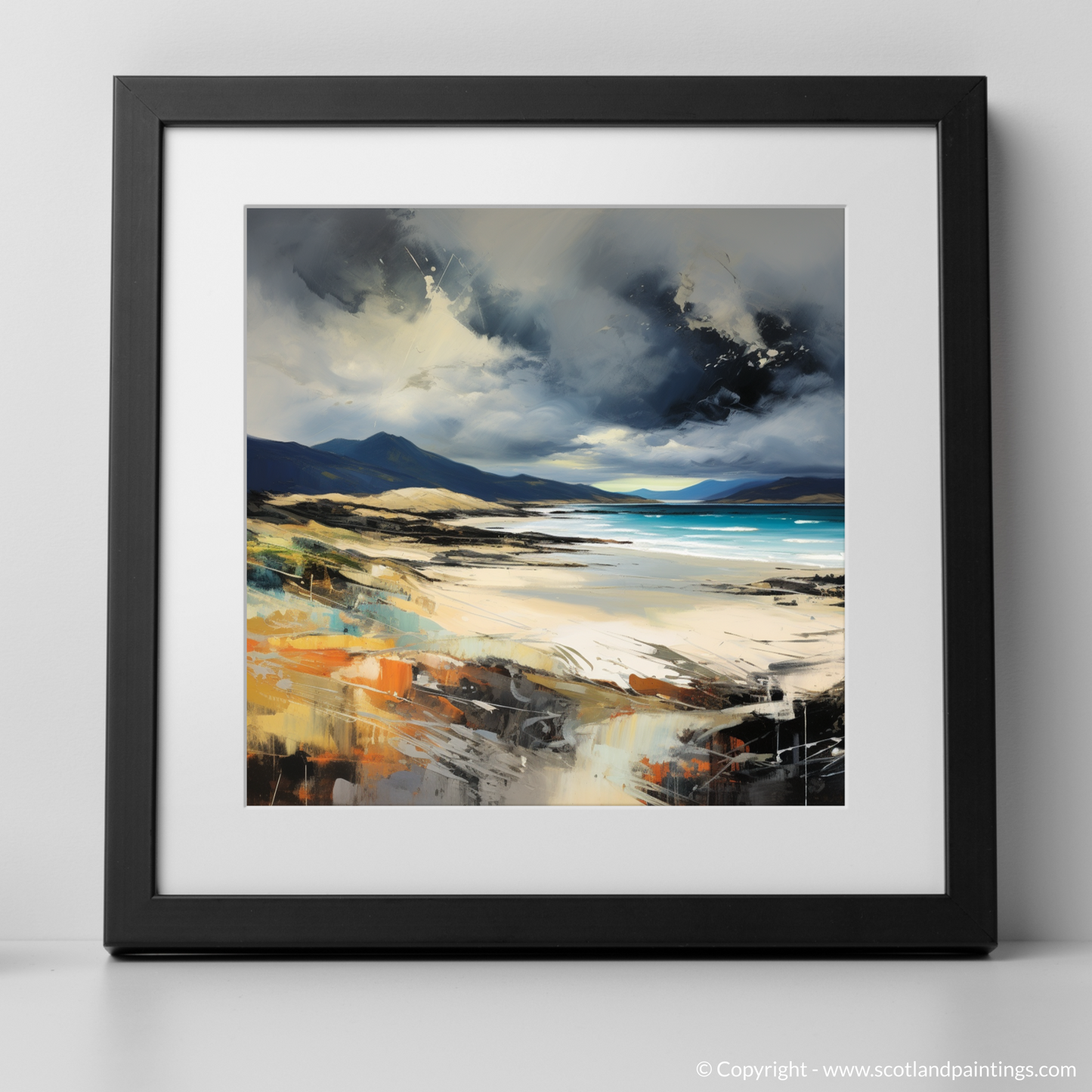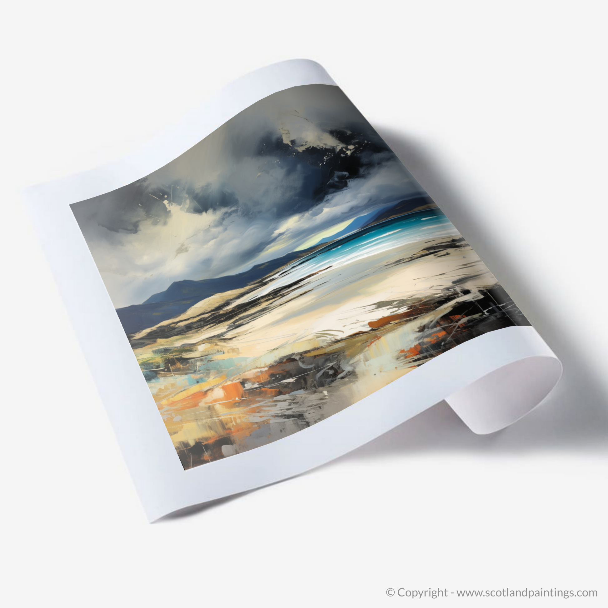 Emerging from the tempestuous heart of Scotland's raw beauty, this evocative piece captures the dramatic essence of Traigh Mhor. A tumultuous sky, heavy with the promise of a storm, broods over the sweeping shoreline, where the stark contrast between the dark clouds and the vivid azure of the sea creates a striking visual spectacle.
