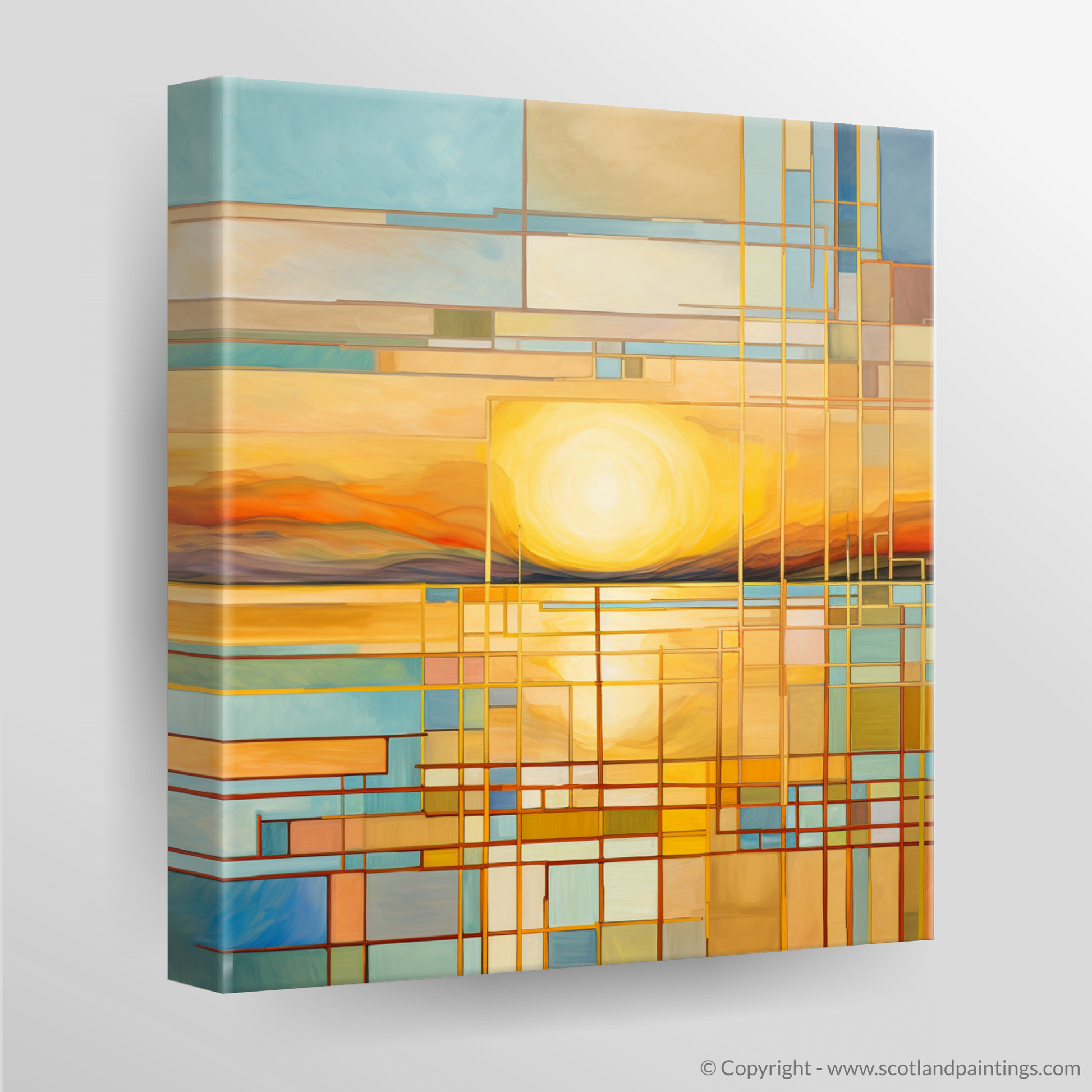 As the sun dips towards the horizon, casting a splendid array of colours over Calgary Bay, its reflection in this abstract rendition basks the senses in the glow of golden hour. Brushstrokes of amber, cerulean, and twilight mauve dance across the canvas in a symphony of light, earth, and water, segmented by bold but delicate geometric lines that add a sense of structure to the otherwise fluid natural landscape.