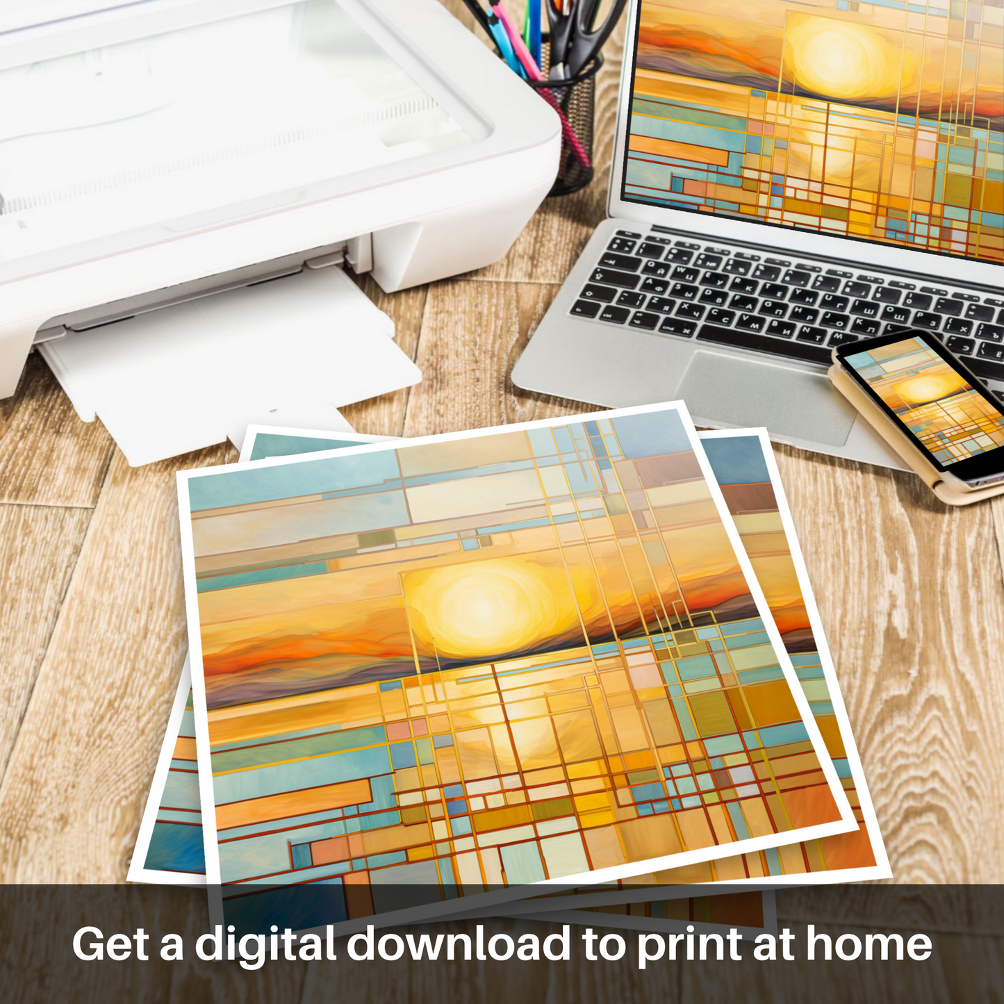 This print, belonging to our 'Scottish Beaches' collection, encapsulates the essence of this tranquil spot at a most enchanted time of day. Sheets of sky-blue and sandy taupe intersect with metallic gold hues, reflecting the way the last rays of sunlight playfully skim the surface of the sea and kiss the rugged coastline. Squares and rectangles frame snatches of the seascape, creating windows into moments of serene beauty.