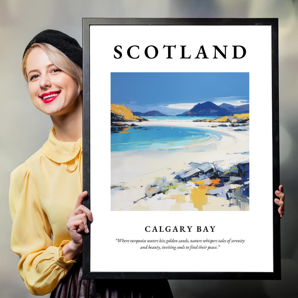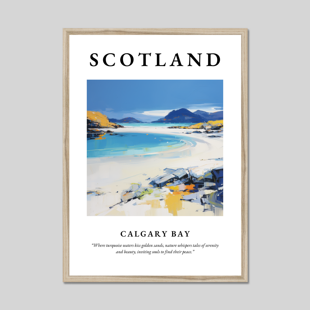 The bold declaration of "SCOTLAND" at the top welcomes you to a vivid portrayal of Calgary Bay, a visual oasis that invites you to explore its serenity. Beneath the painting lies an evocative quote: "Where turquoise waters kiss golden sands, nature whispers tales of serenity and beauty, inviting souls to find their peace." This message resonates deeply, echoing the tranquil allure of the bay itself.