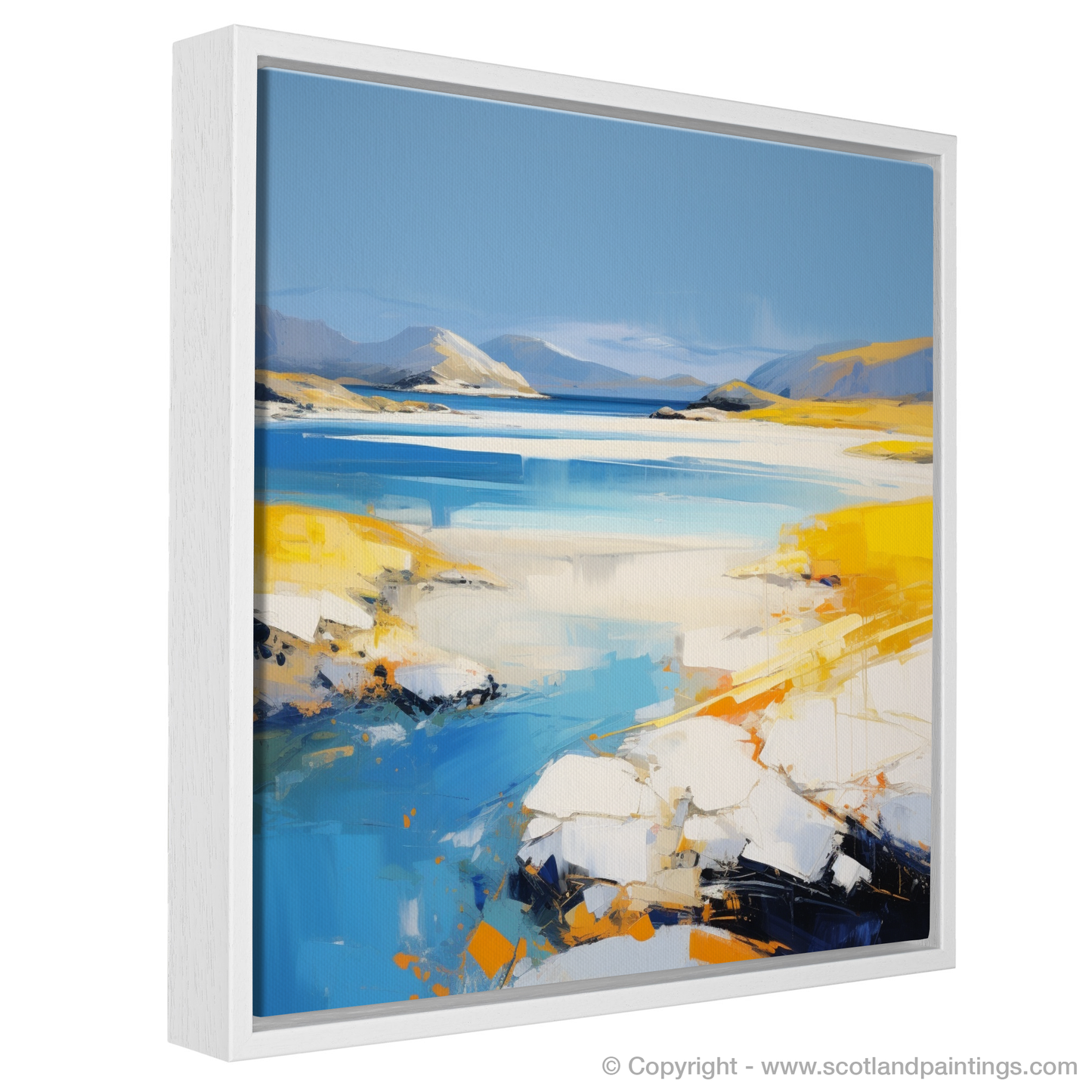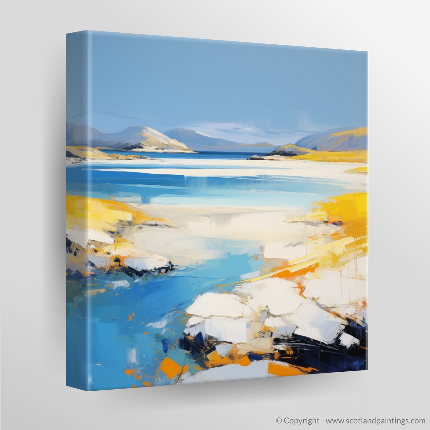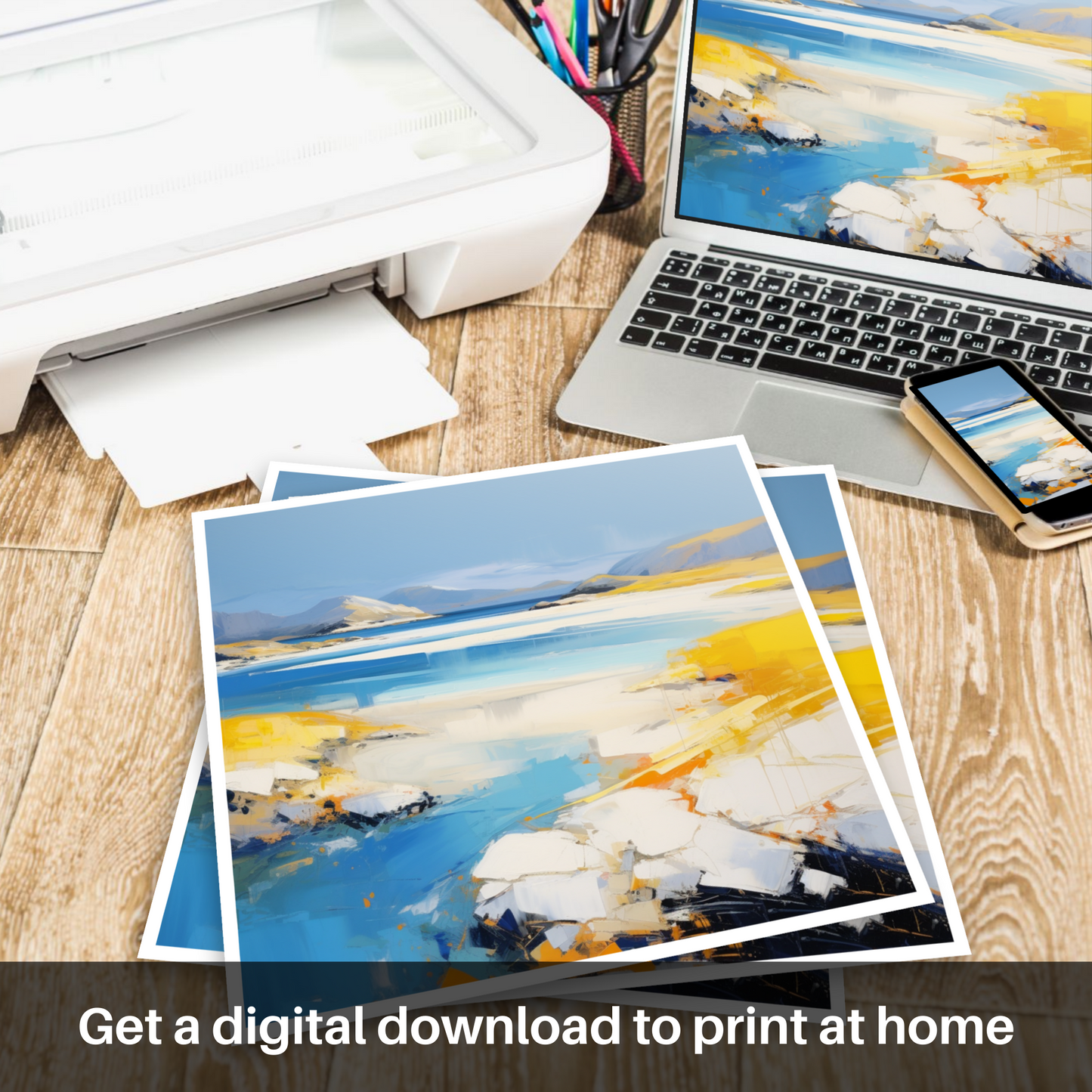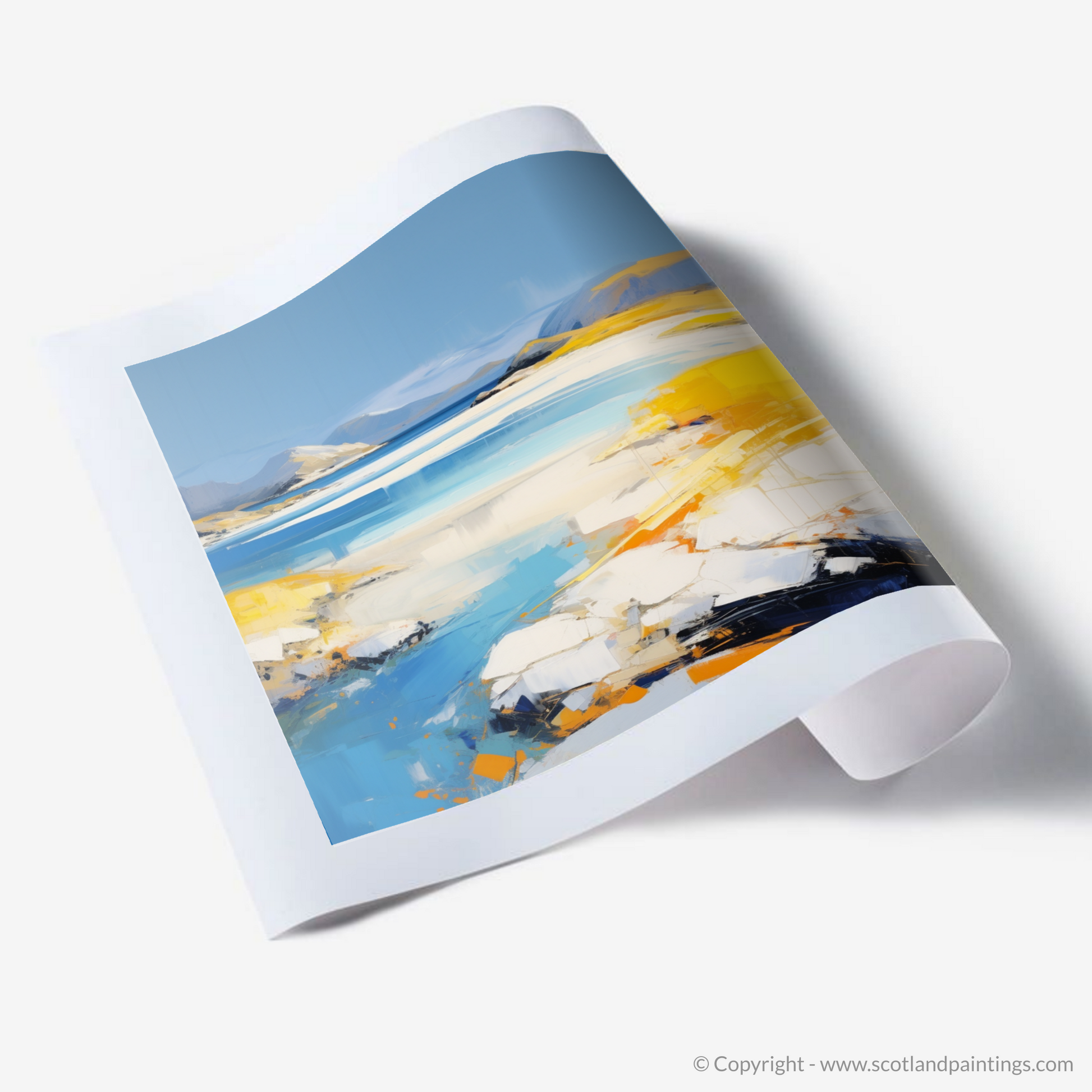 Drawing inspiration from the serene beauty of Calgary Bay, Isle of Mull, this vibrant contemporary piece captures the essence of Scottish coastal charm. With a palette of vivid yellows, soft whites, and refreshing blues, it conveys both the warmth of sunlit sands and the cool, tranquil waters so characteristic of Scotland's idyllic beaches. Broad, gestural brush strokes give the artwork a dynamic energy, while the abstracted forms encourage the viewer to engage with the scenery in a personal and imaginative way.