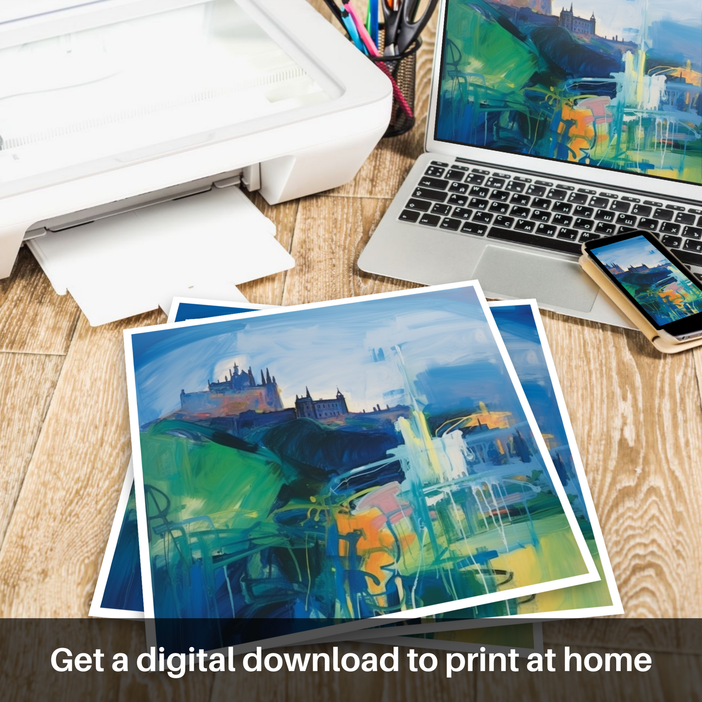 The artwork masterfully straddles the line between abstract and figurative, inviting a contemplation that is as personal as it is influenced by the unmistakable landmarks portrayed with bold impasto and ethereal glazes. This print offers a modern tribute to the timeless city of Edinburgh and is a must-have for admirers of both Scottish heritage and avant-garde art. Each viewing is a trip through the cobbled streets and verdant surrounds, a visual journey that promises to keep the viewer discovering and rediscovering the heart and soul of Lothian. Whether steeped in the nostalgia of past visits or inspiring dreams of future travels, this print will make a compelling centrepiece in any collection celebrating the spirit of Scottish Cities.
