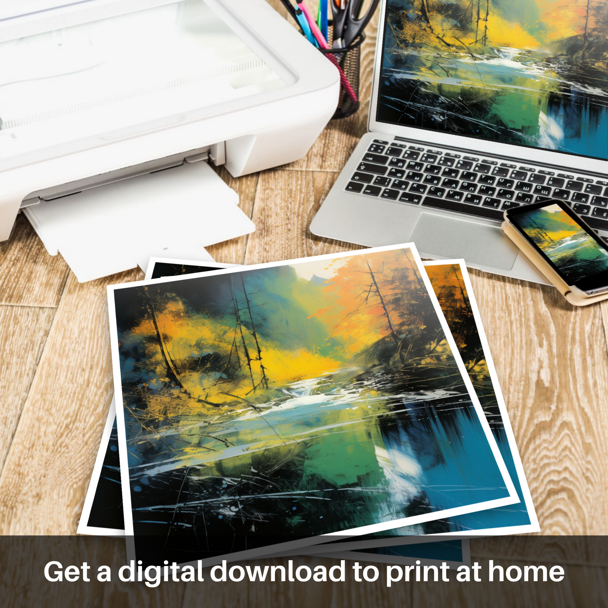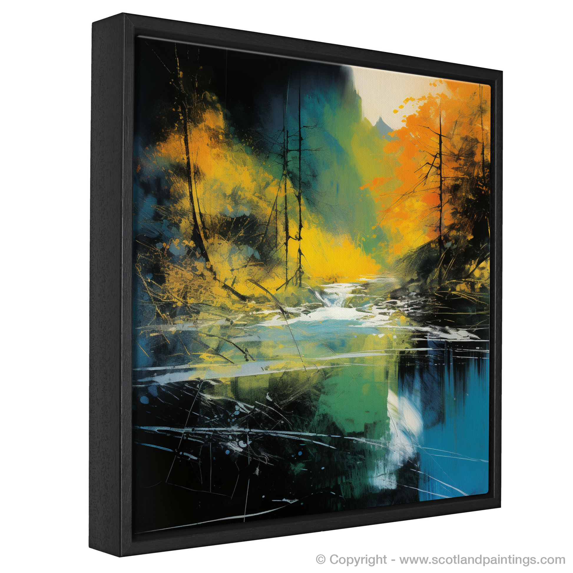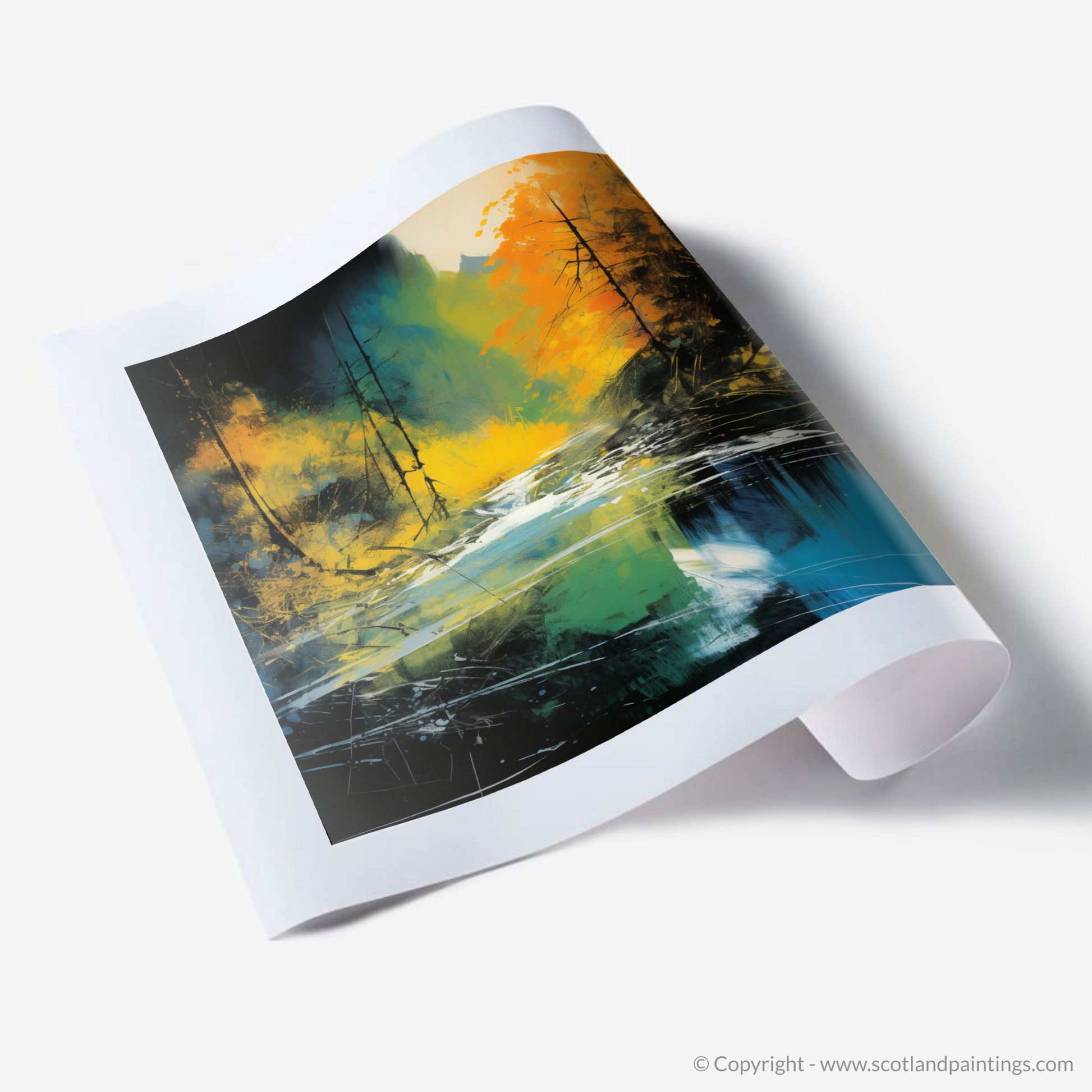 Immerse yourself in the vibrant allure of Scotland's natural beauty with our mesmerising abstract rendition of the River Lyon in Perthshire. This evocative print captures the dynamic essence of the river, interpreted through a vivid explosion of colour and form. Layers of rich ochre, deep blue, and vivid green come together to create a sense of movement that echoes the river's flowing waters, while shafts of sunlight seem to pierce through the paint, suggesting a break in the tree line above.
