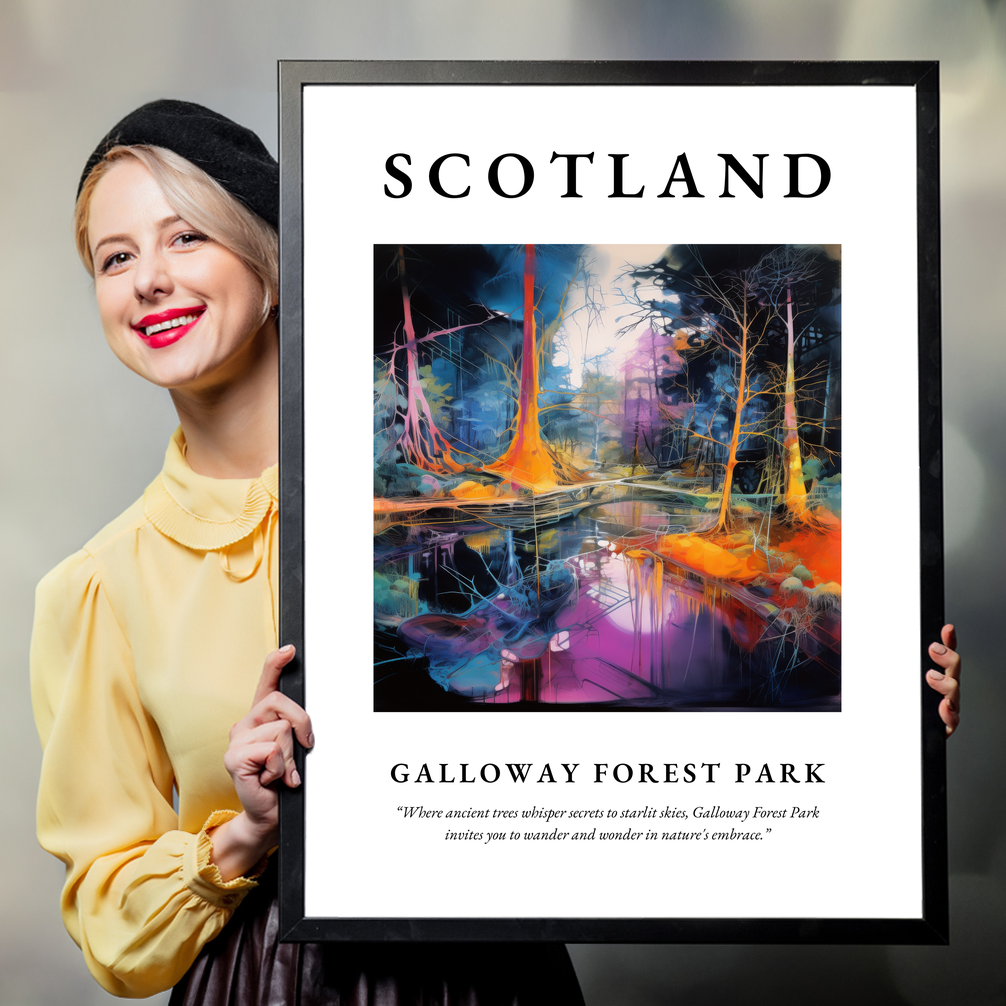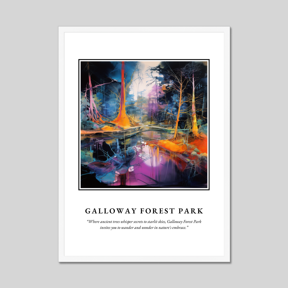 At the top, bold lettering proudly proclaims “SCOTLAND”, leading the gaze into a fantastical surrealism painting of Galloway Forest Park. Vibrant hues of blue and purple intertwine with fiery oranges, giving life to ancient trees dancing under ethereal skies. Beneath the painting, the evocative quote: “Where ancient trees whisper secrets to starlit skies, Galloway Forest Park invites you to wander and wonder in nature's embrace” invites introspection and adventure. Whether a cherished memory or a wild aspiration, this piece resonates with those who hold Scotland dear.
