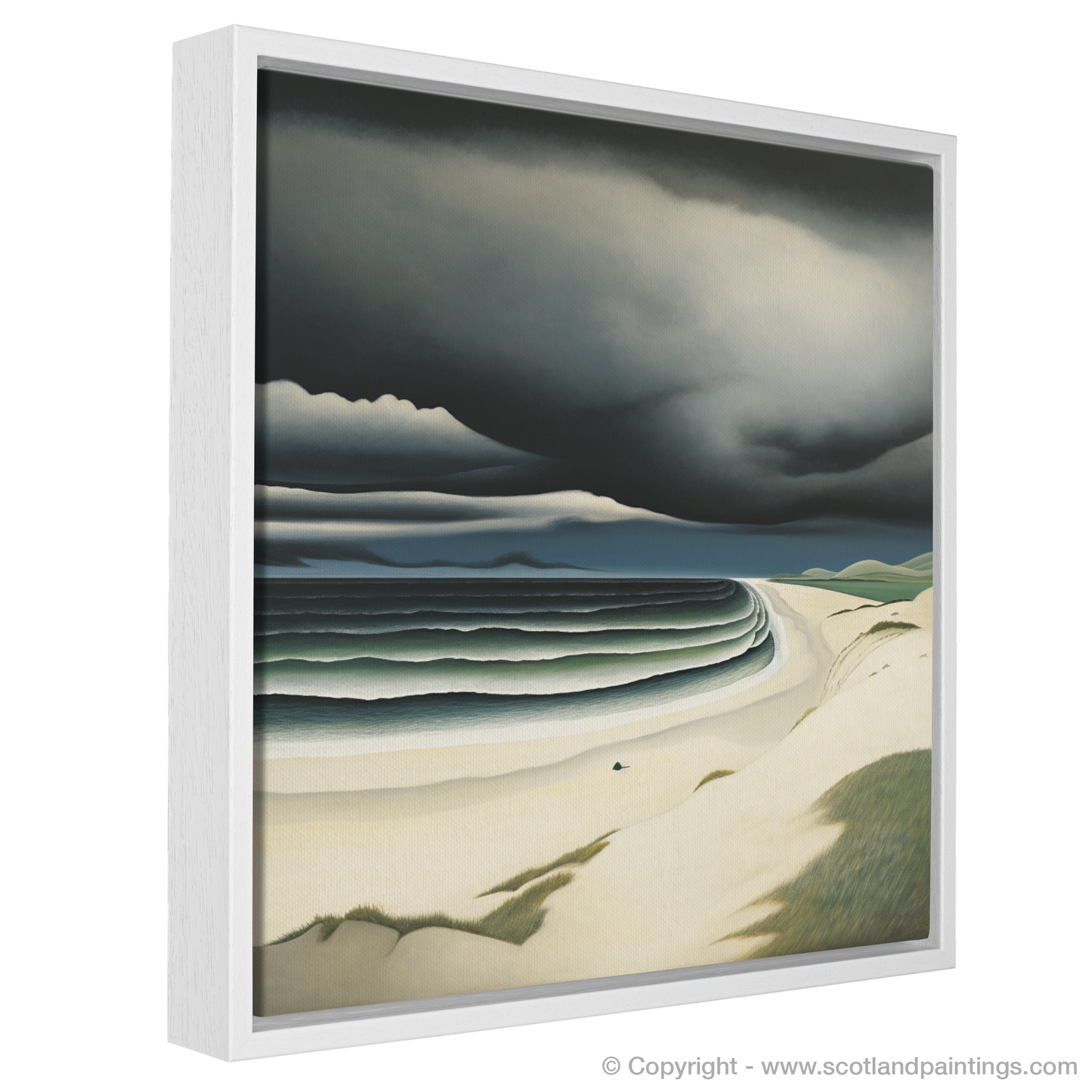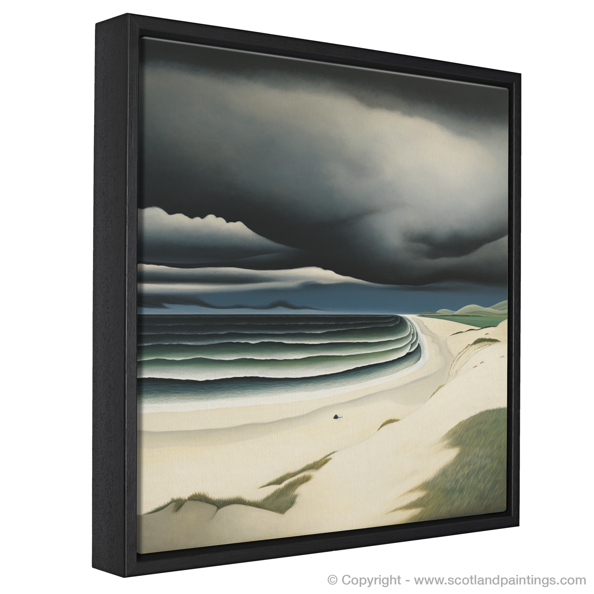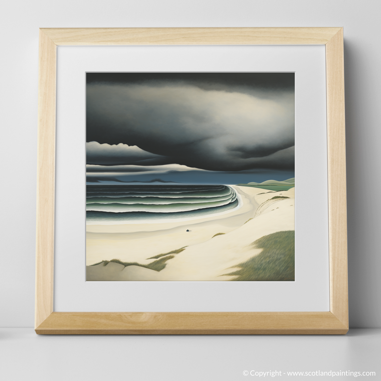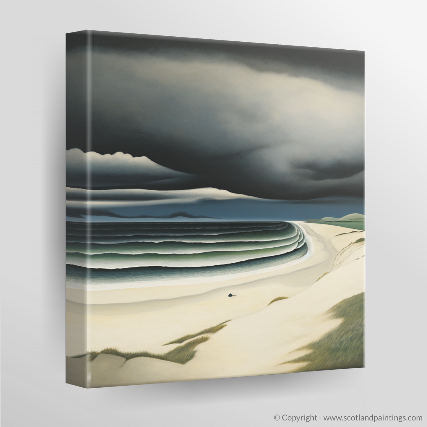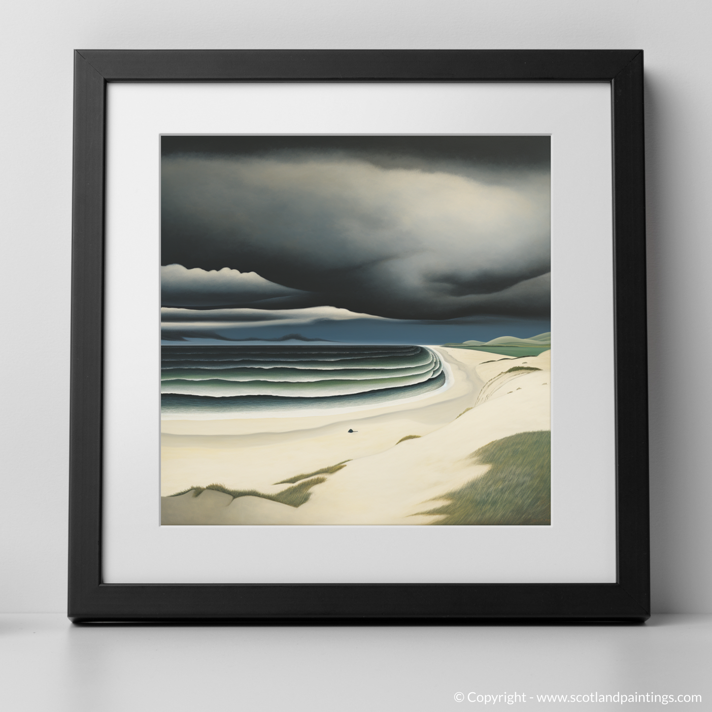 As if through the eyes of a dreamer, the beach is rendered with broad strokes in a palette of sandy beiges and creamy whites, contrasting strikingly with the opal-blue hues of the rolling waves. The piece is dominated by an imposing storm-swept sky, brimming with tumultuous shades of inky grey and shadowy black, that seems to almost press down on the serene beach below.