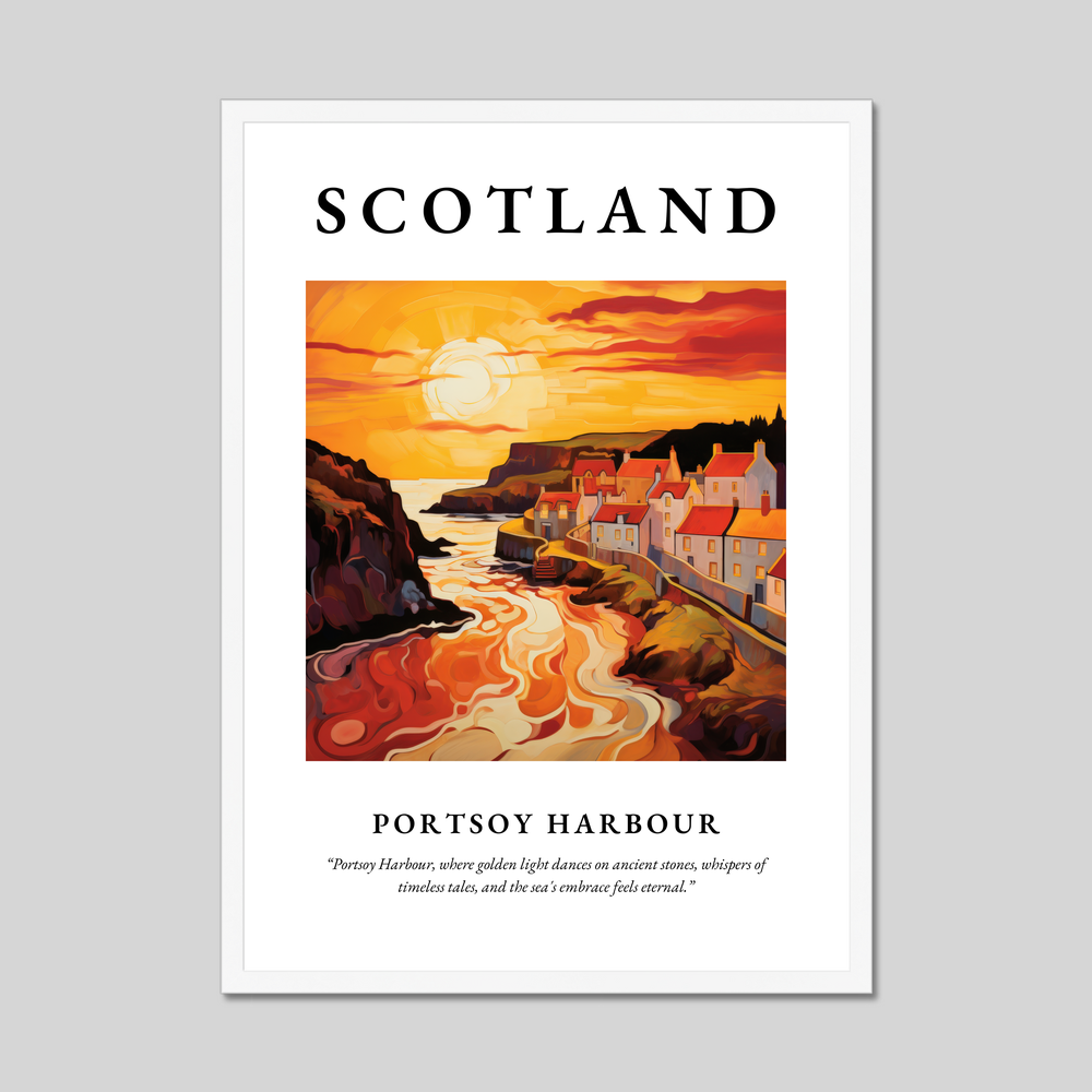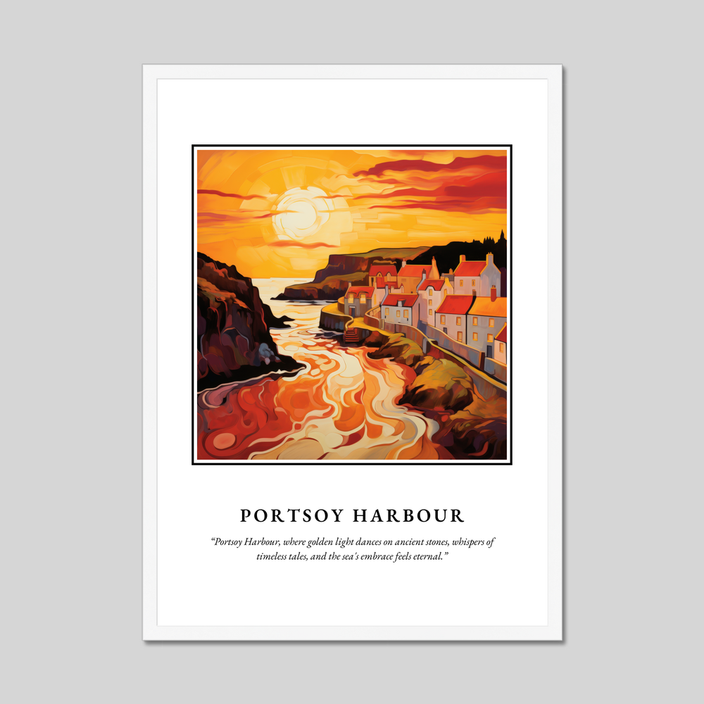 The bold lettering of "SCOTLAND" at the top draws you into the masterpiece below, an abstract interpretation of Portsoy Harbour. Waves of vivid colours capture the essence of the setting sun casting golden hues across the timeless stones of the harbour. The artist's abstract style invites you to immerse yourself in the scene's warm embrace, where swirling shapes and rich tones convey the sea's eternal dance with the land. Beneath the artwork, a poetic line whispers, "Portsoy Harbour, where golden light dances on ancient stones, whispers of timeless tales, and the sea's embrace feels eternal.”