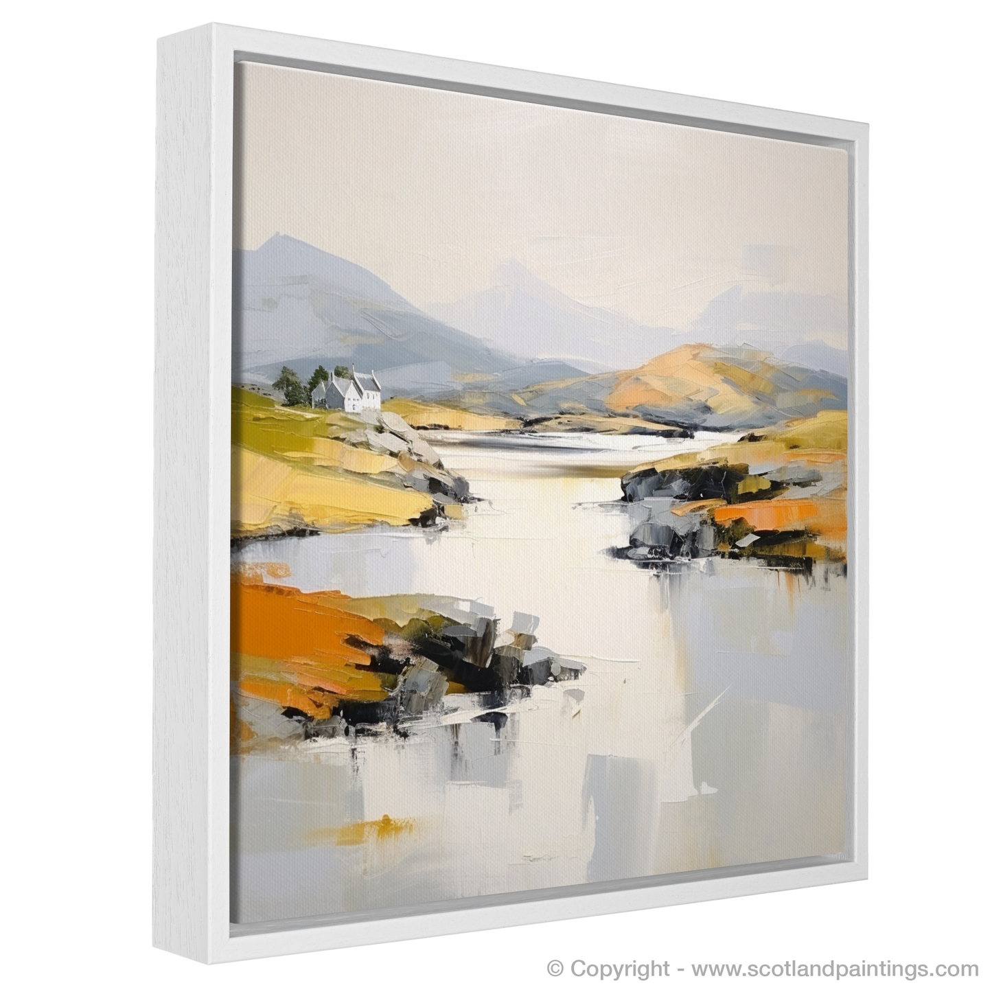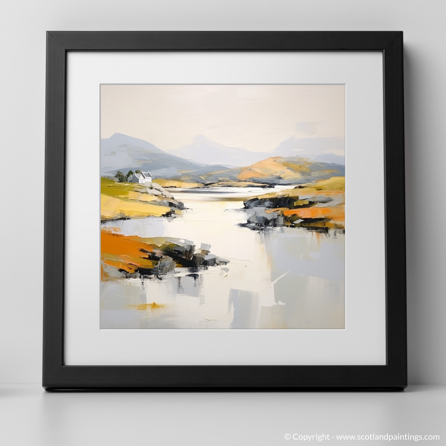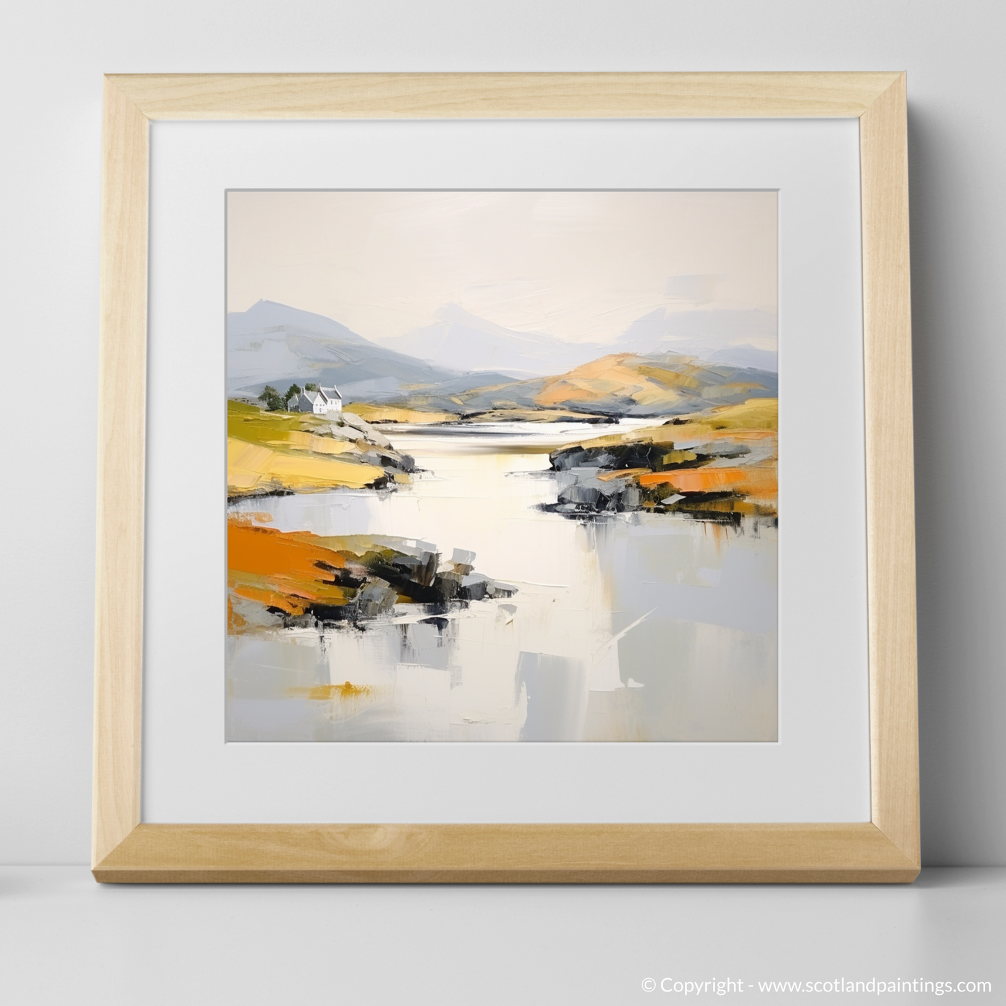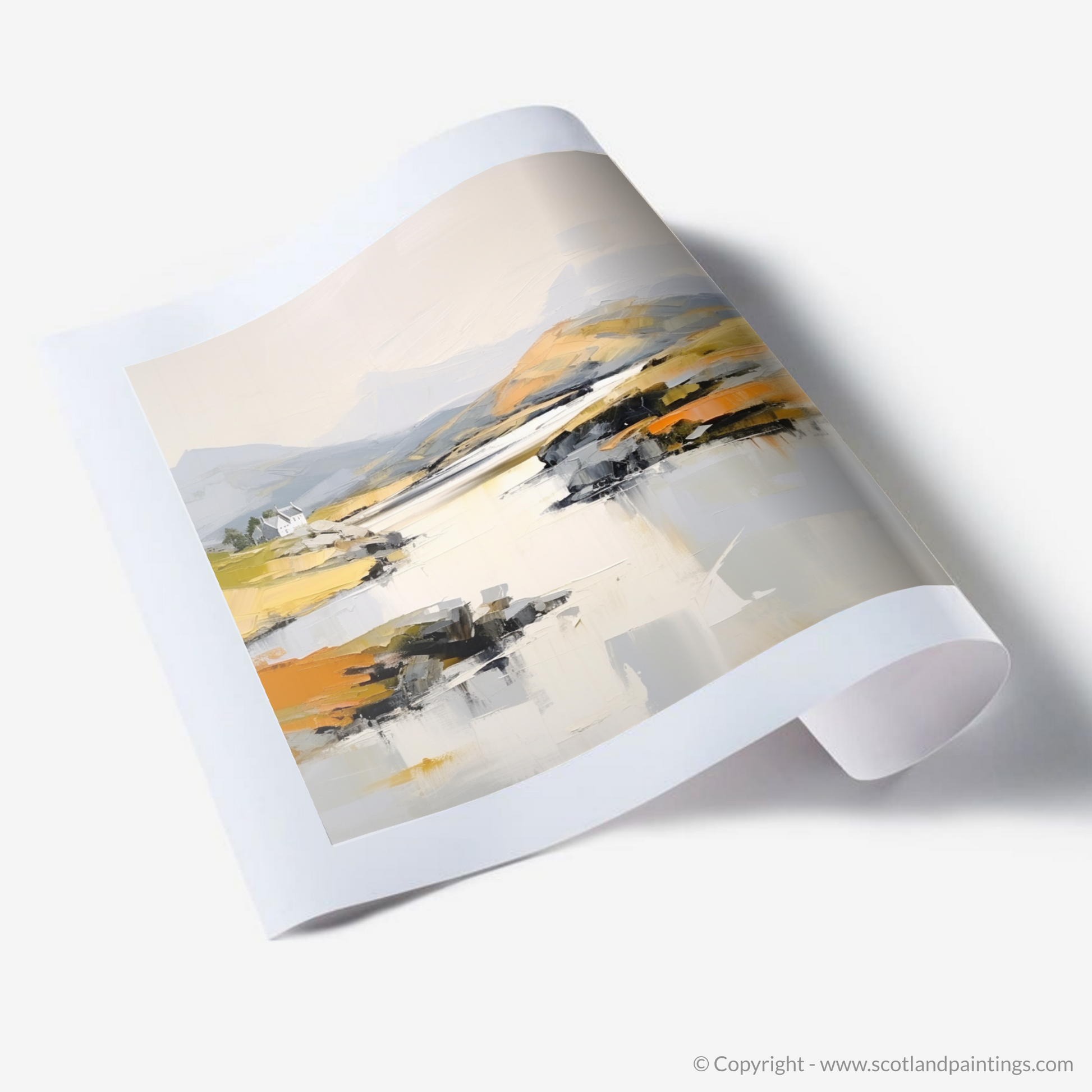 Step into the serene highland embrace with this exquisite minimalist portrayal of Lochinver, a piece that distills the essence of the Scottish village charm into soothing tones and subtle textures. Captured in a delicate dance of light and shadow, the print invites you to experience the tranquility of Sutherland's landscapes, distilled to its purest artistic form.