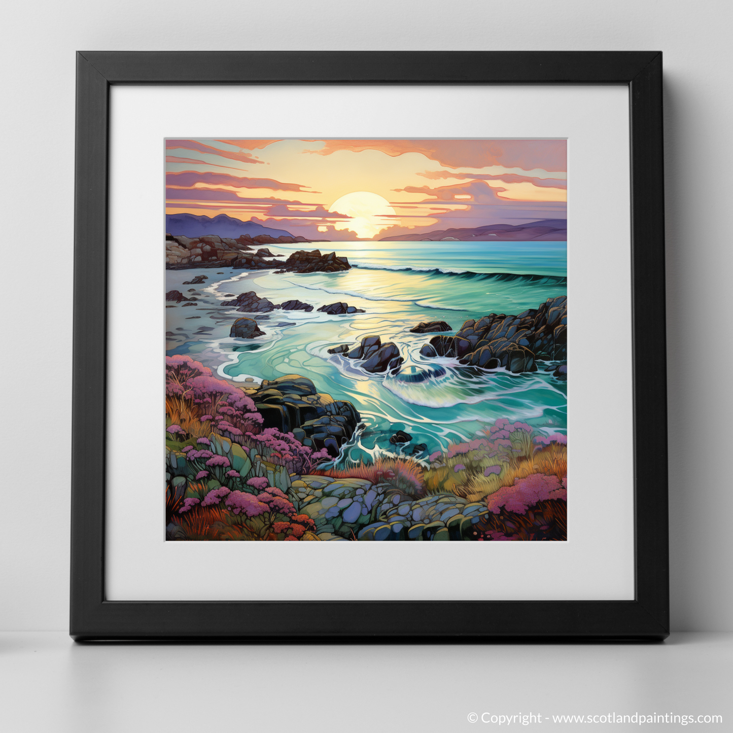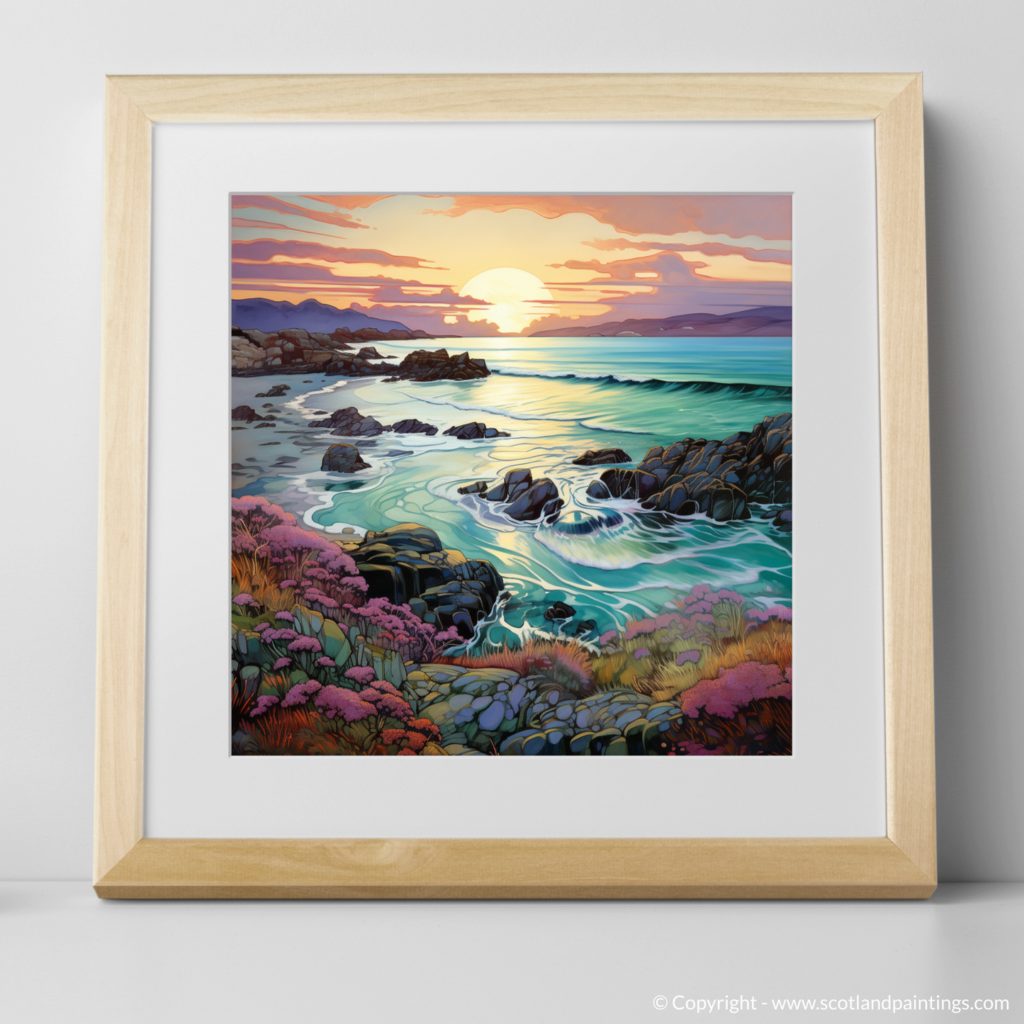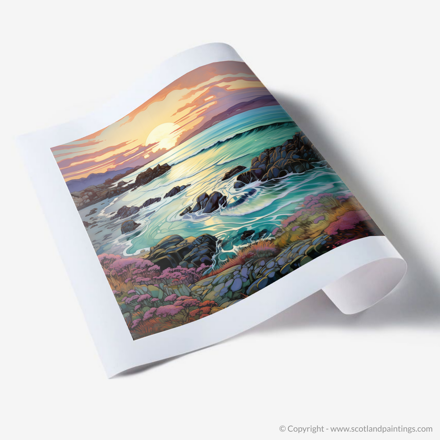 Immerse yourself in the tranquil beauty of a Scottish cove at the close of the day with this exquisite Art Nouveau-inspired piece. Capturing Lochinver Bay bathed in the warm glow of a setting sun, each print evokes the unique serenity of the Scottish Highlands.
