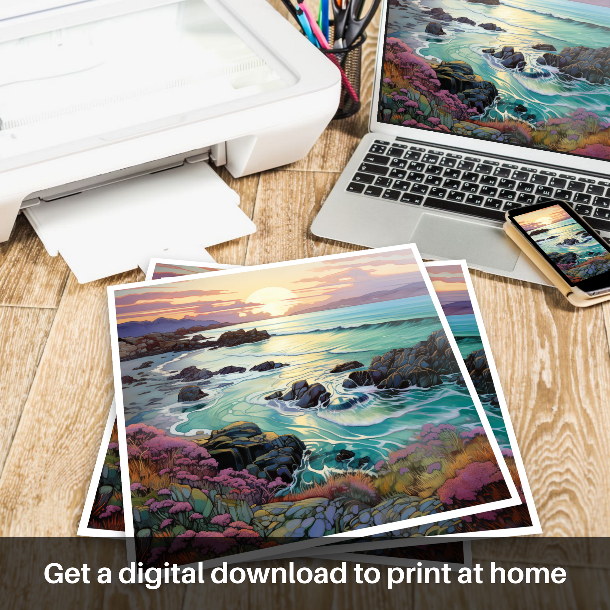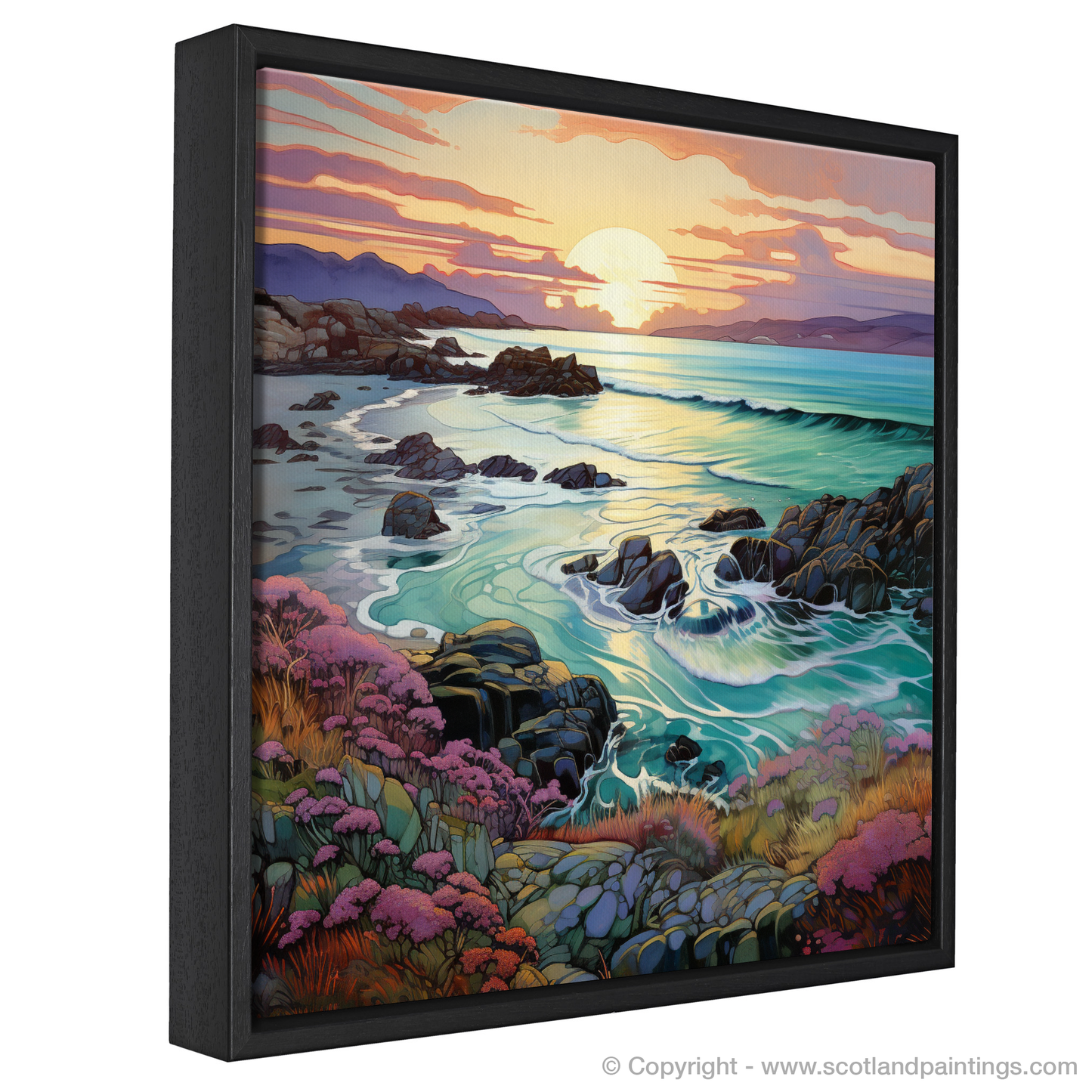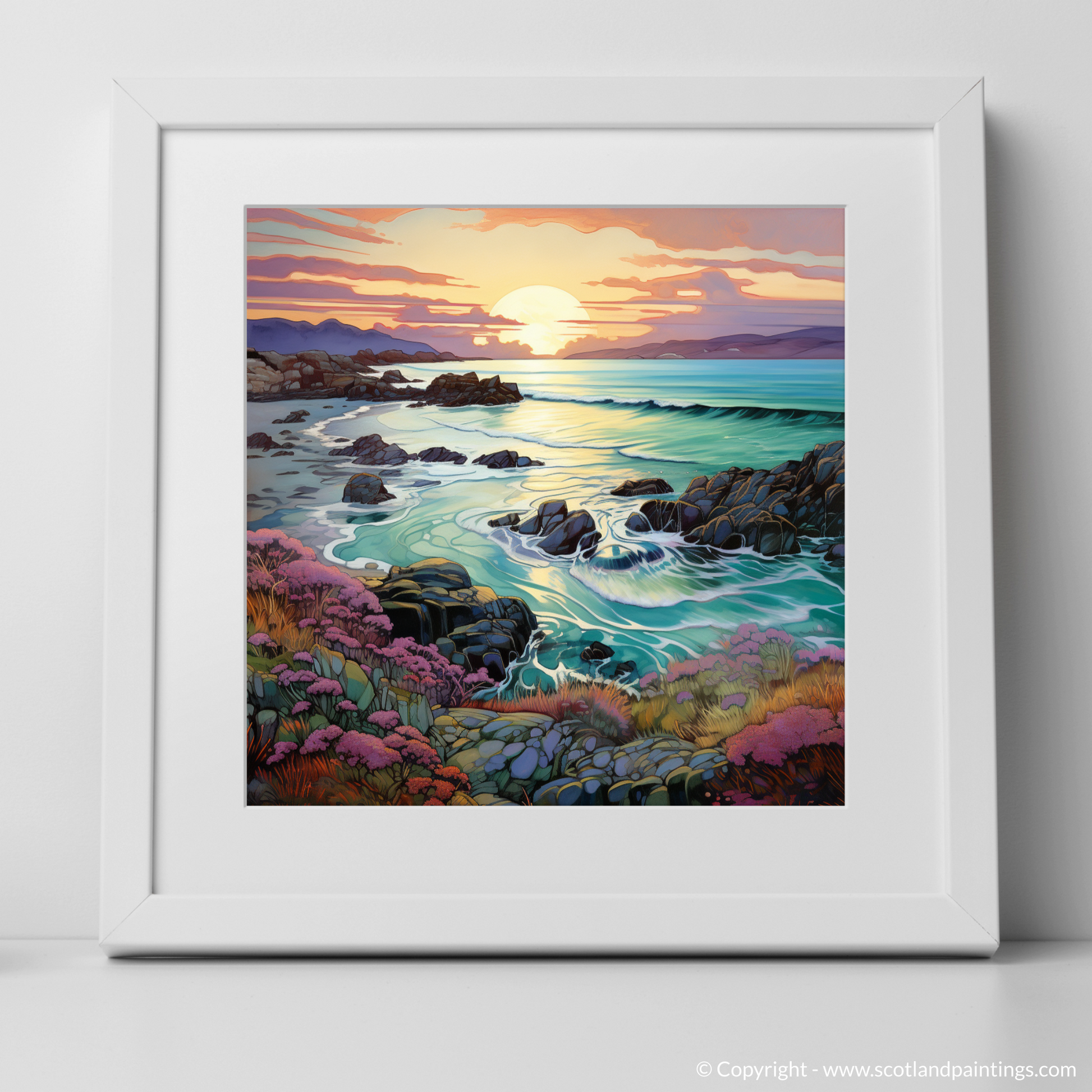 Immerse yourself in the tranquil beauty of a Scottish cove at the close of the day with this exquisite Art Nouveau-inspired piece. Capturing Lochinver Bay bathed in the warm glow of a setting sun, each print evokes the unique serenity of the Scottish Highlands.