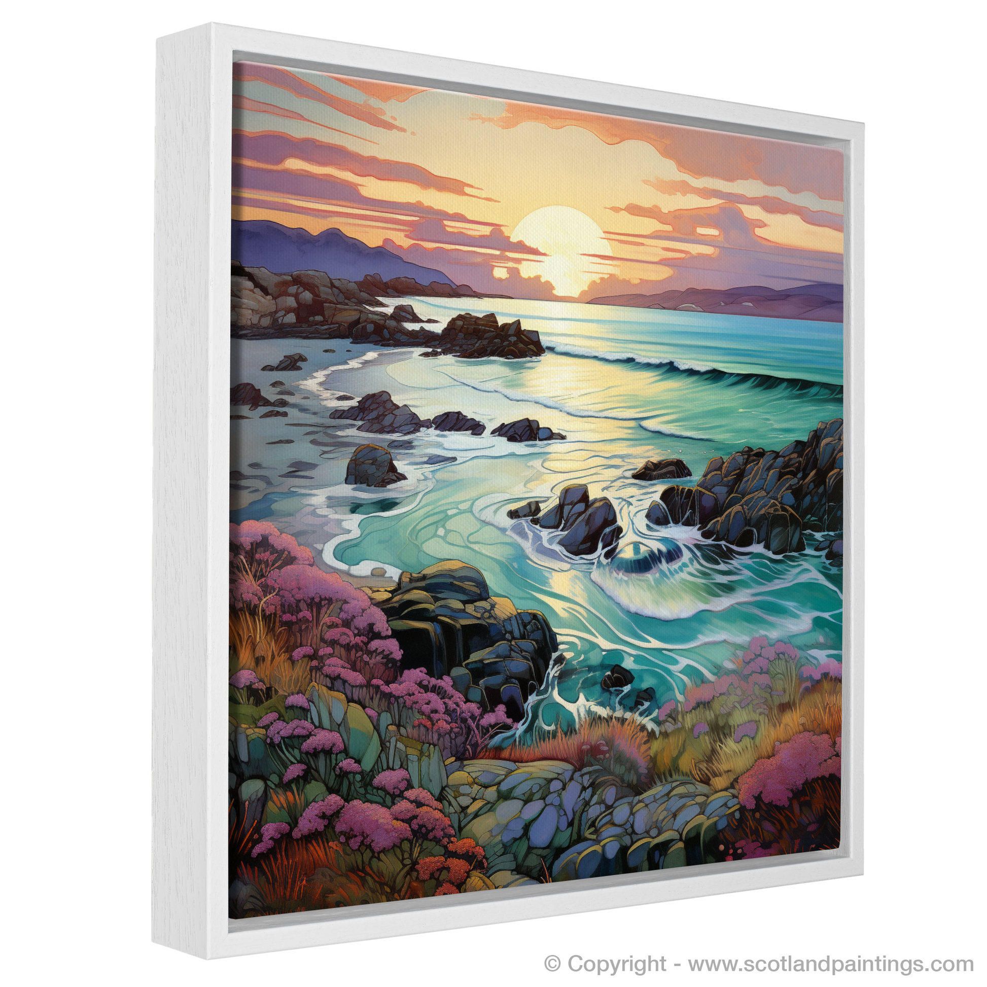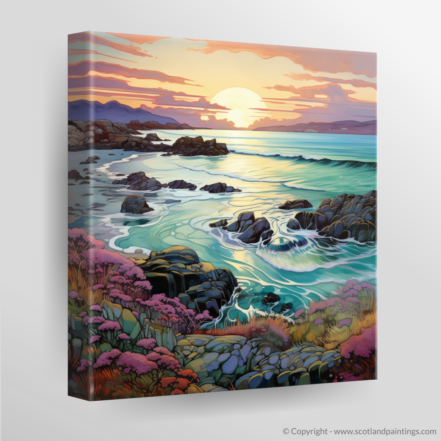 In the foreground, the Scottish landscape is alive with the delicate vibrancy of heather and wildflowers, their shades of pink and purple lending a soft, painterly touch to the rugged coastline. The interplay of light and colour is masterfully rendered, transporting the viewer to a serene moment frozen in time.