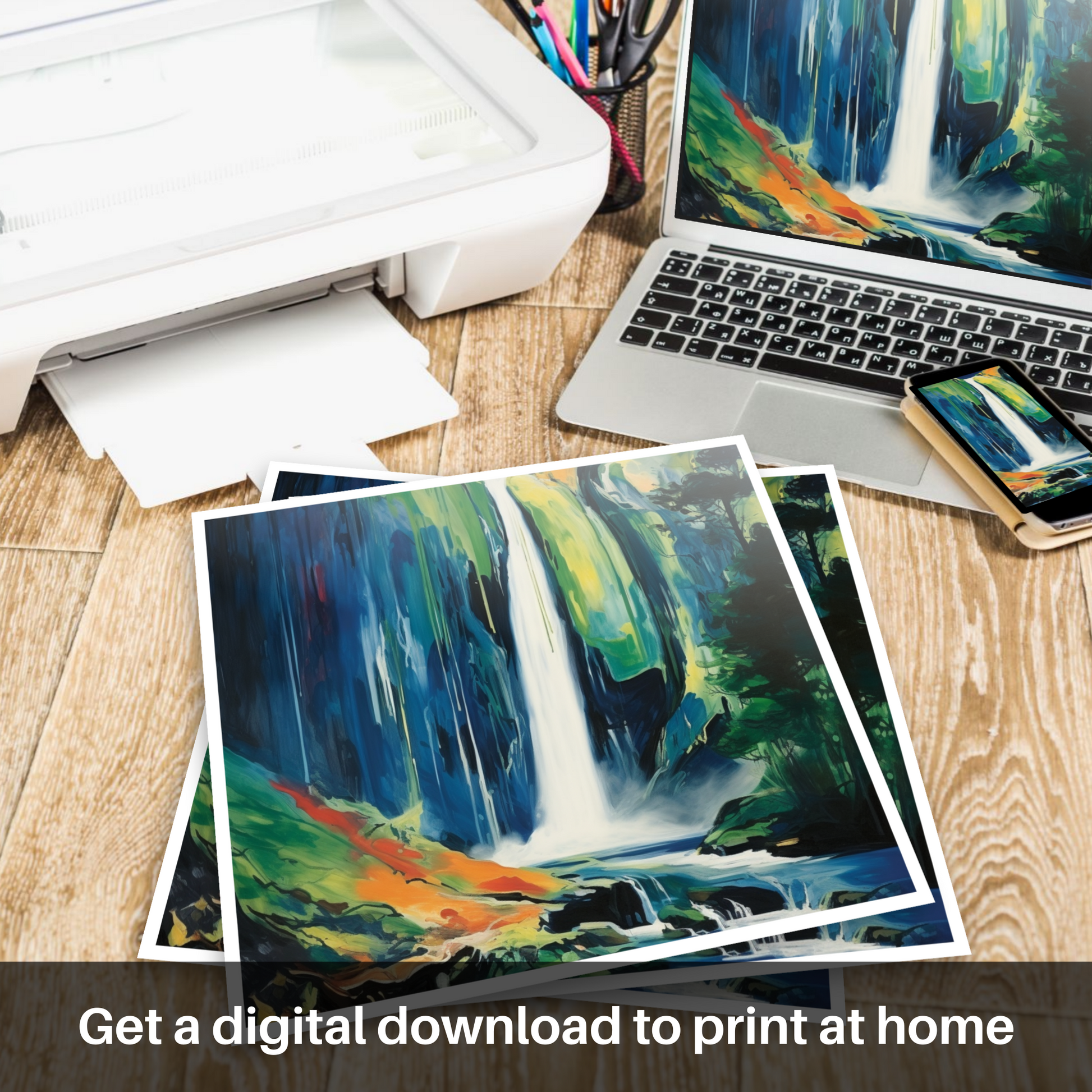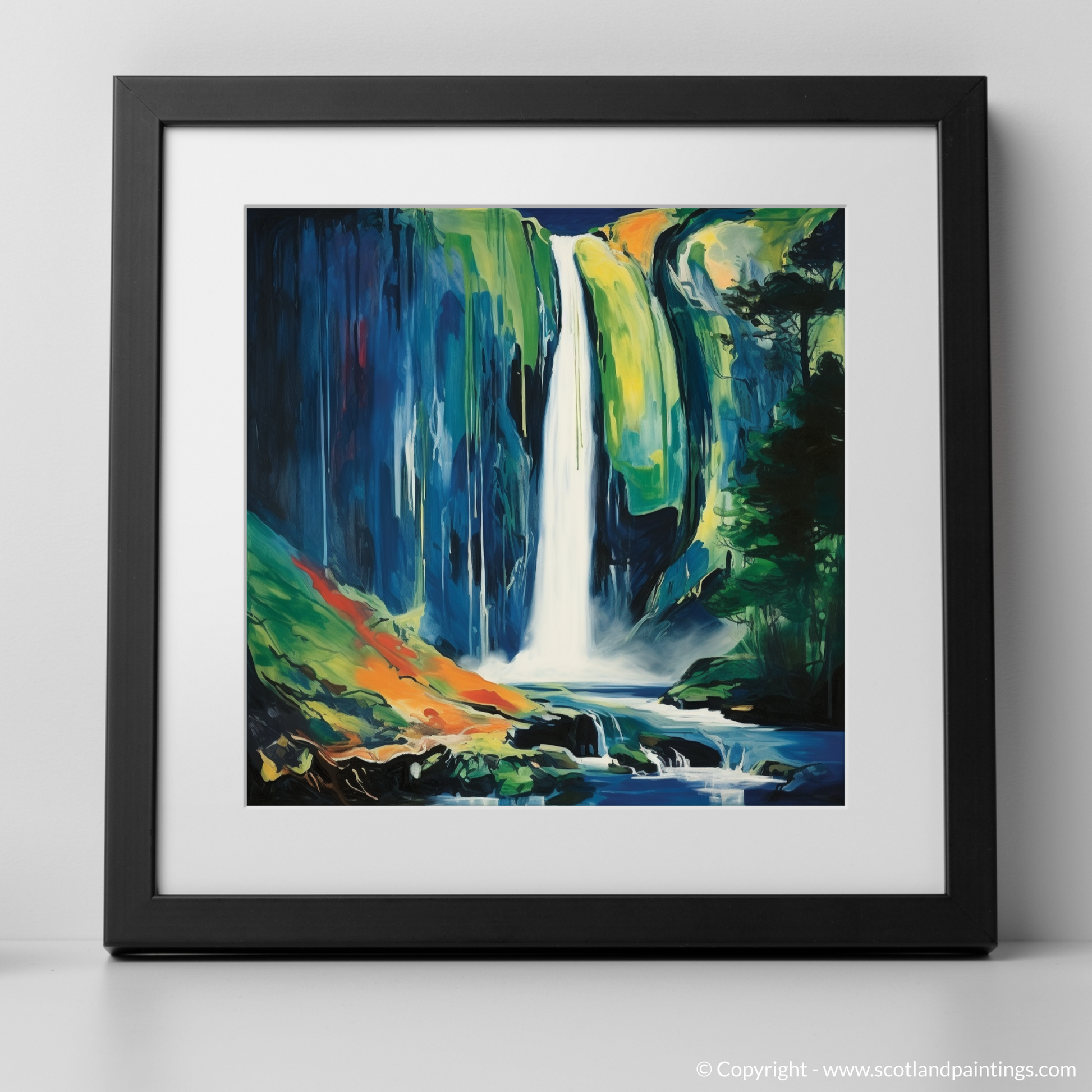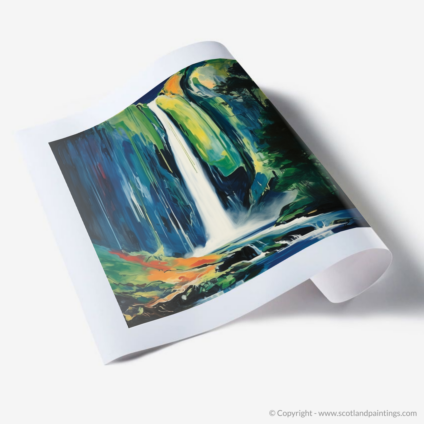 The fluidity of the waterfall is rendered with a minimalist yet dynamic approach, illustrating the power and grace of water in motion. This print is an aesthetic delight for those who yearn for a piece of nature's untouched beauty within their own space, evoking a sense of peace and awe inspired by one of Scotland's hidden gems.