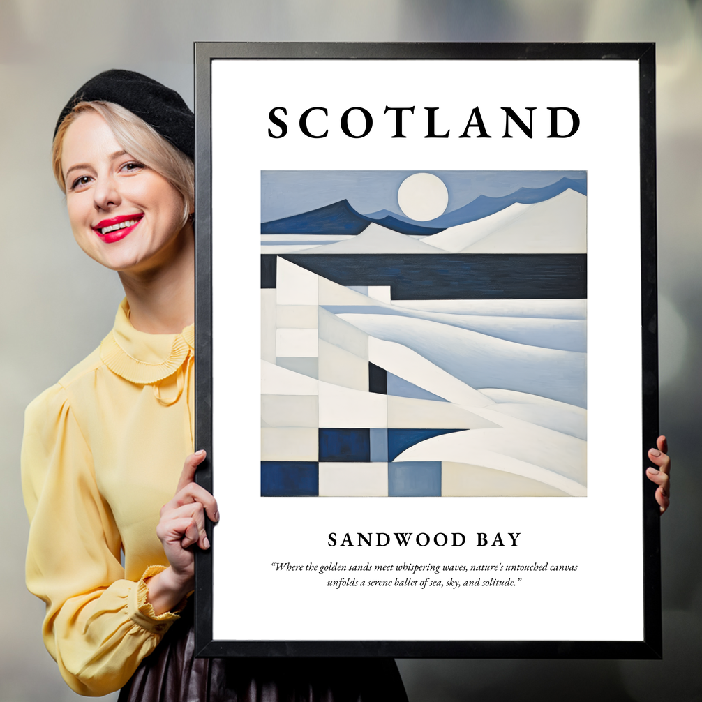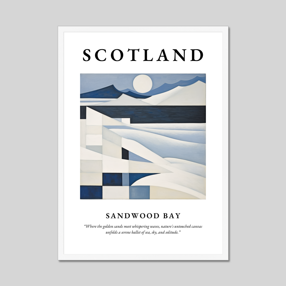 The poster features the word “SCOTLAND” in bold letters, drawing immediate attention and stirring wanderlust. Beneath it lies a captivating abstract painting of Sandwood Bay. Through a symphony of geometric forms and soothing blue and white hues, the artwork envisions the bay’s sweeping shores and serene landscape. Below the painting, the evocative quote, “Where the golden sands meet whispering waves, nature's untouched canvas unfolds a serene ballet of sea, sky, and solitude,” captures the essence of this coastal gem.