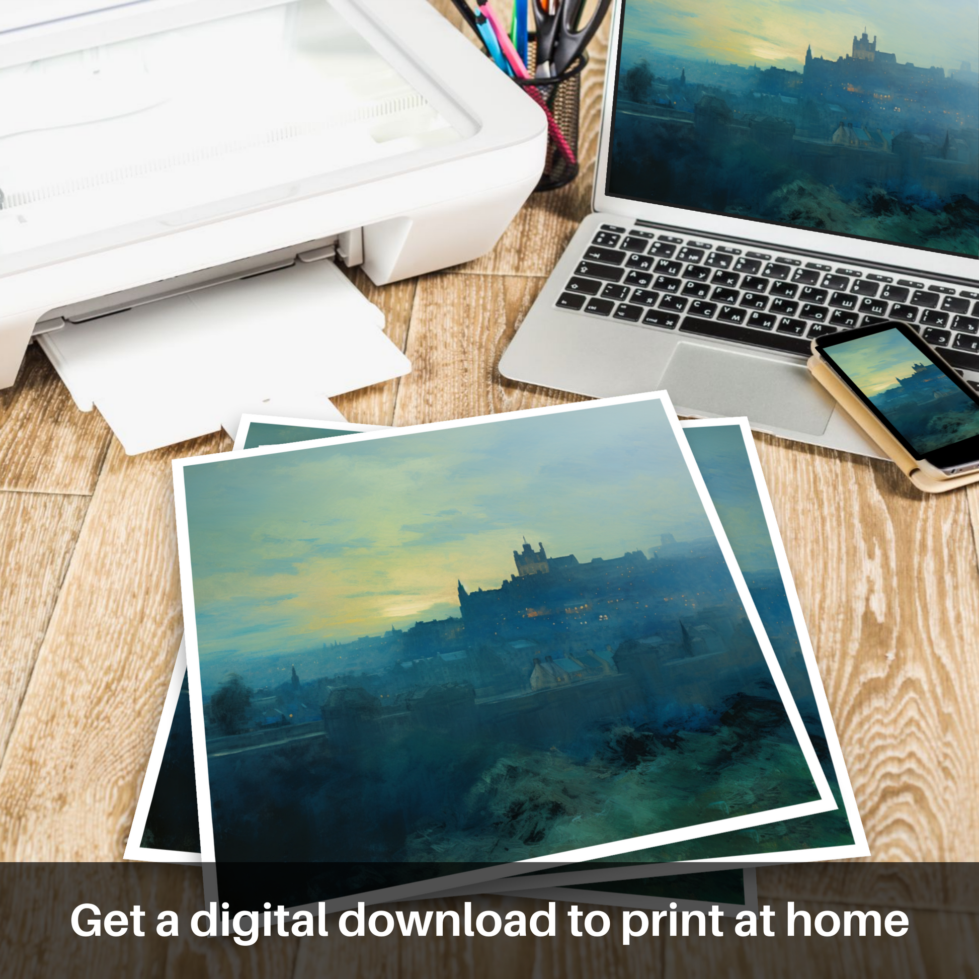Captured within the soft embrace of dusk, this evocative impressionist print beckons viewers to the winding streets and historic skyline of Edinburgh, the venerated capital of Scotland. Bathed in a gentle light that seems to dance across the canvas, the city's architecture rises from the cobalt blue shadows with a warmth that glows with the amber of streetlamps and household fires.