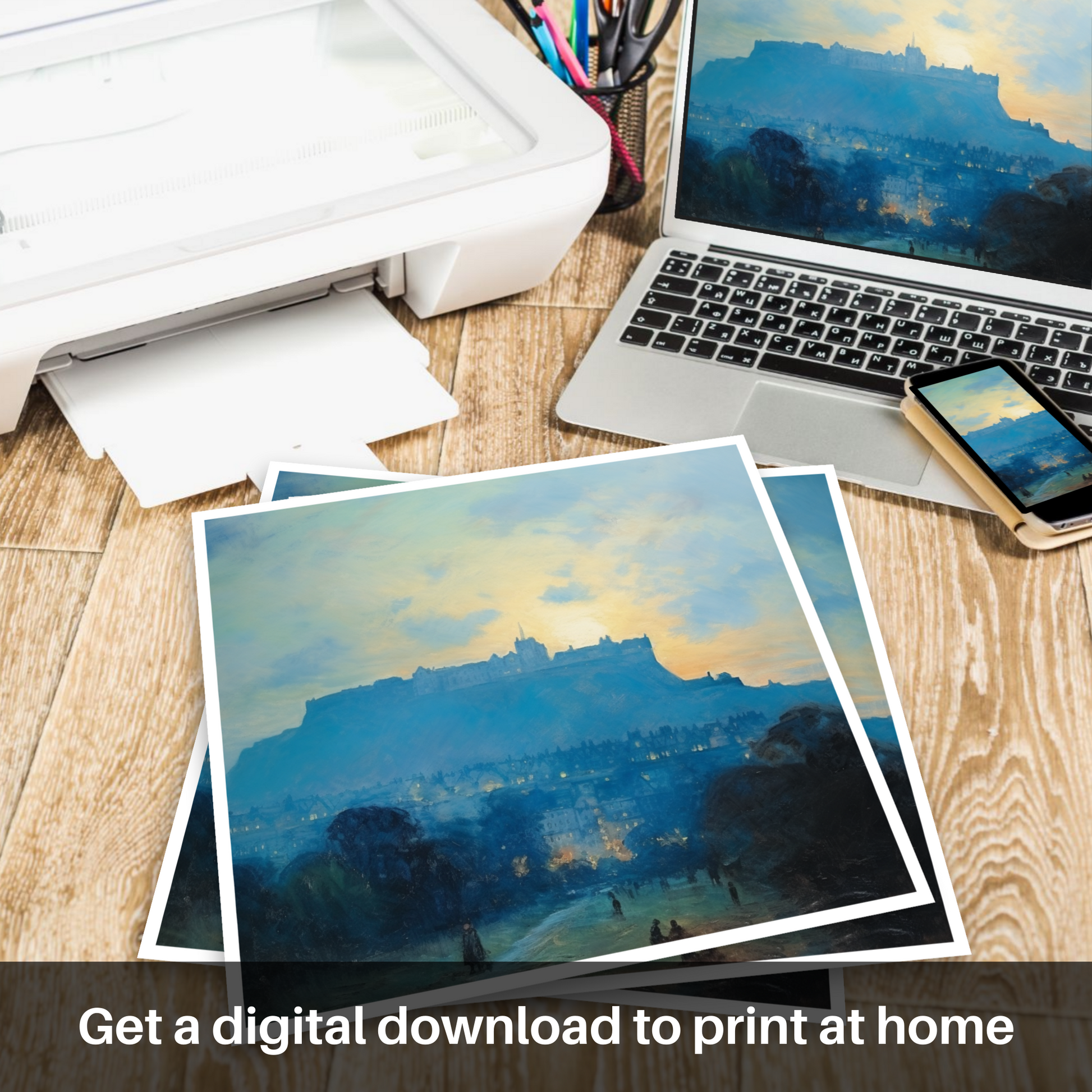 This print invites you to experience the romantic allure of Scotland's capital city, offering a timeless piece of art that will evoke memories or dreams of strolling through Edinburgh as day transitions into night.