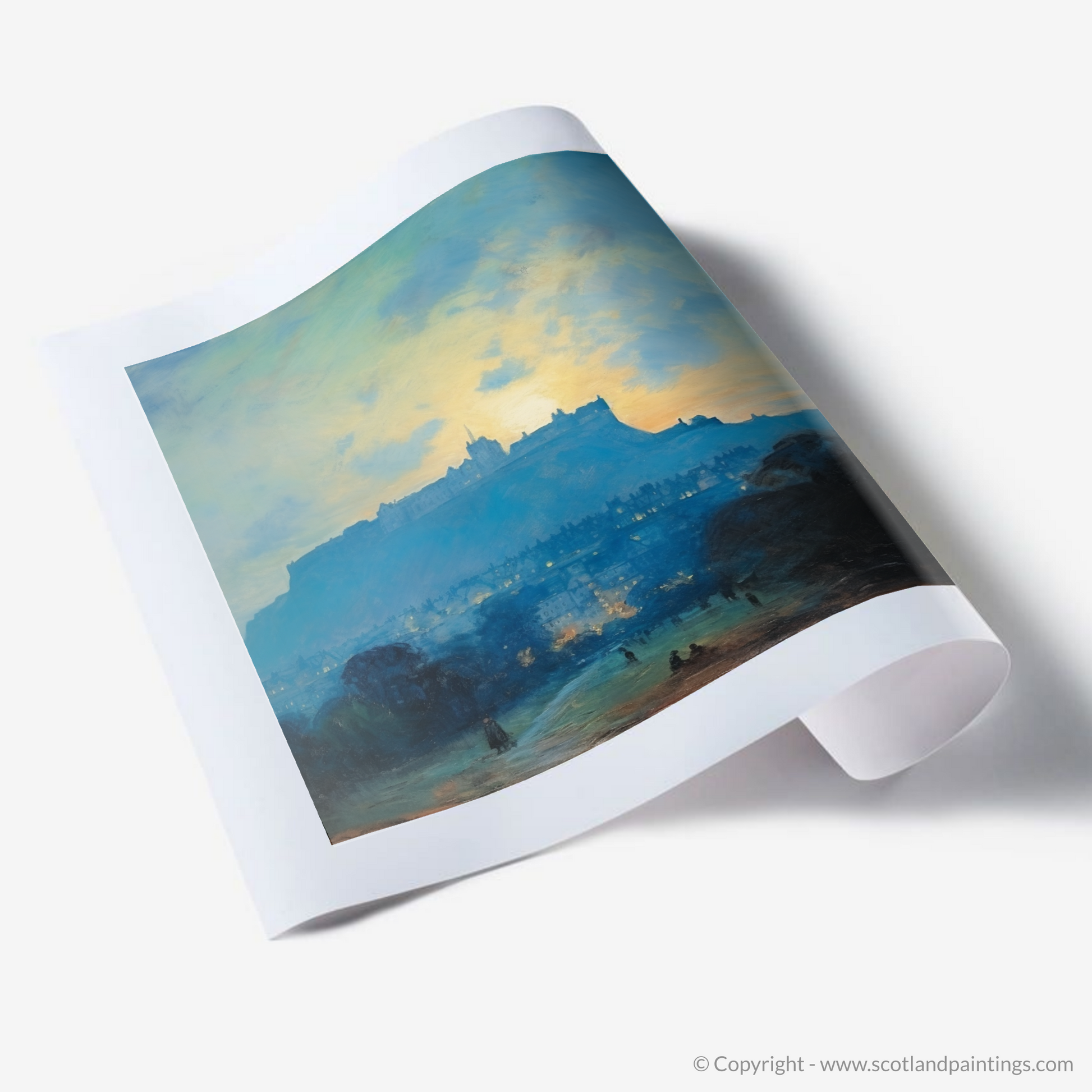 Immerse yourself in the ethereal beauty of Edinburgh's historic skyline with this captivating print, a jewel in our 'Scottish Cities' collection. Bathed in the soft, warm glow of a setting sun, the artwork masterfully captures the majesty of Edinburgh Castle perched atop its rocky crag. The iconic silhouette of the castle looms in a deep blue, creating a stark contrast against the amber hues of the twilight sky.