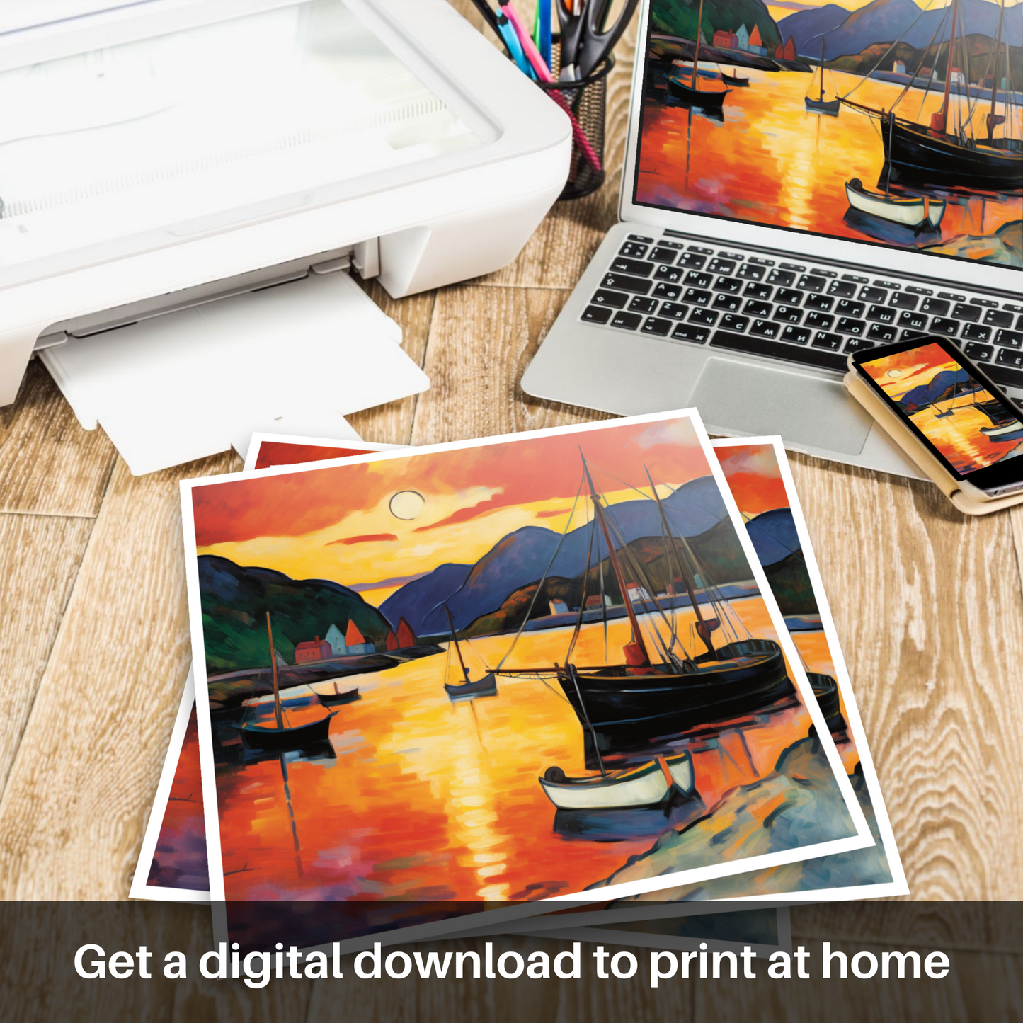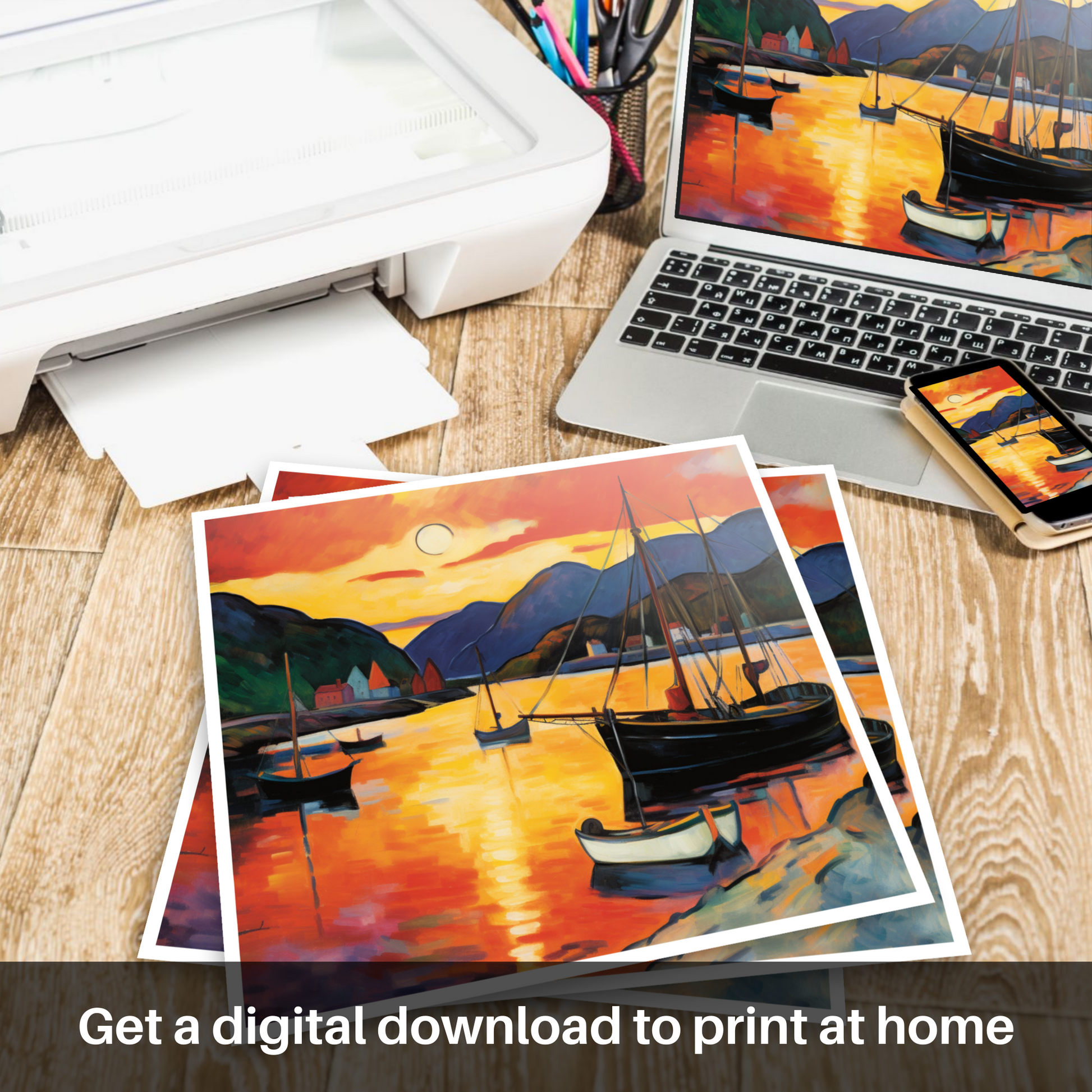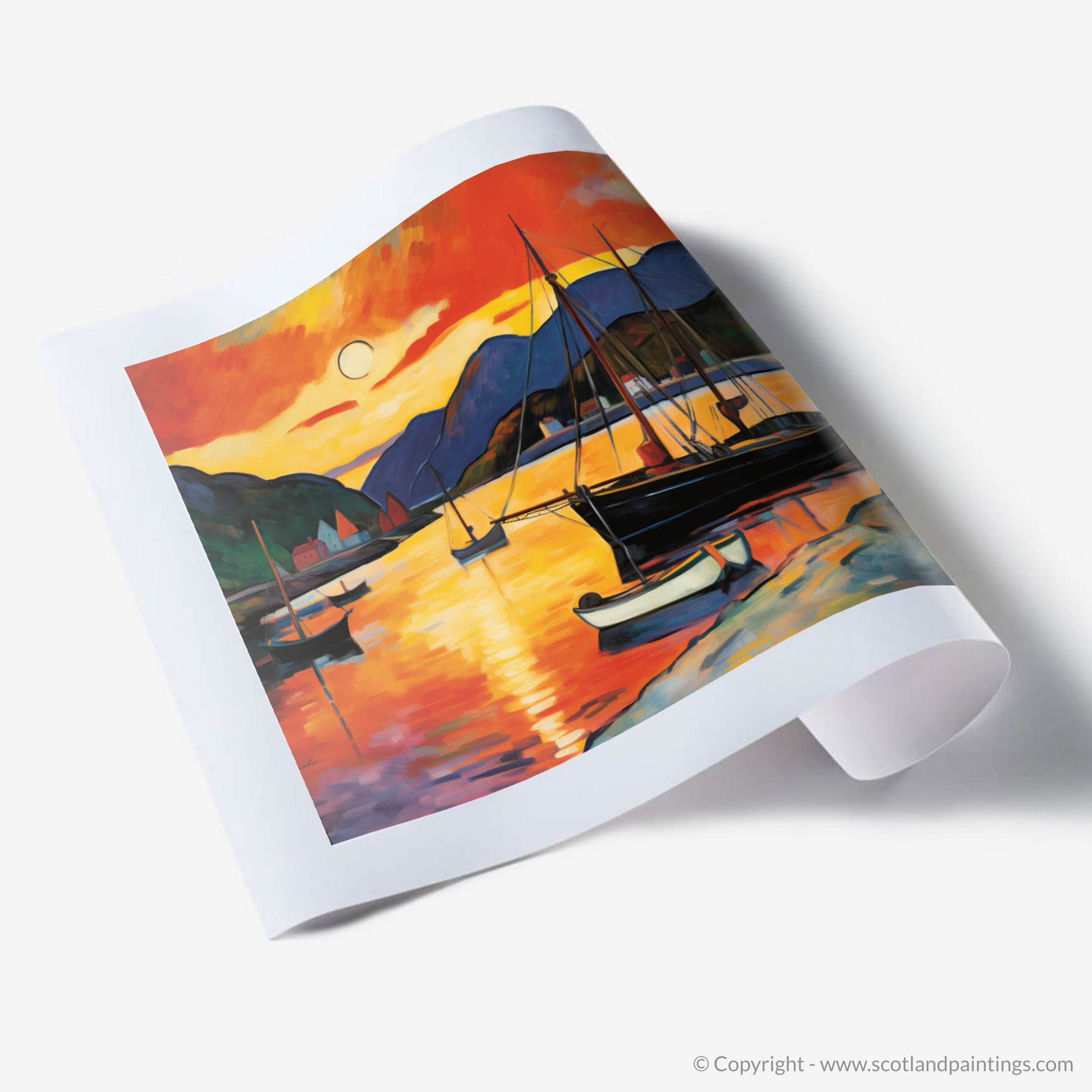 Immerse yourself in a vibrant, dream-like vista of Craobh Haven Harbour with this exquisitely lively Fauvist-inspired print. Capturing the harbour at its most enchanting hour, the artwork bathes in the iridescent glow of the golden hour, when the sun begins to dip and the sky spectacle begins.