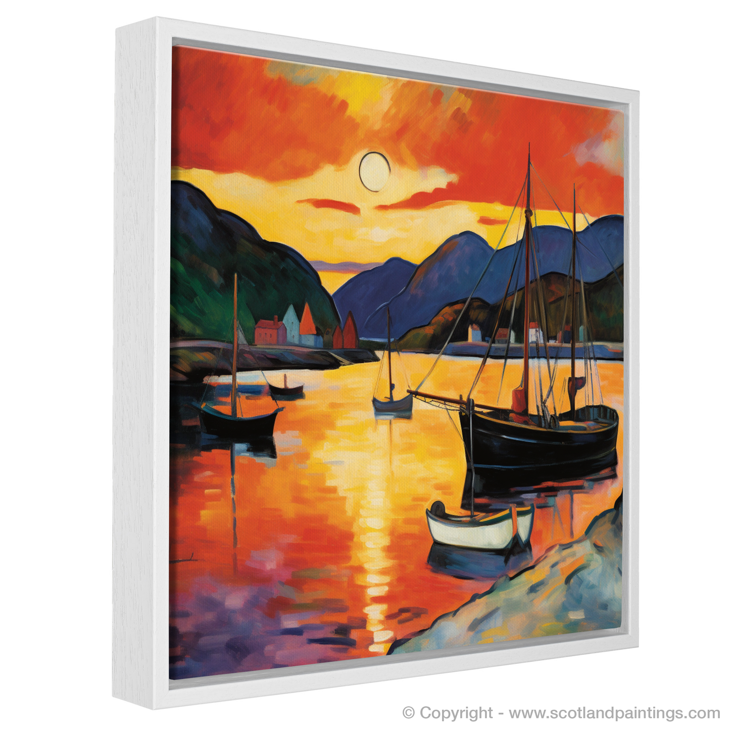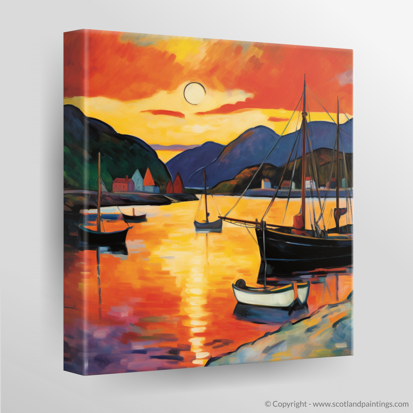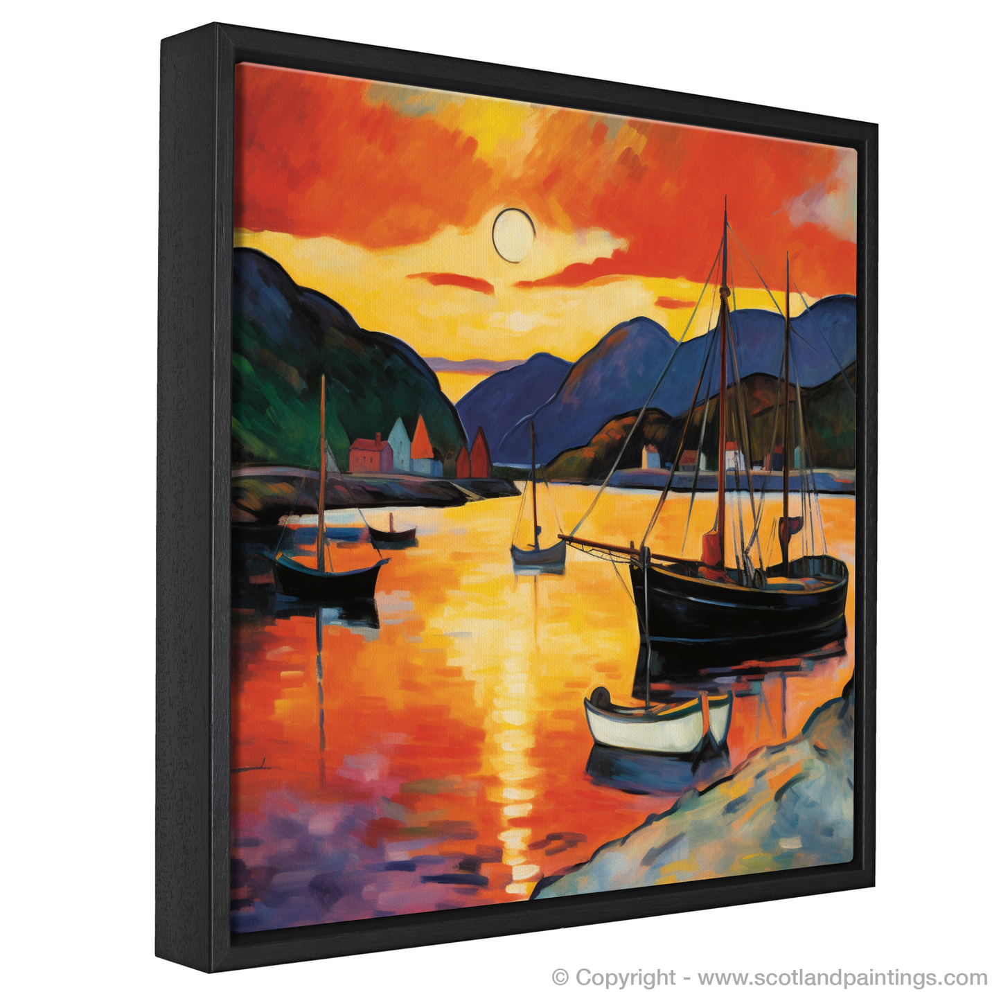 Immerse yourself in a vibrant, dream-like vista of Craobh Haven Harbour with this exquisitely lively Fauvist-inspired print. Capturing the harbour at its most enchanting hour, the artwork bathes in the iridescent glow of the golden hour, when the sun begins to dip and the sky spectacle begins.