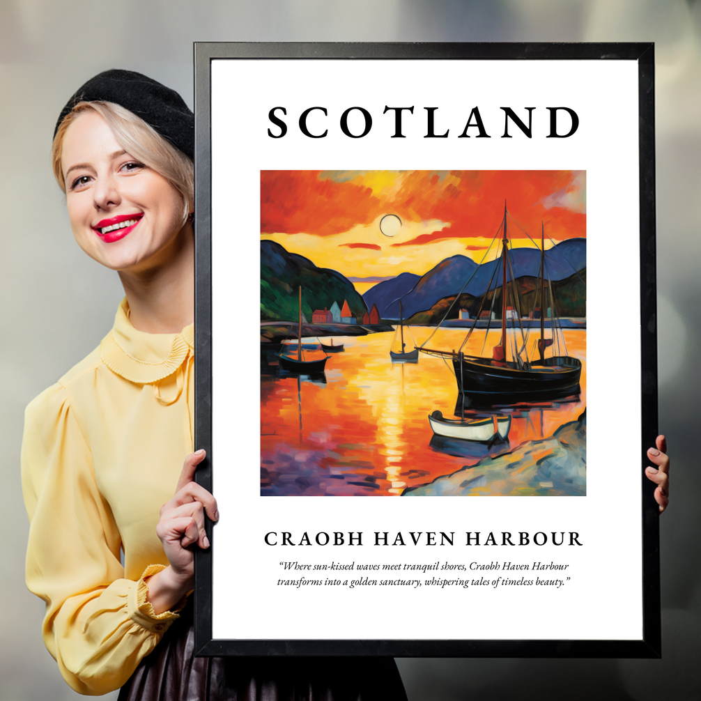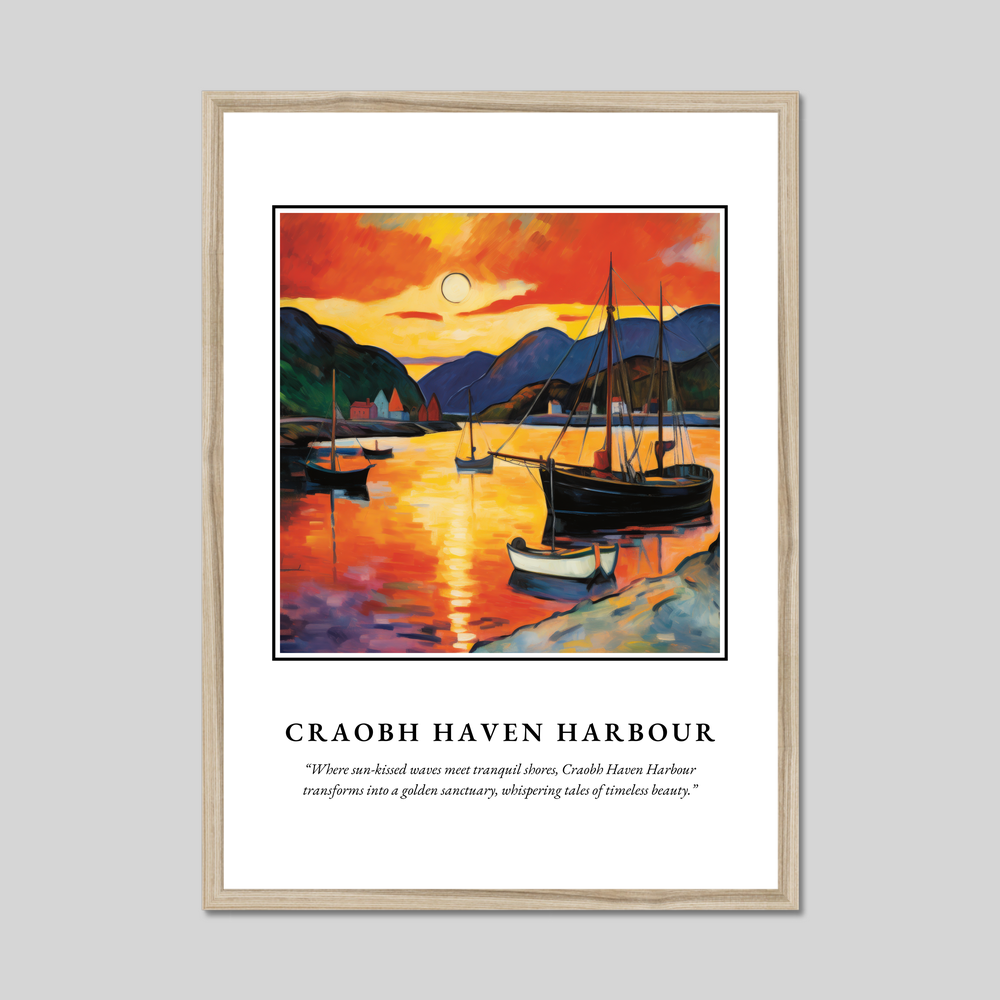At the heart of this piece is a Fauvist-style painting of Craobh Haven Harbour, a breathtaking scene where bold colours dance across the canvas. The harbour is depicted in rich, expressive hues, capturing the vivid oranges and deep blues of a sun setting over a serene Scottish coastline. Majestic boats rest gently on golden waters, reflecting the fiery sky, while the surrounding hills cast a tranquil silhouette — a perfect representation of timeless beauty.
