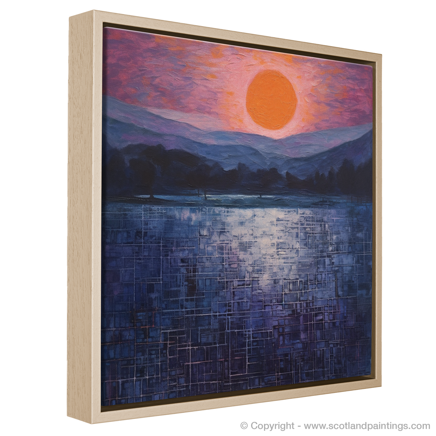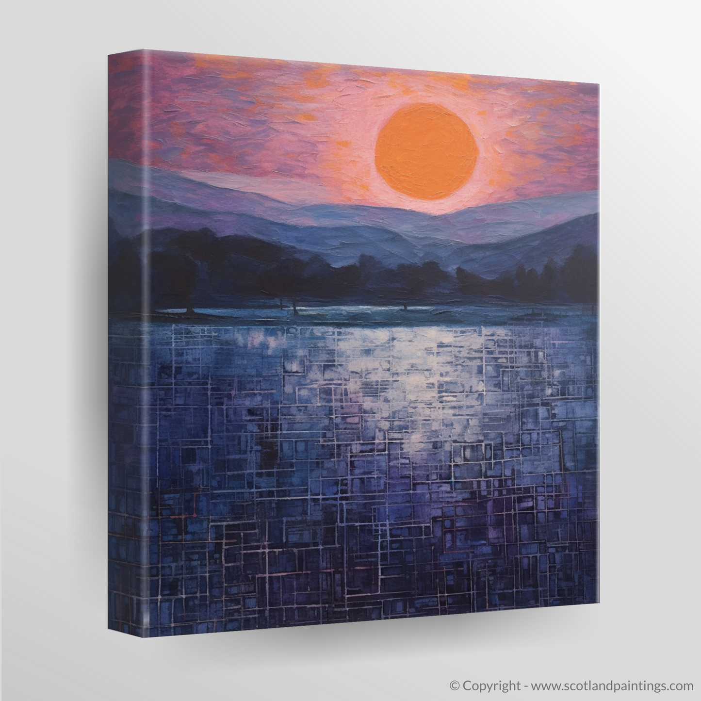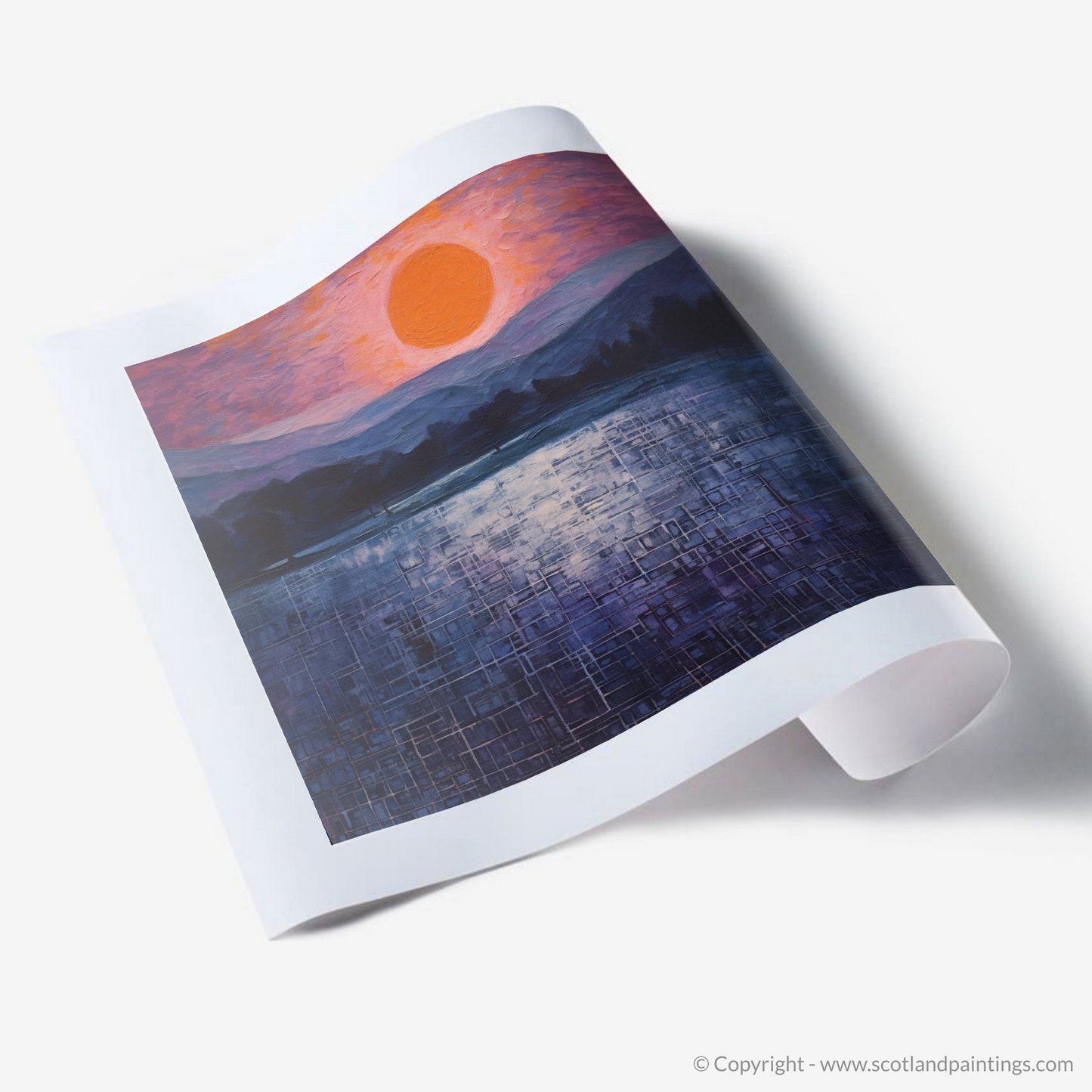 Deep blues and purples dominate the lower half of the composition, conjuring the mysterious depths of the loch. Here, an intricate geometric grid evokes the rippling water surface, alive with the play of light and shadow as the day surrenders to the evening. The textured, varied brushstrokes impart a palpable sense of movement, as if the viewer were witnessing the undulating rhythms of the cove's waters.