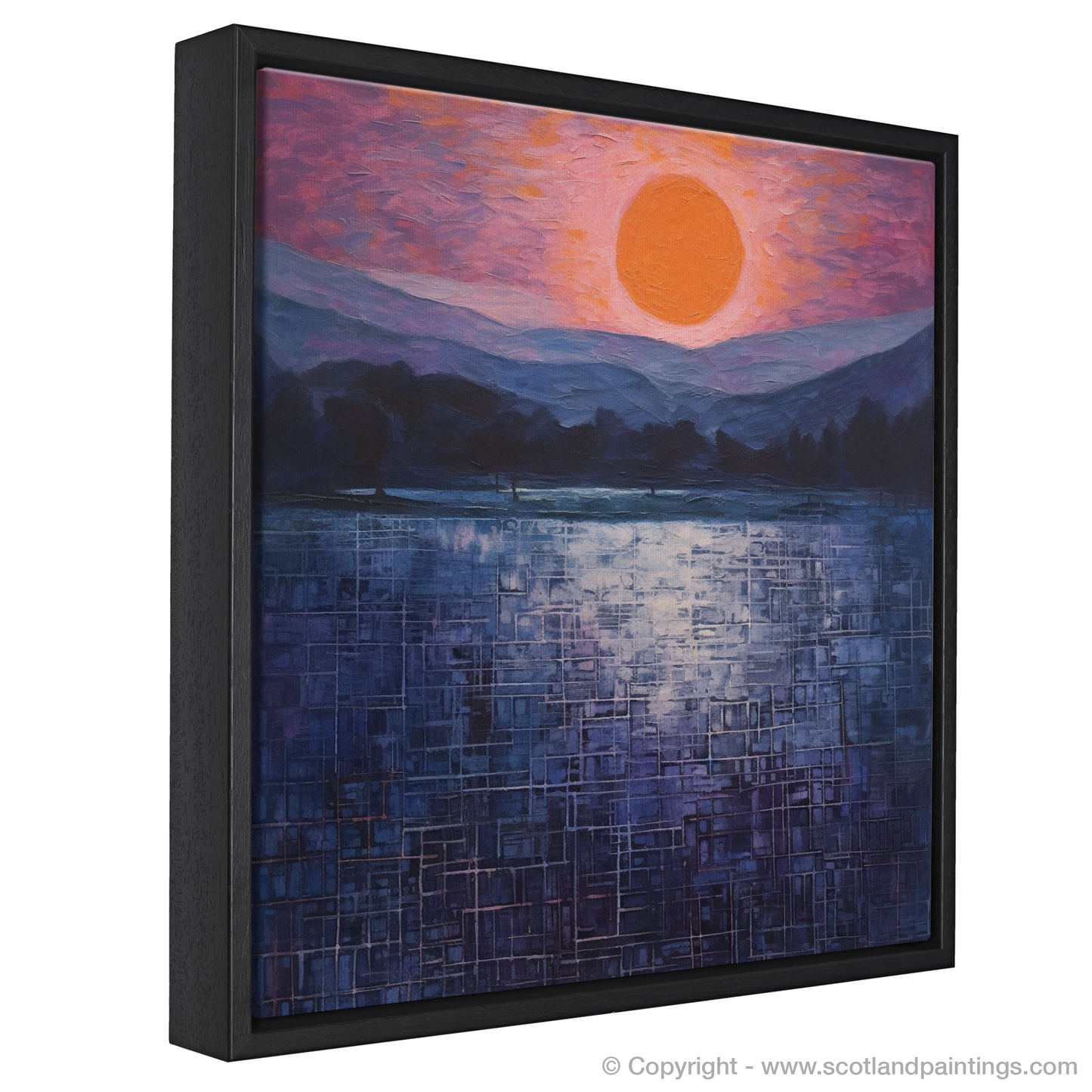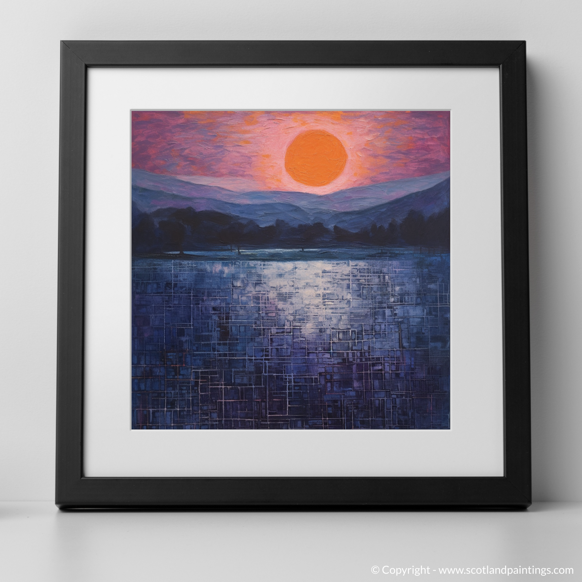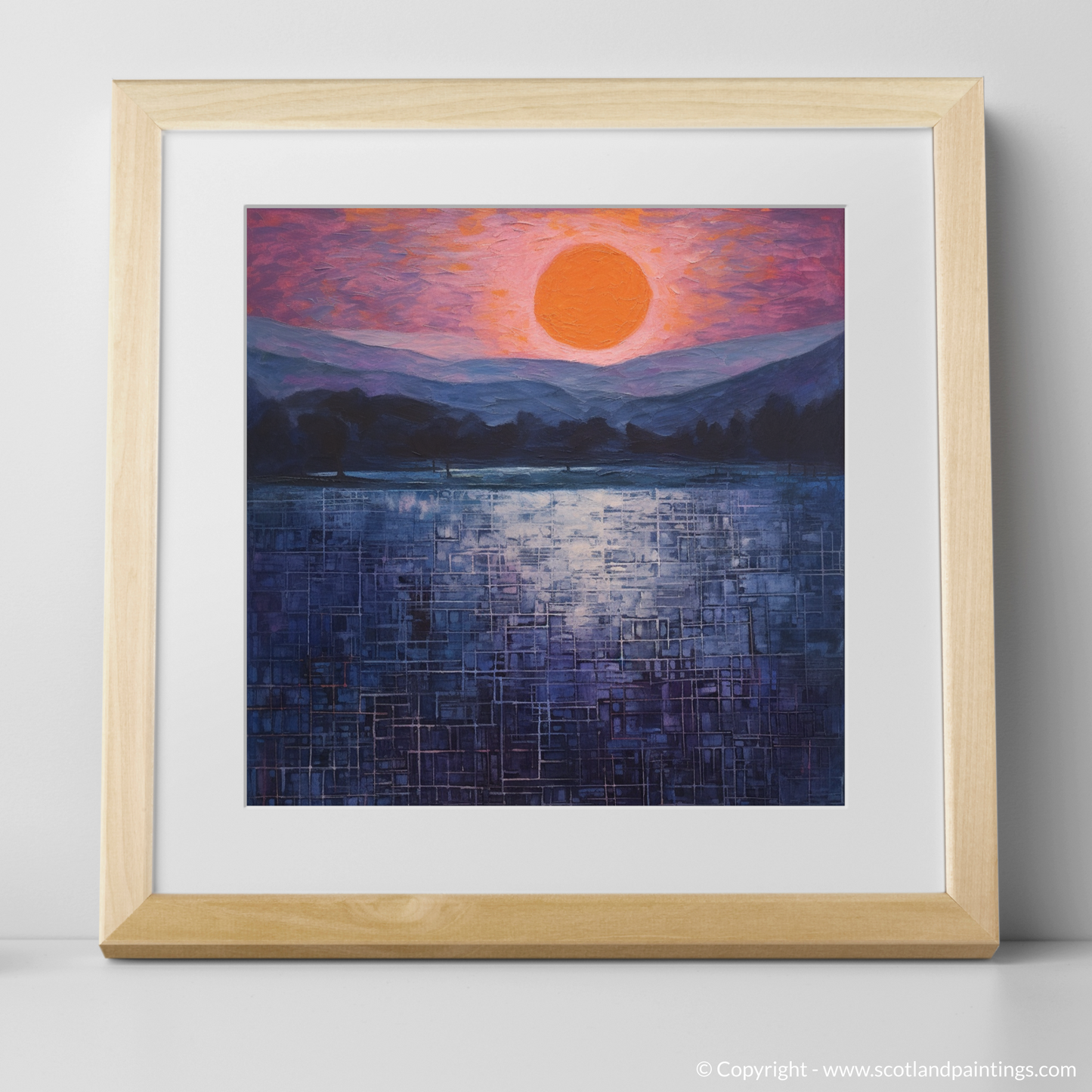 Deep blues and purples dominate the lower half of the composition, conjuring the mysterious depths of the loch. Here, an intricate geometric grid evokes the rippling water surface, alive with the play of light and shadow as the day surrenders to the evening. The textured, varied brushstrokes impart a palpable sense of movement, as if the viewer were witnessing the undulating rhythms of the cove's waters.