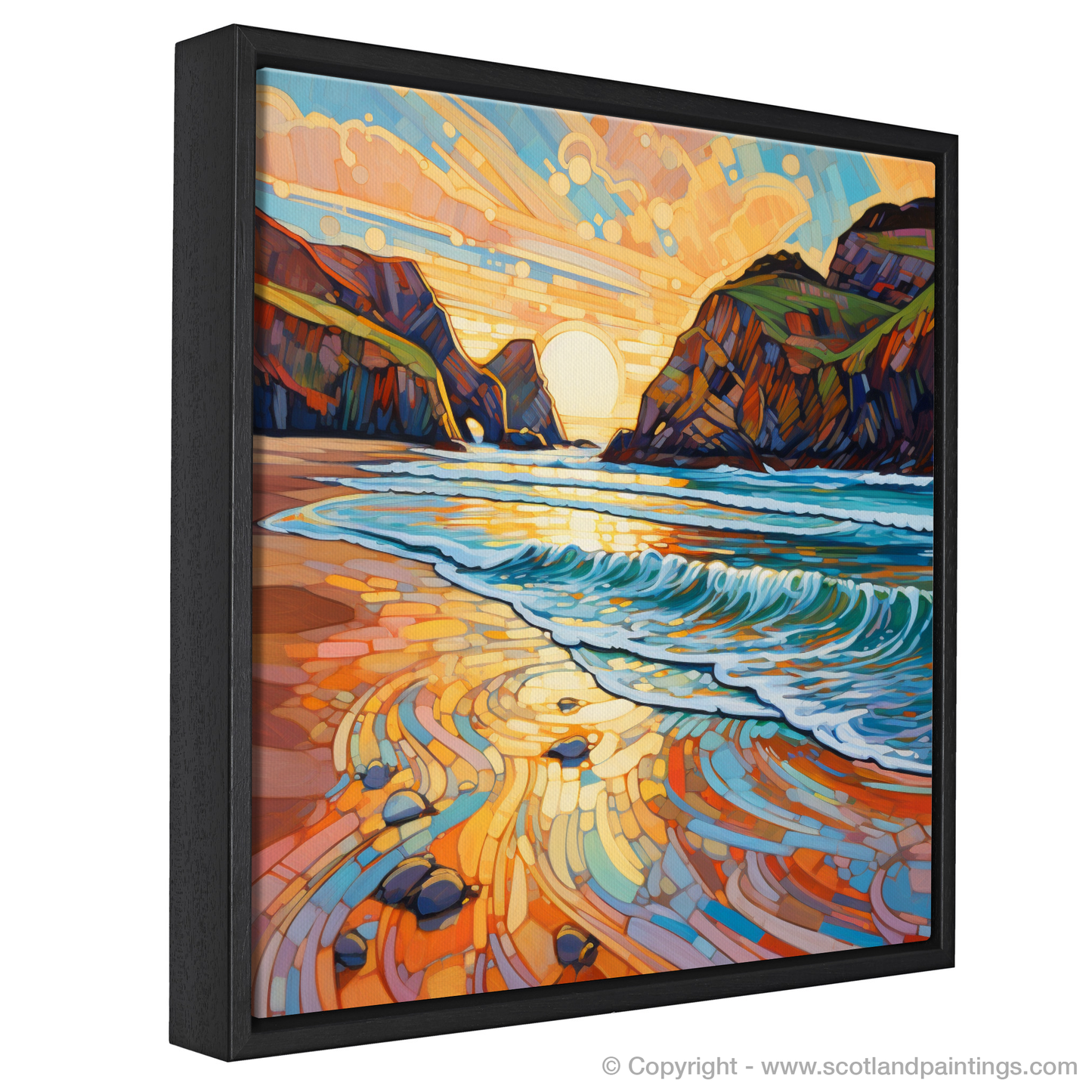 The print brings to life the serene beauty of the Scottish coast with a swirl of painterly brushstrokes, each vivid line and curve contributing to a dynamic yet tranquil depiction of this beloved landscape. The undulating waves, with crests touched by light, appear to dance in synchrony with the rhythm of the sea, while the sun hangs low on the horizon, a glowing orb that promises the end of a day and the arrival of dusk.