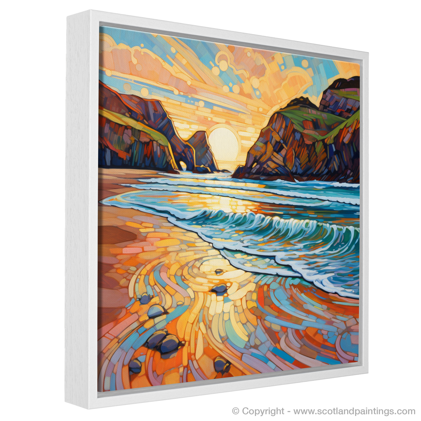 As the day wanes to a close, a symphony of colours washes over Sandwood Bay, captured meticulously through the lens of 'Modern Impressionism' in this exquisite print. The scene is bathed in the rich, warm glow of the golden hour, casting a harmonious blend of amber, gold, and fiery oranges across the sky, reflected in the gentle ebb and flow of the tides below.