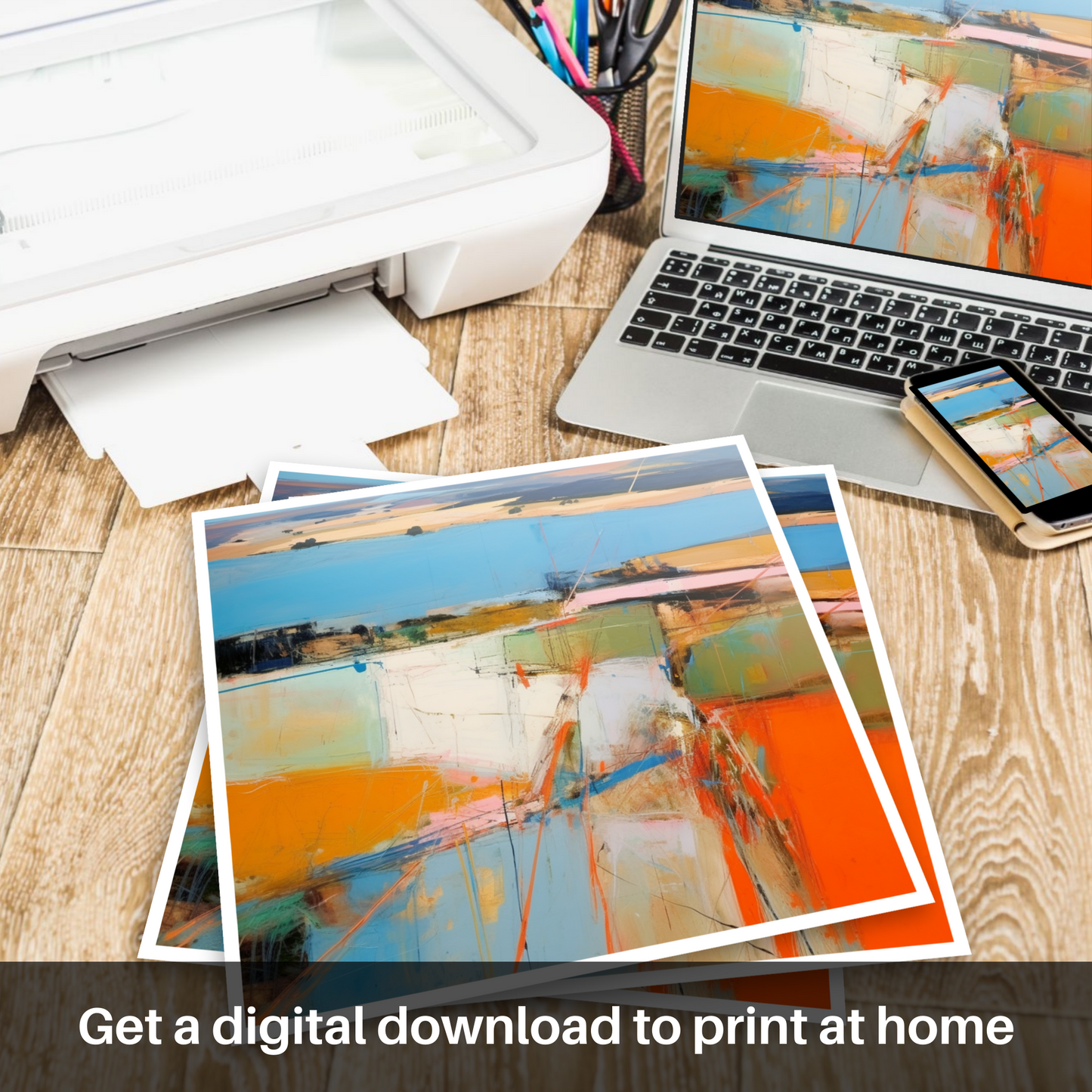 Embark on a visual journey through the ethereal essence of Loch Leven with this exquisite abstract impressionist print. Evoking the serene beauty of one of Scotland's most picturesque lochs, this piece captivates with a mélange of vibrant hues that seem to dance in harmonious chaos across the canvas. Broad swathes of azure and cobalt blue hint at the expansive sky and reflective waters, while earthy tones of sienna, ochre, and umbers whisper tales of the surrounding rugged landscapes.
